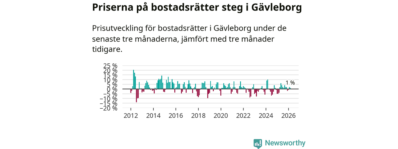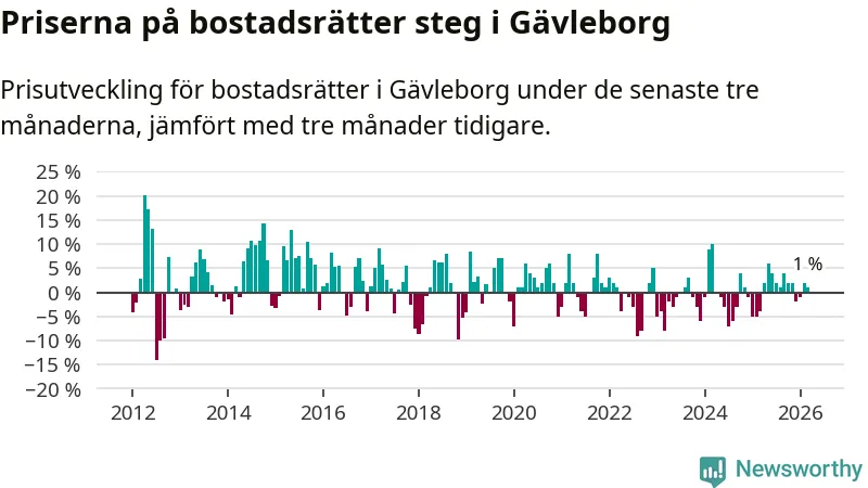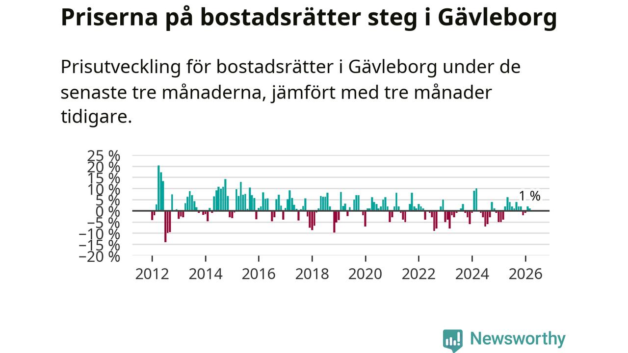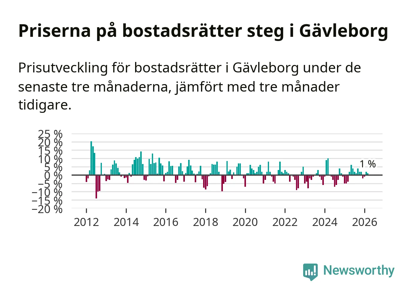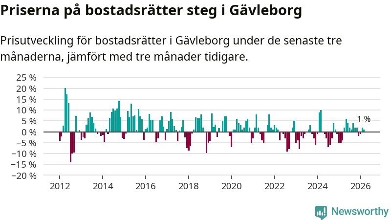 På grund av få försäljningar saknas uppgifter om prisförändringar för bostadsrätter i sju av länets tio kommuner. Bland de tre vi har uppgifter om stiger priserna i samtliga.I Gävleborgs län som helhet går priserna på bostadsrätter upp med 1 procent. Även i hela Sverige ökar priserna på bostadsrätter. I hela riket noterades en prisuppgång på 3 procent.