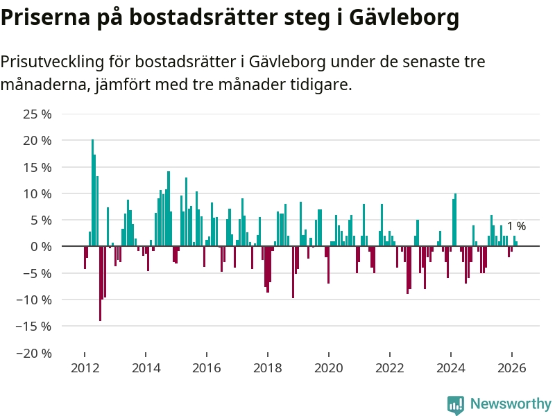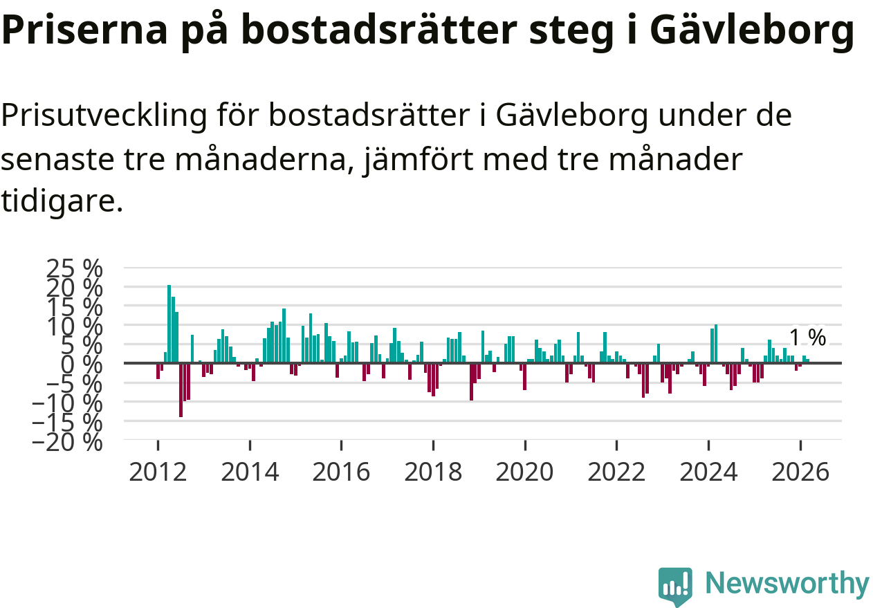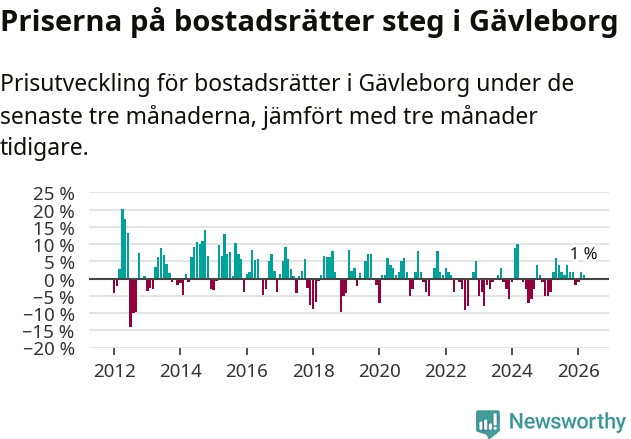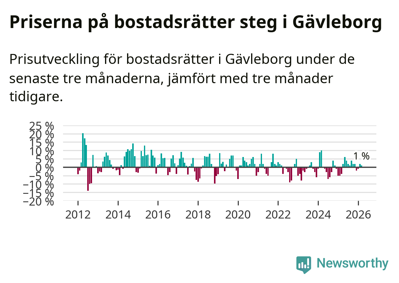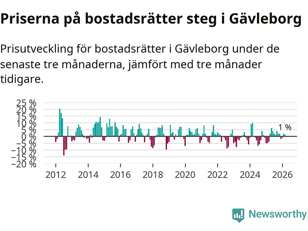 På grund av få försäljningar saknas uppgifter om prisförändringar för bostadsrätter i sju av länets tio kommuner. Bland de tre vi har uppgifter om stiger priserna i samtliga.I Gävleborgs län som helhet går priserna på bostadsrätter upp med 1 procent. Även i hela Sverige ökar priserna på bostadsrätter. I hela riket noterades en prisuppgång på 3 procent.