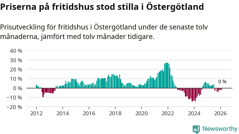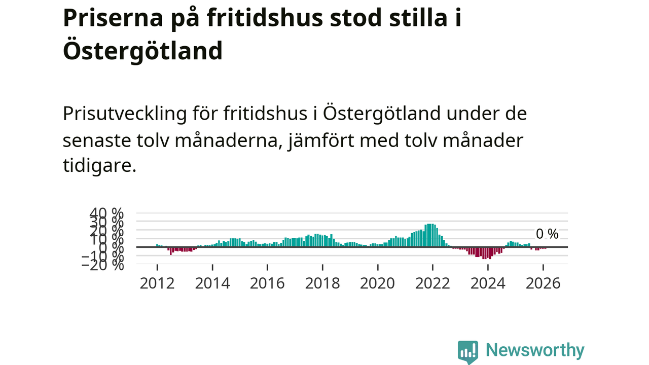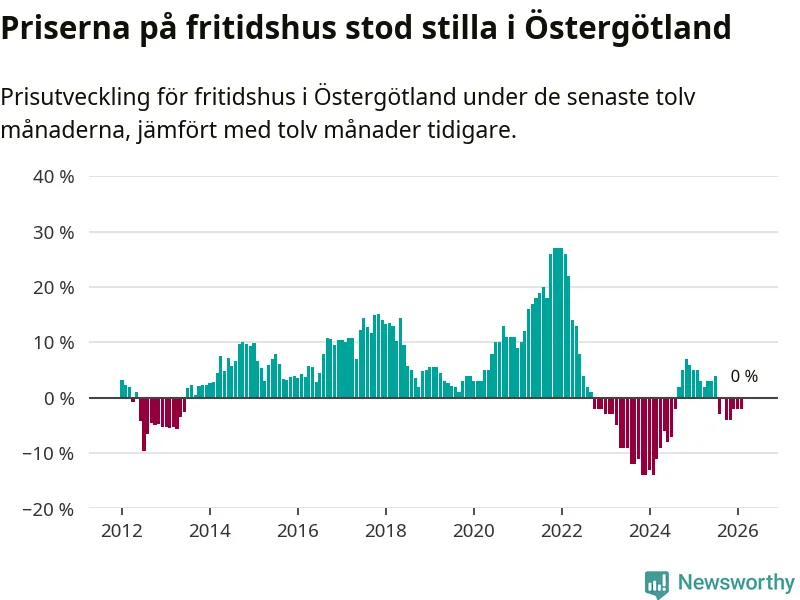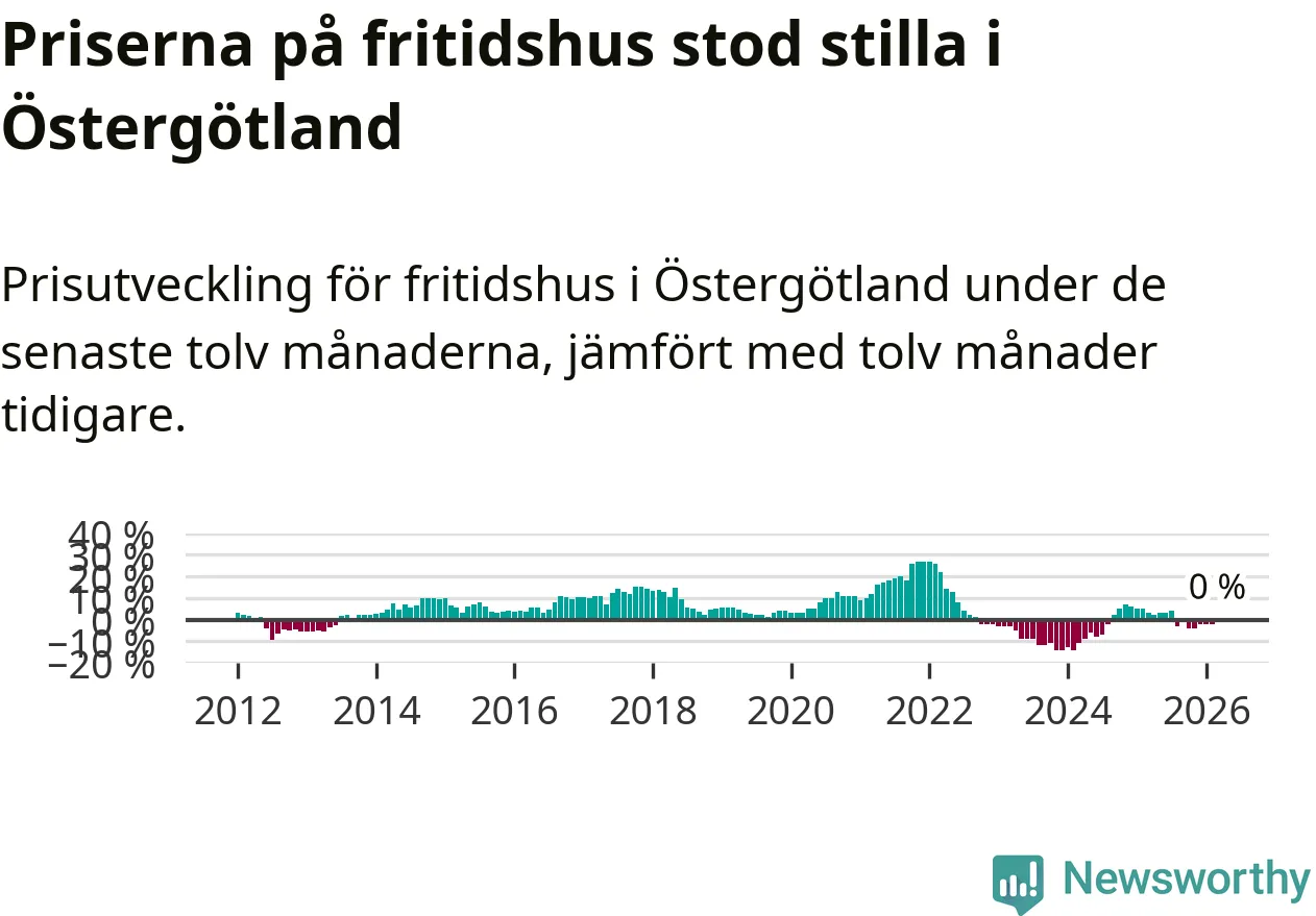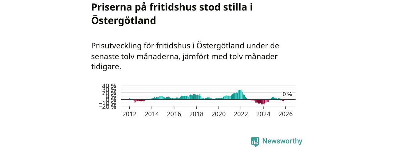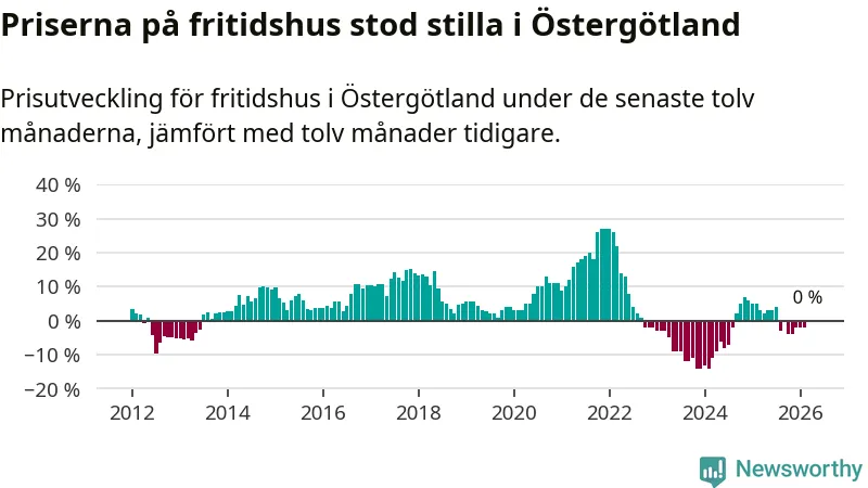 Priserna på fritidshus står i stort sett stilla i Östergötlands län. Medelpriset på de på försäljningarna under de senaste tolv månaderna låg på samma nivå som för ett år sedan.