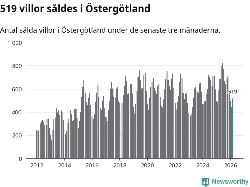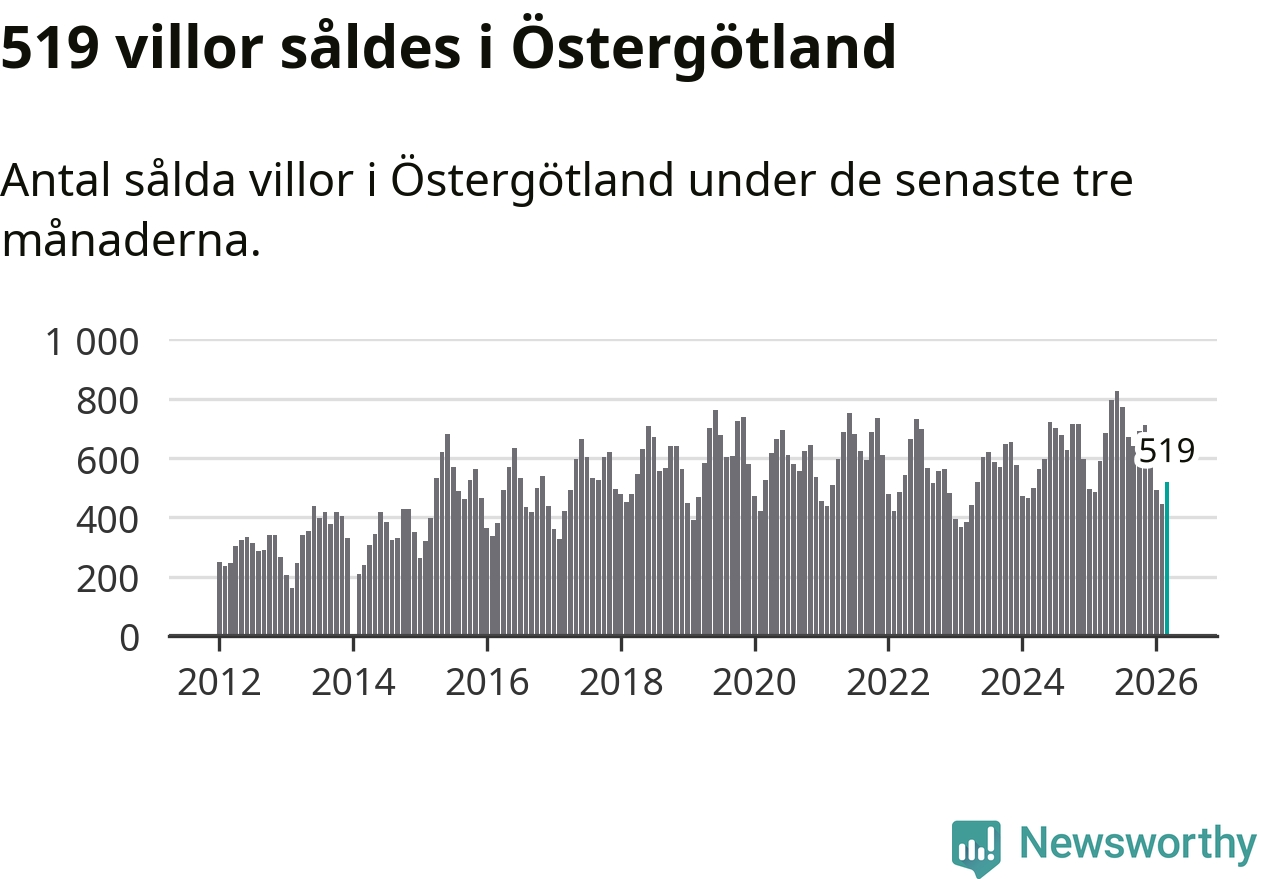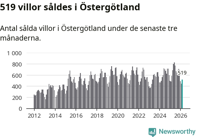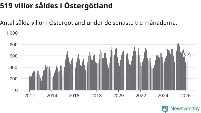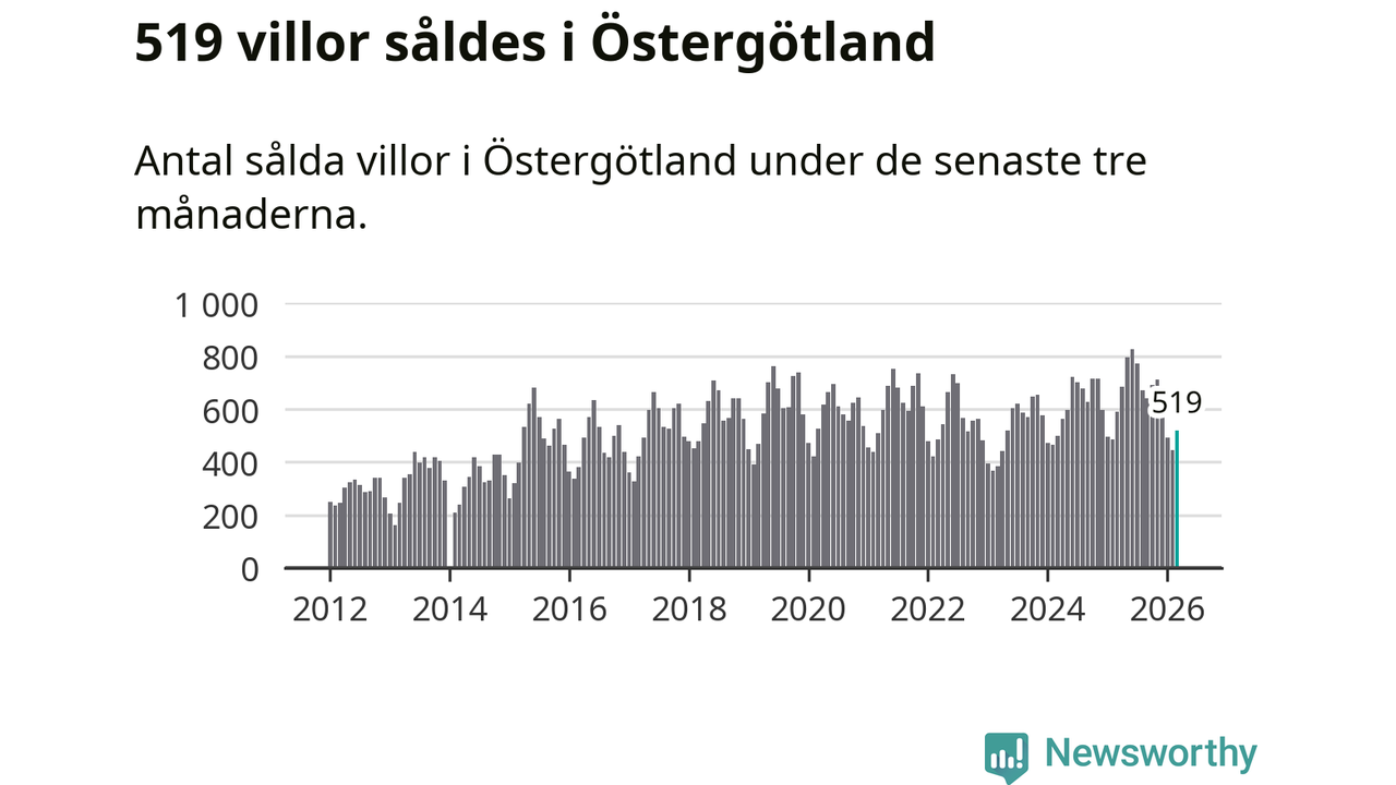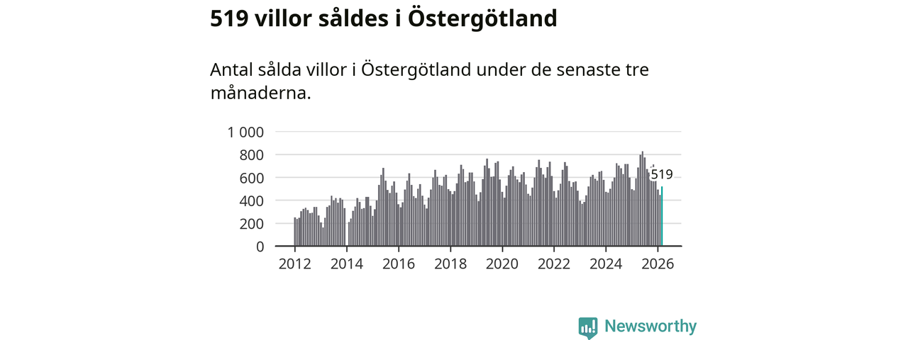 Sammanlagt såldes 519 villor i Östergötlands län mellan januari och mars till ett genomsnittligt pris på 3,5 miljoner kronor. I fjol gjordes 589 affärer vid den här tiden på året.