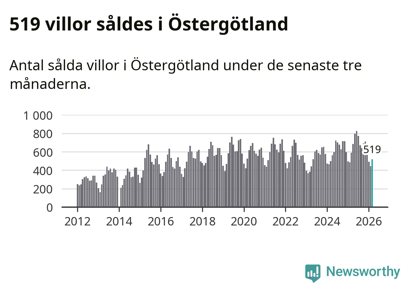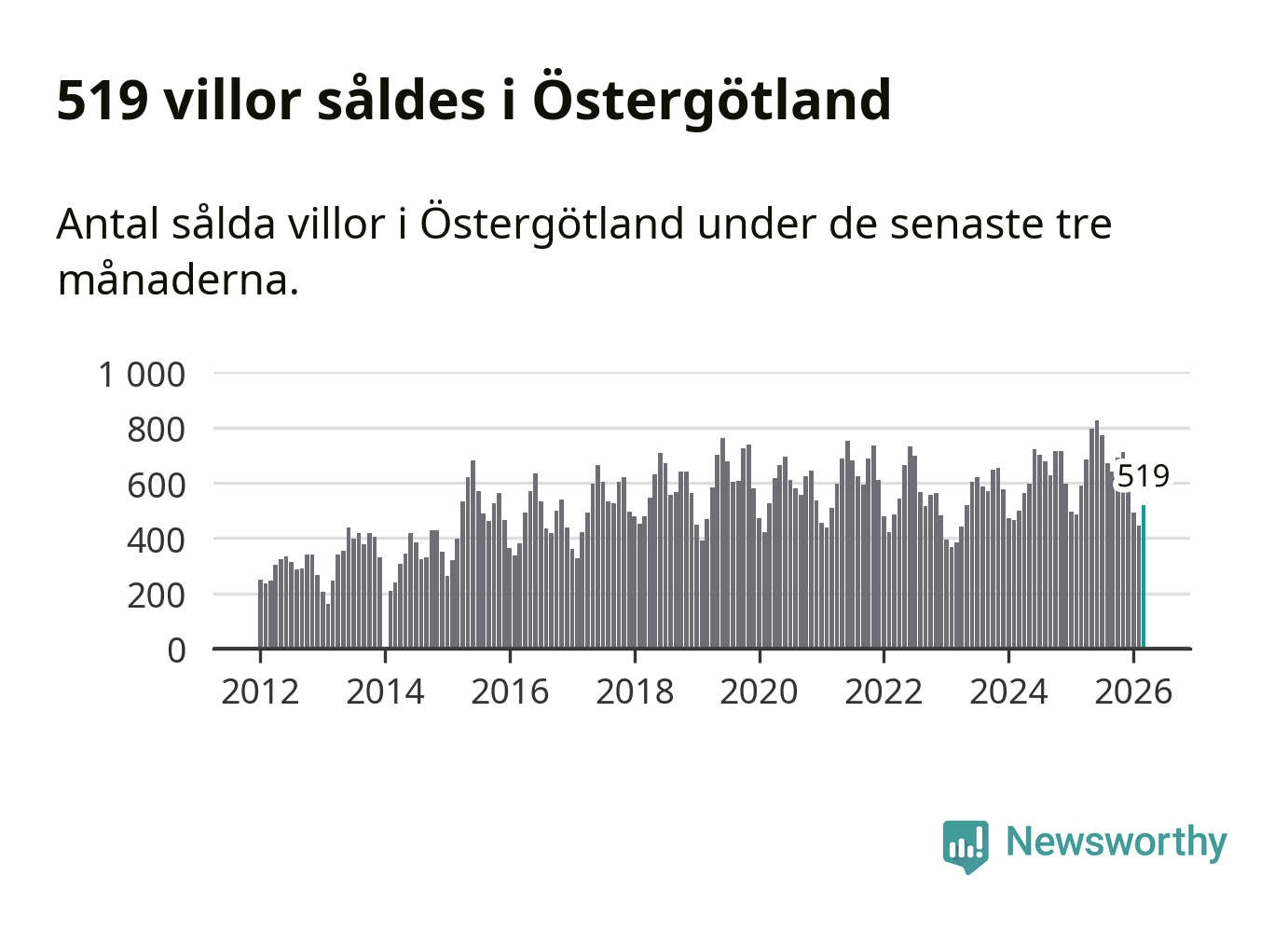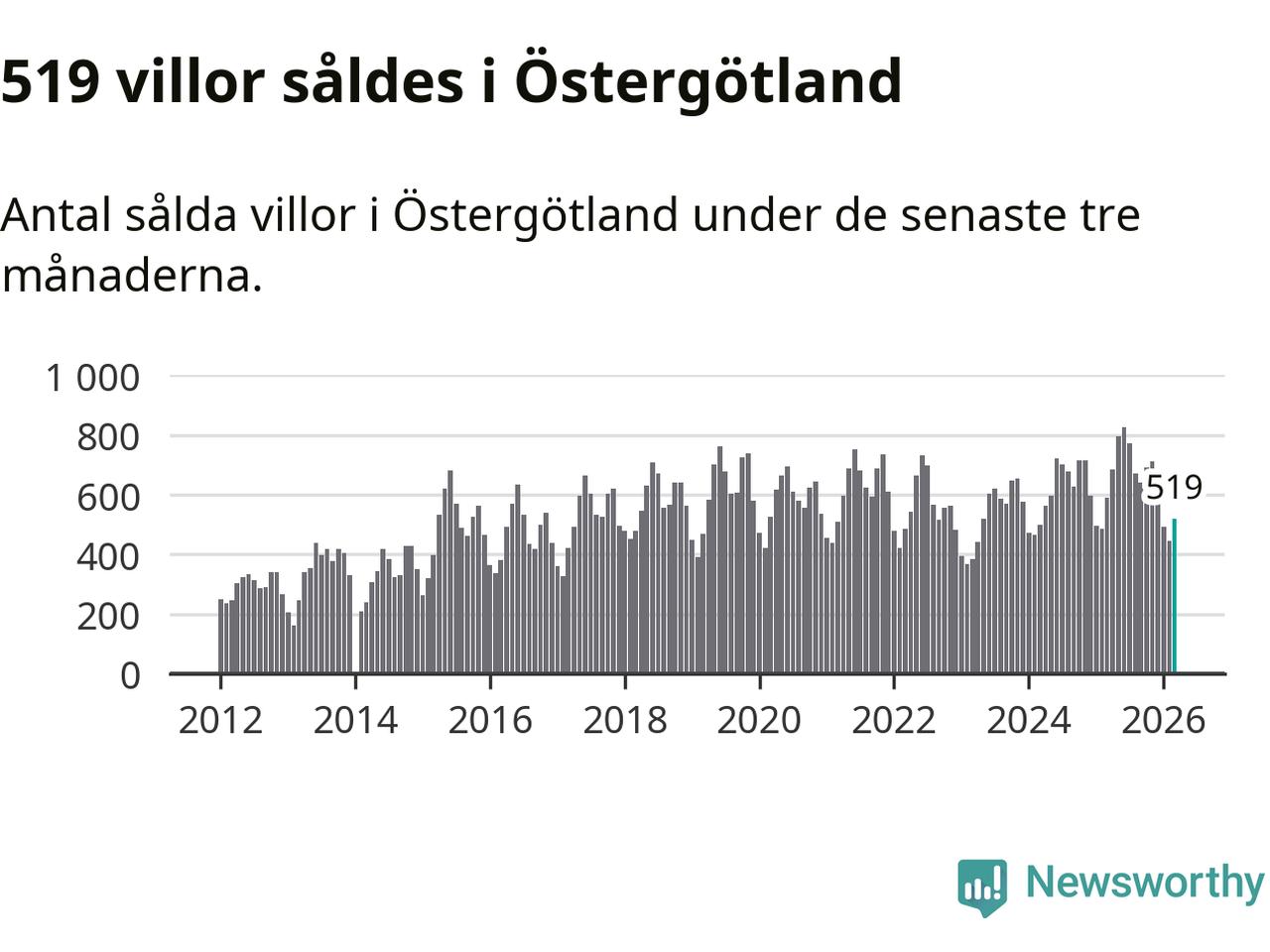 Sammanlagt såldes 519 villor i Östergötlands län mellan januari och mars till ett genomsnittligt pris på 3,5 miljoner kronor. I fjol gjordes 589 affärer vid den här tiden på året.