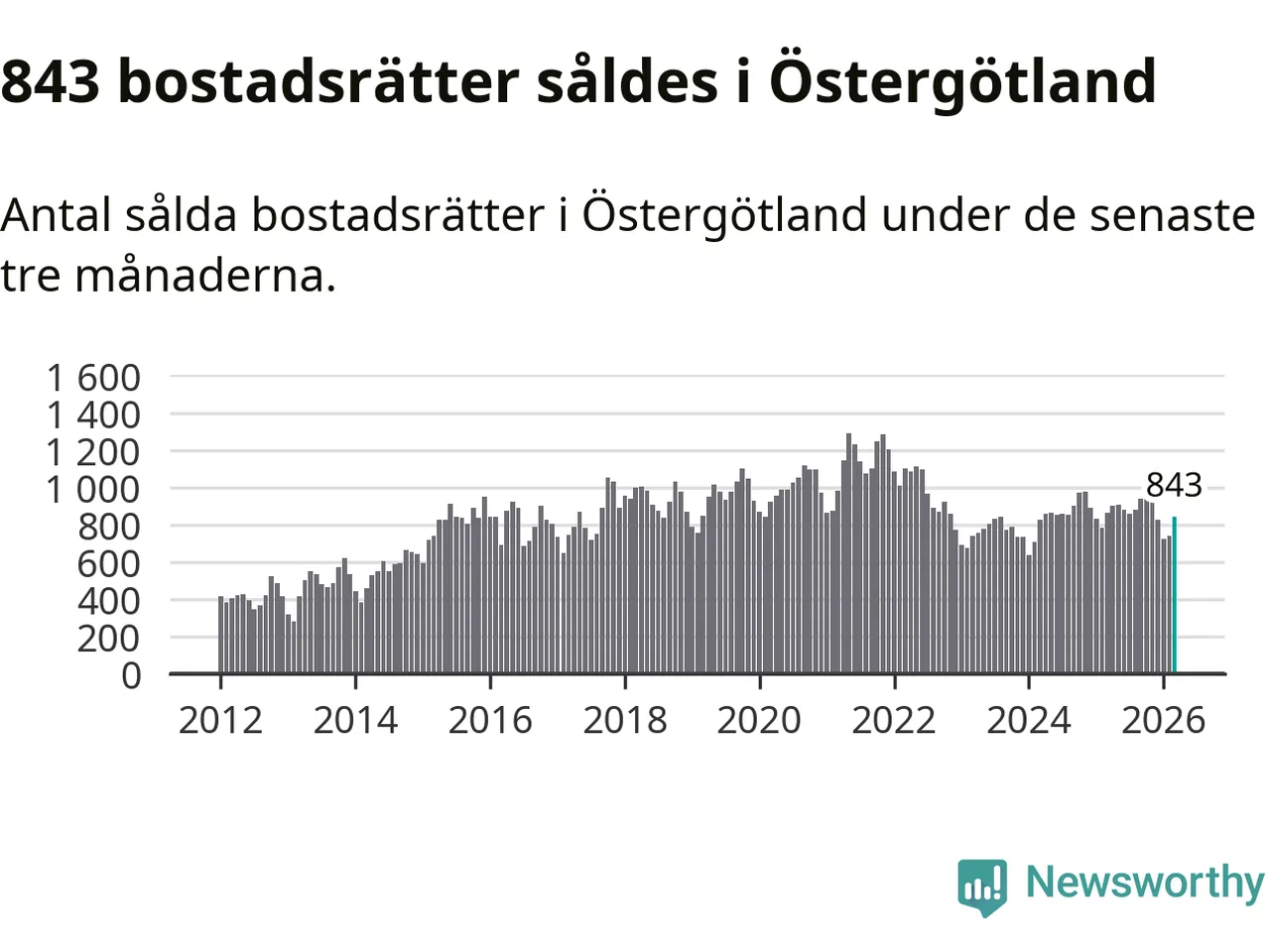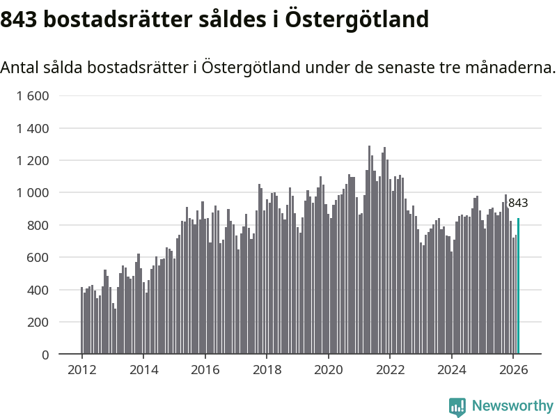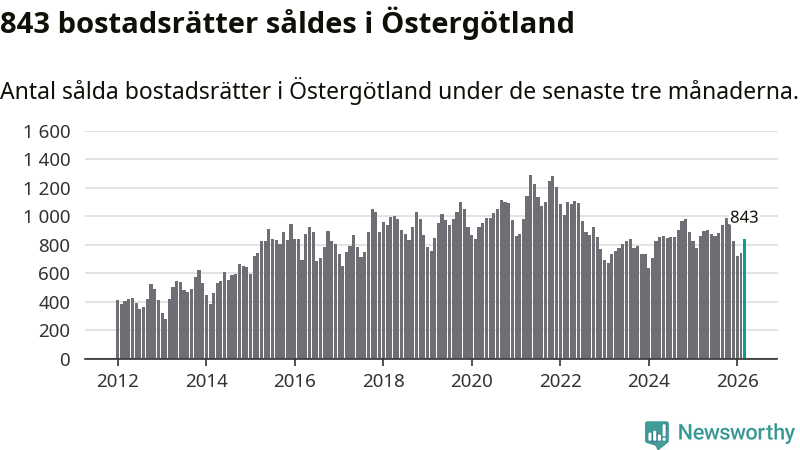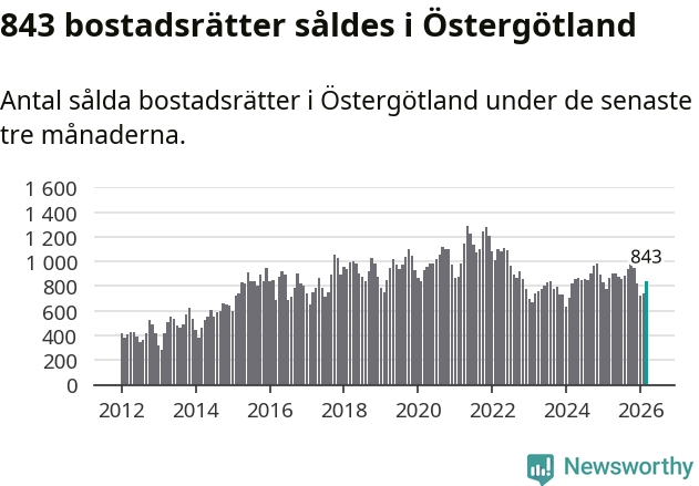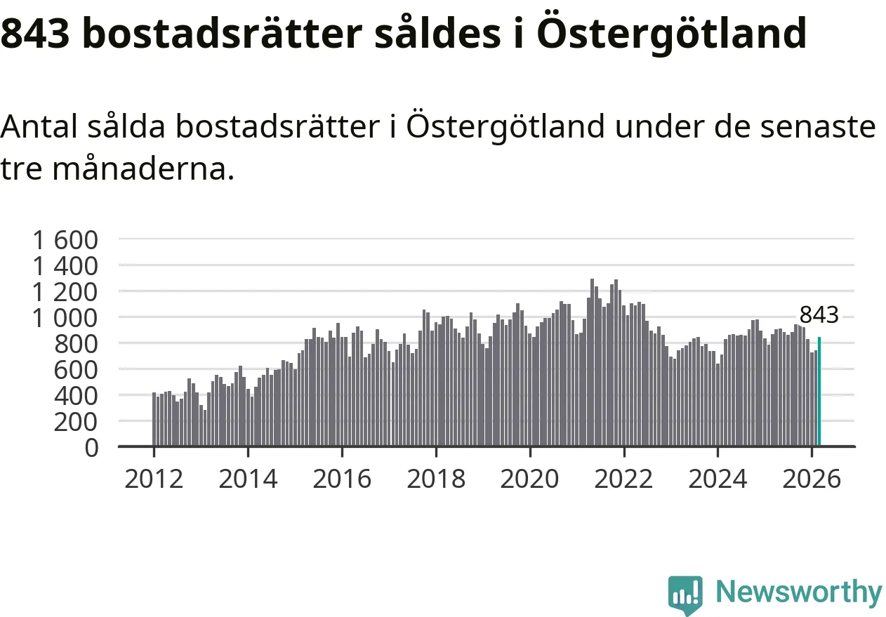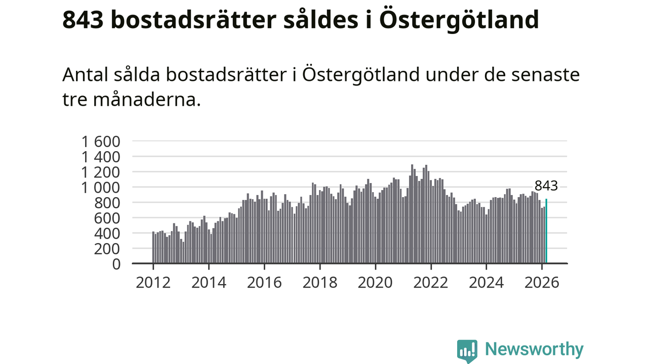 Sammanlagt såldes 843 bostadsrätter i Östergötlands län mellan januari och mars till ett genomsnittligt pris på 1,8 miljoner kronor. I fjol gjordes 865 affärer vid den här tiden på året.