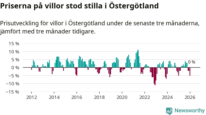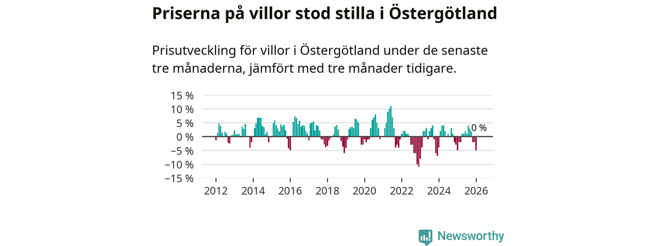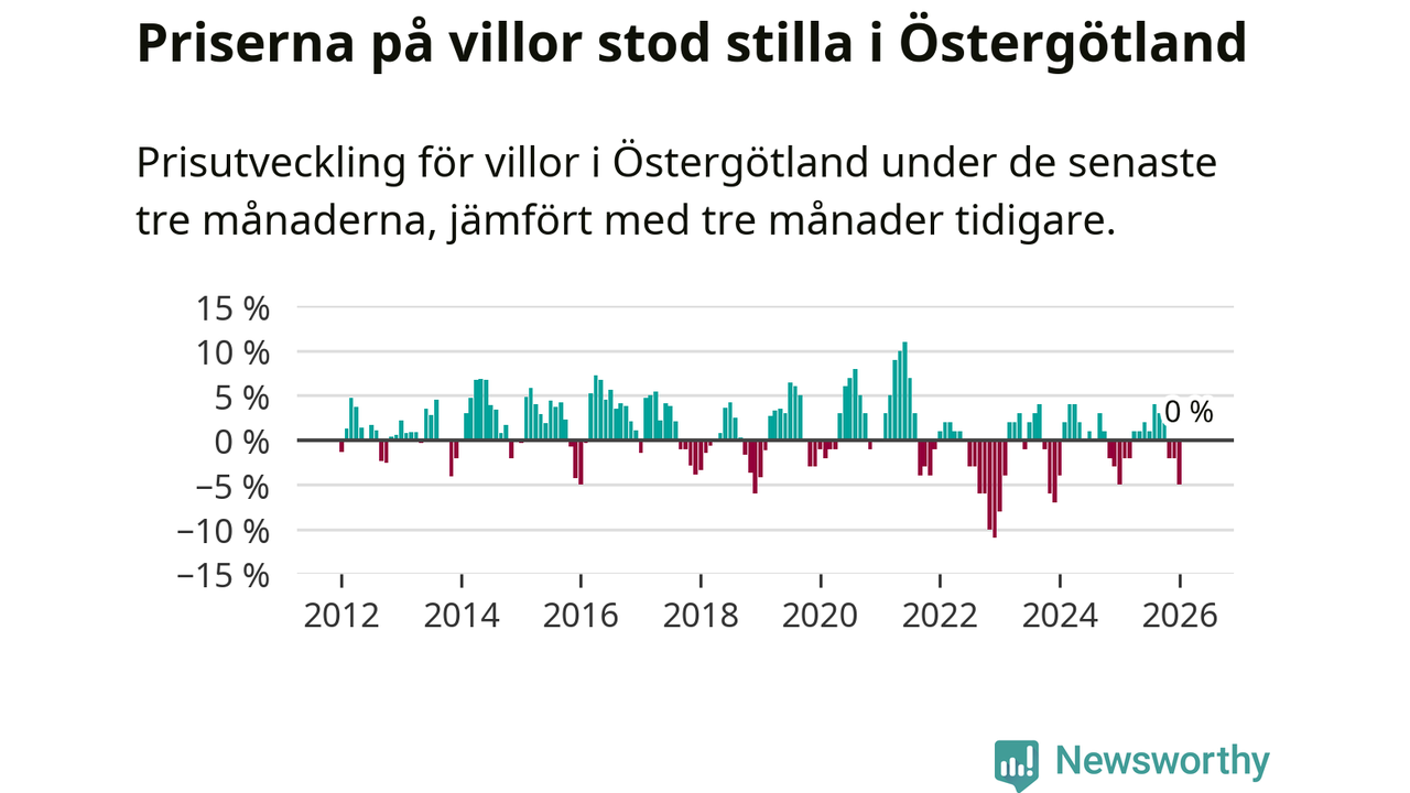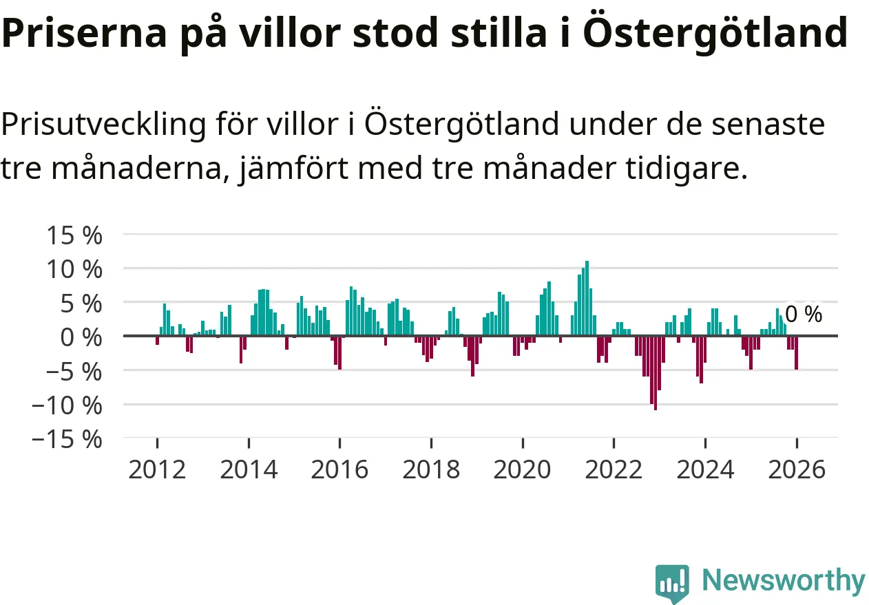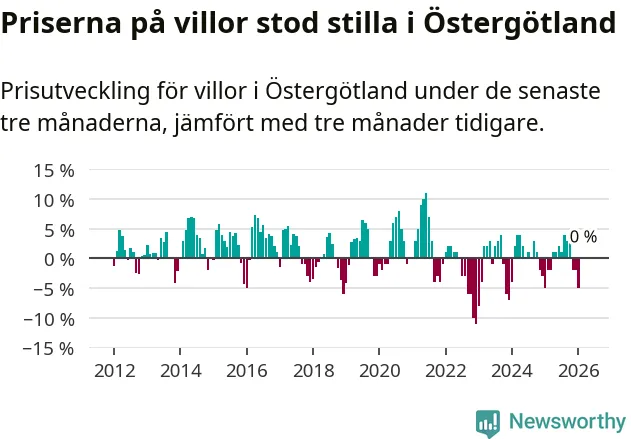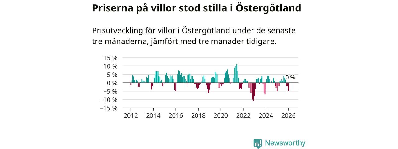 Villapriserna står i stort sett stilla i Östergötlands län. Medelpriset på de på försäljningarna under de senaste tre månaderna låg på samma nivå som för tre månader sedan.
