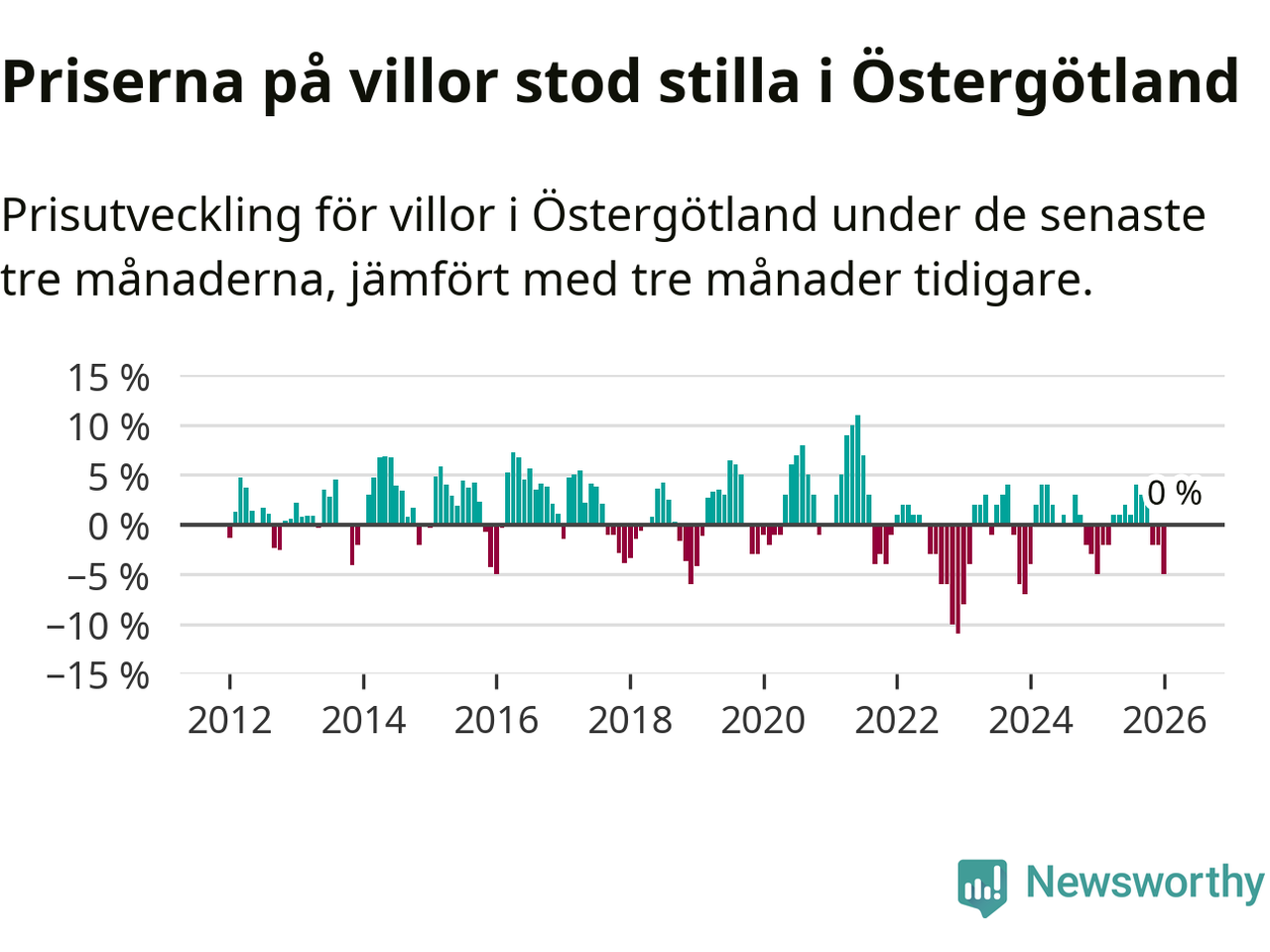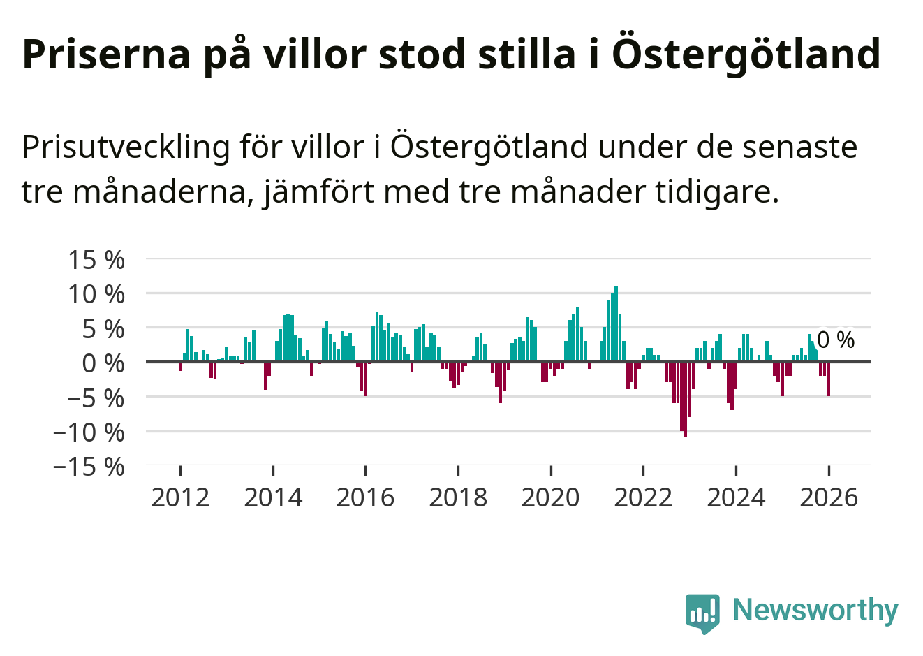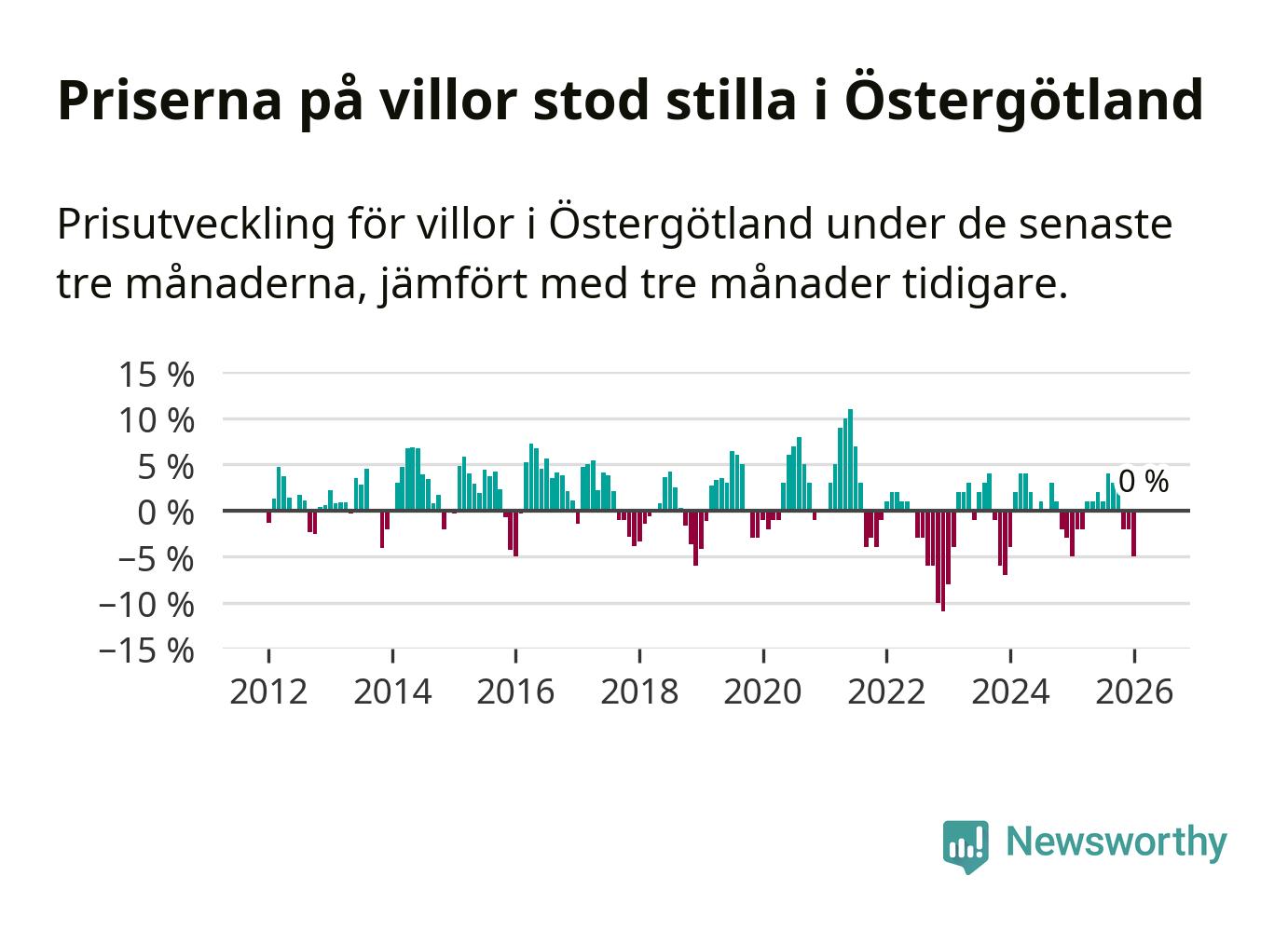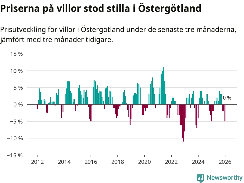 Villapriserna står i stort sett stilla i Östergötlands län. Medelpriset på de på försäljningarna under de senaste tre månaderna låg på samma nivå som för tre månader sedan.
