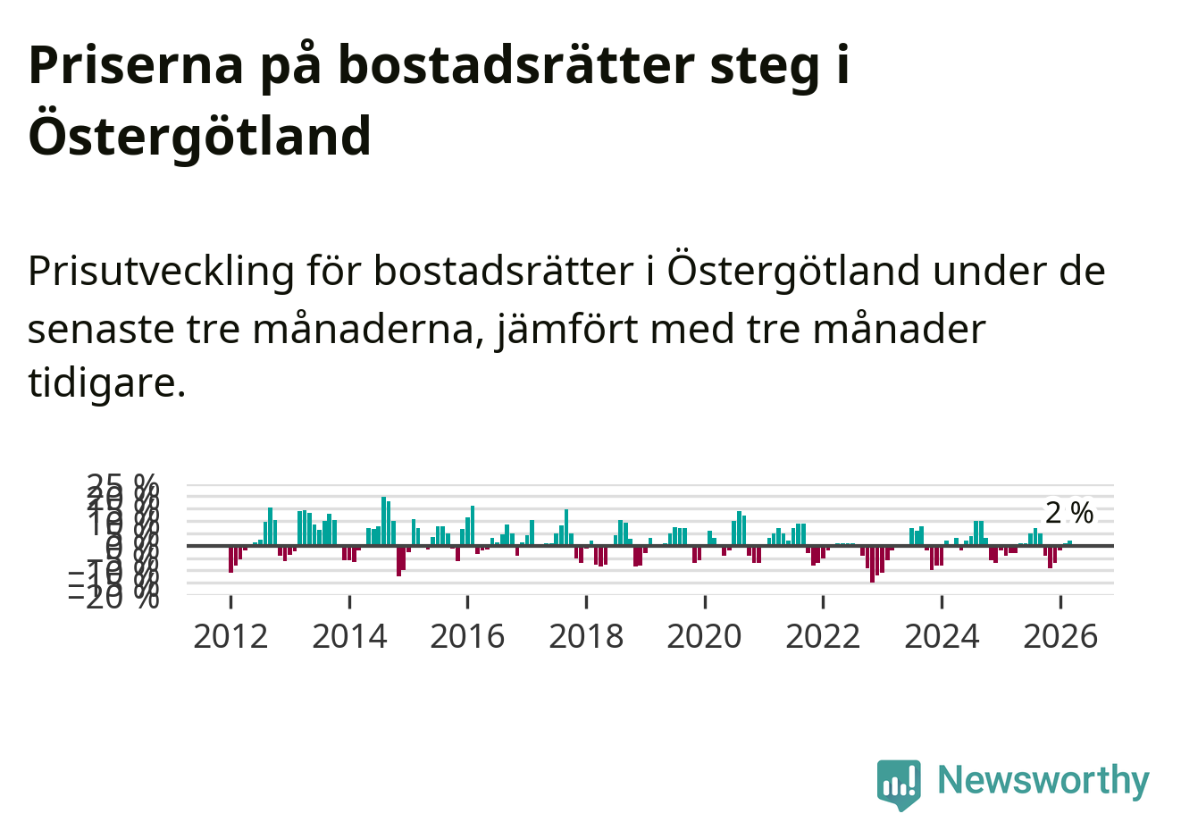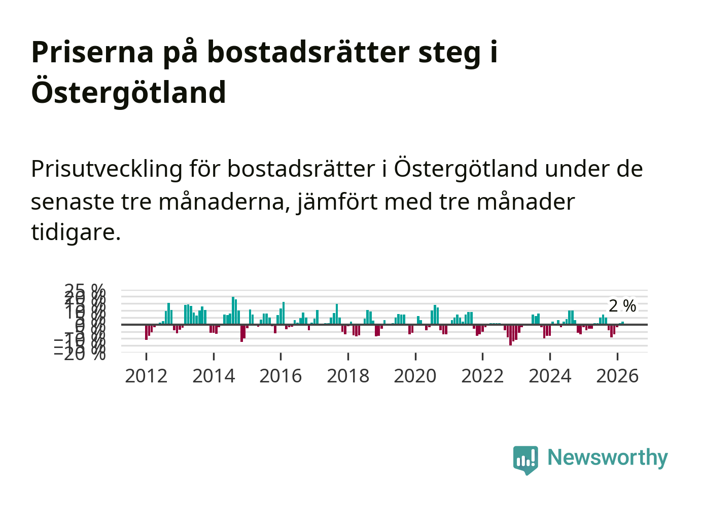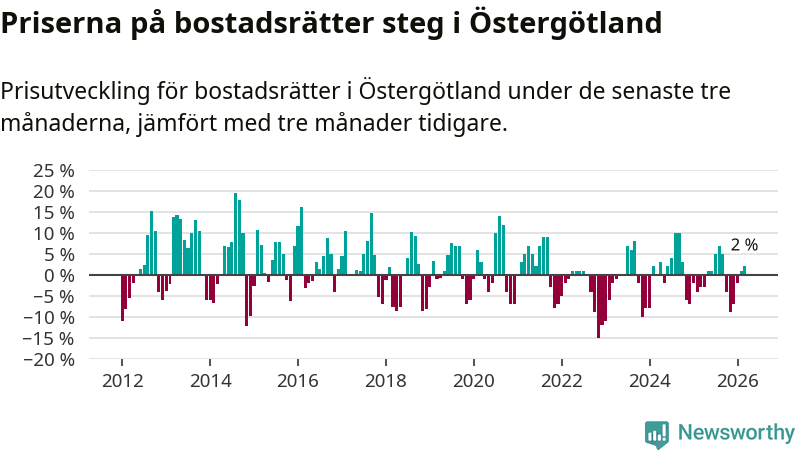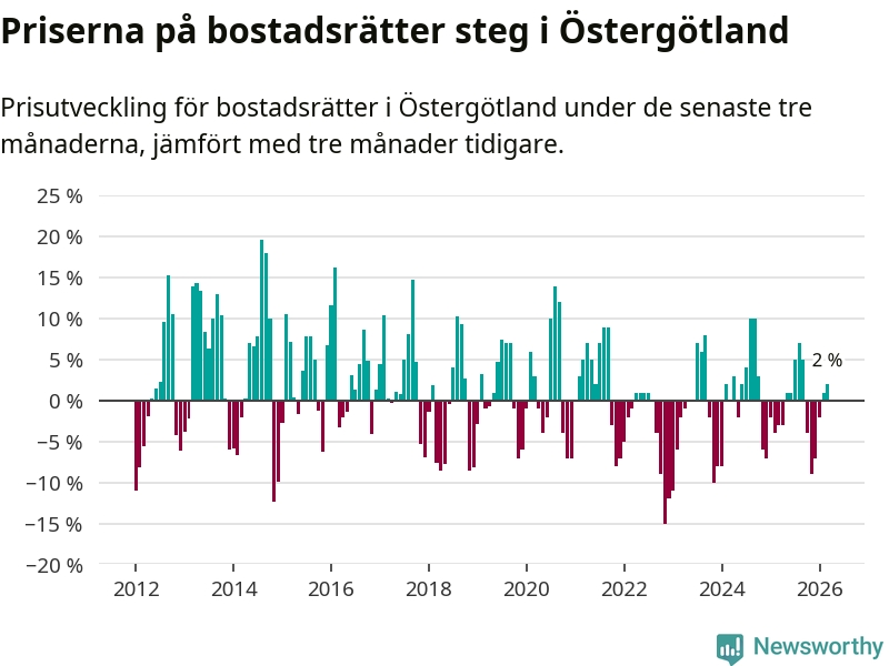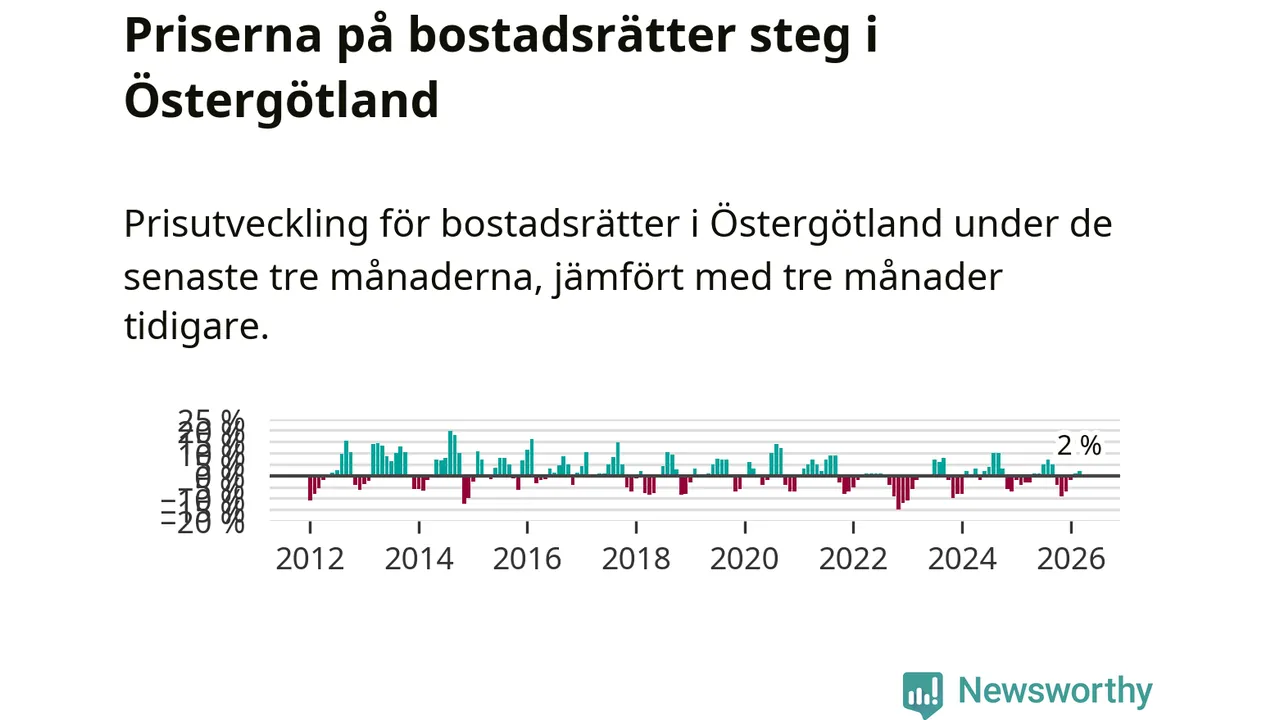 Priserna på bostadsrätter har gått upp i Östergötlands län. Medelpriset på försäljningarna under de senaste tre månaderna visar på en uppgång med 2 procent.