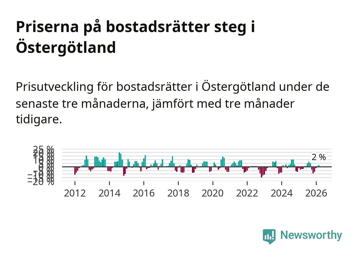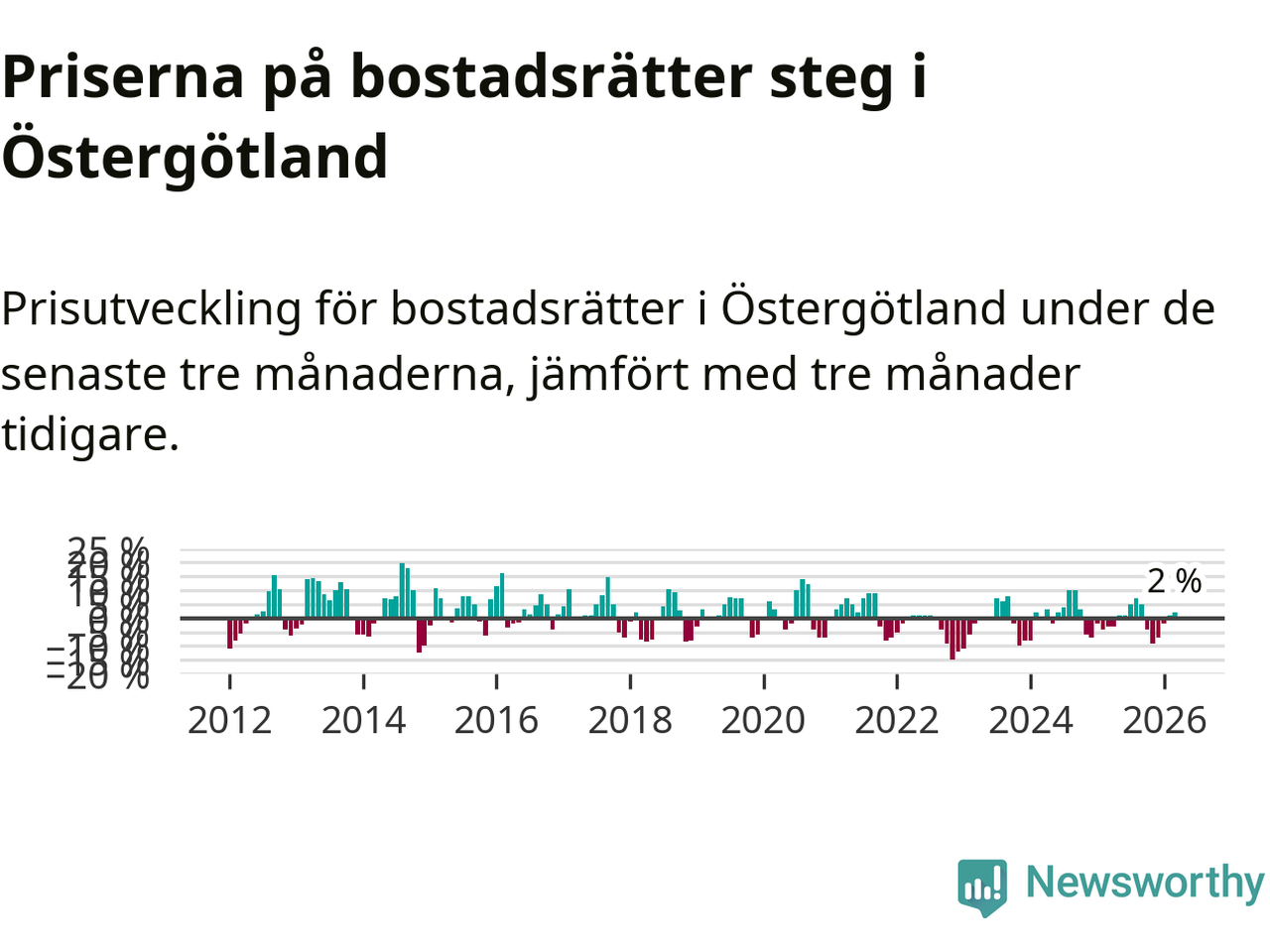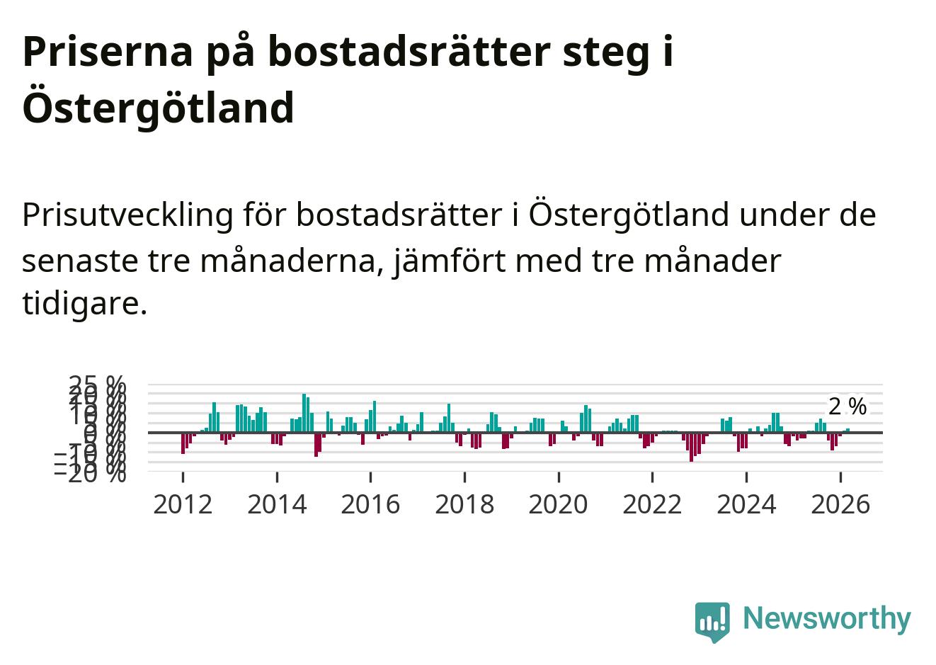 Priserna på bostadsrätter har gått upp i Östergötlands län. Medelpriset på försäljningarna under de senaste tre månaderna visar på en uppgång med 2 procent.