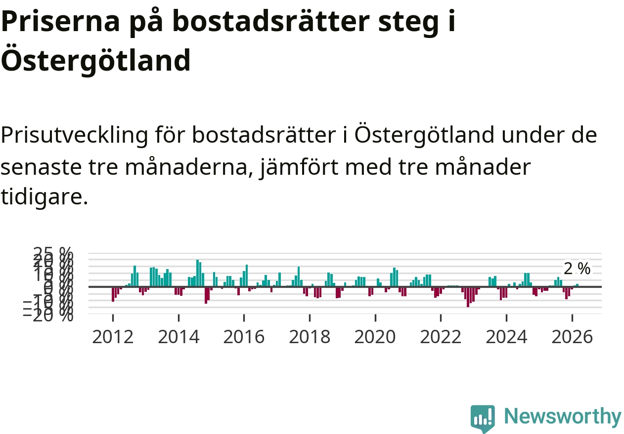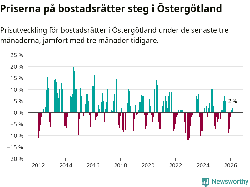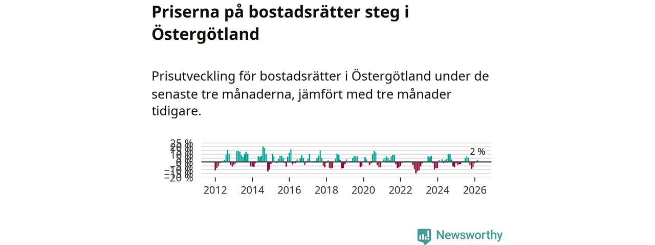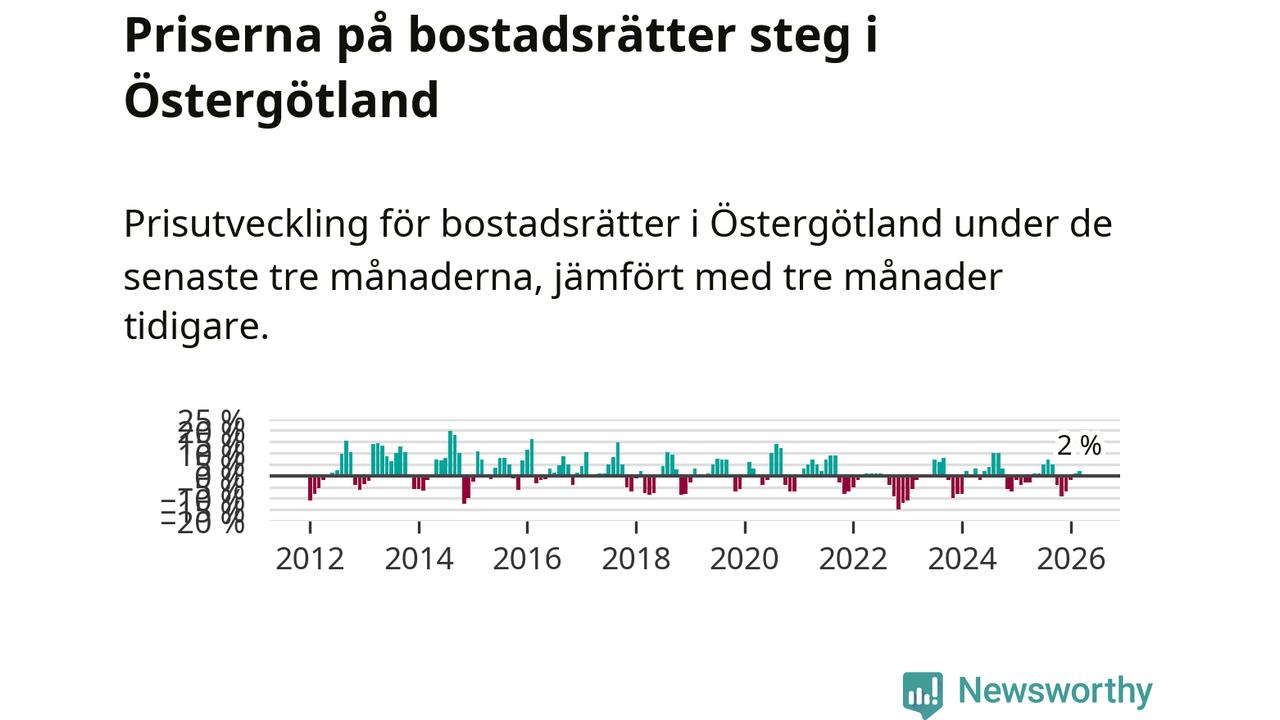Bland kommunerna i Östergötland stiger priserna på bostadsrätter i två av fyra kommuner (där det redovisats uppgifter om prisutveckling). Störst var ökningen i Linköping där priserna steg med 3 procent. I Motala däremot sjönk priserna med 6 procent. Notera att det på grund av få försäljningar saknas uppgifter om prisförändringar för bostadsrätter i nio av länets 13 kommuner.
