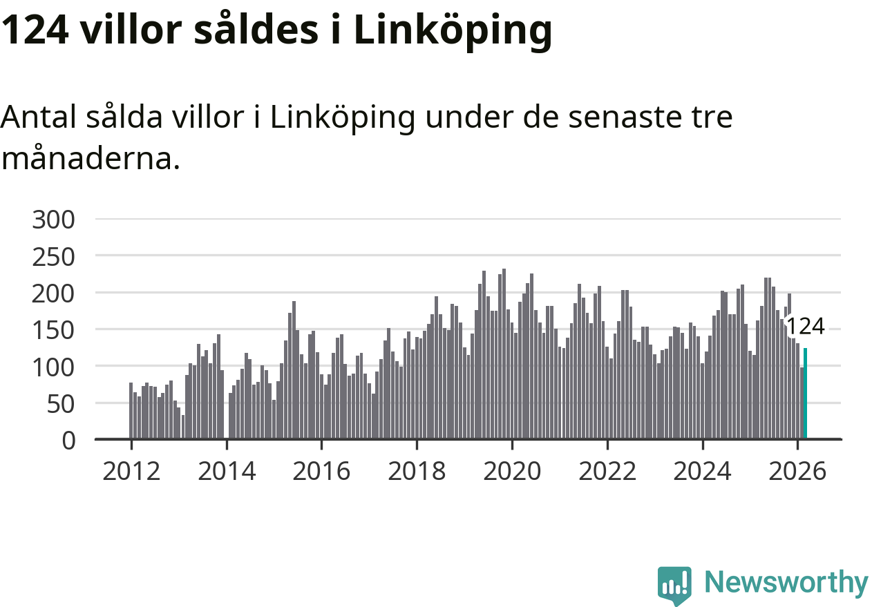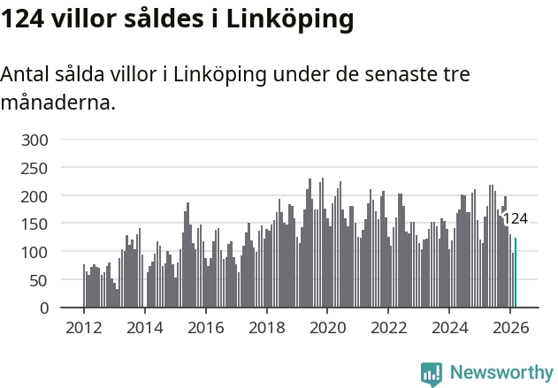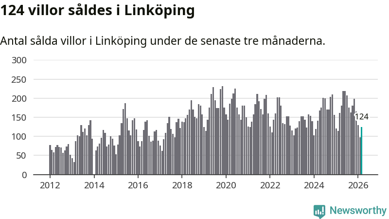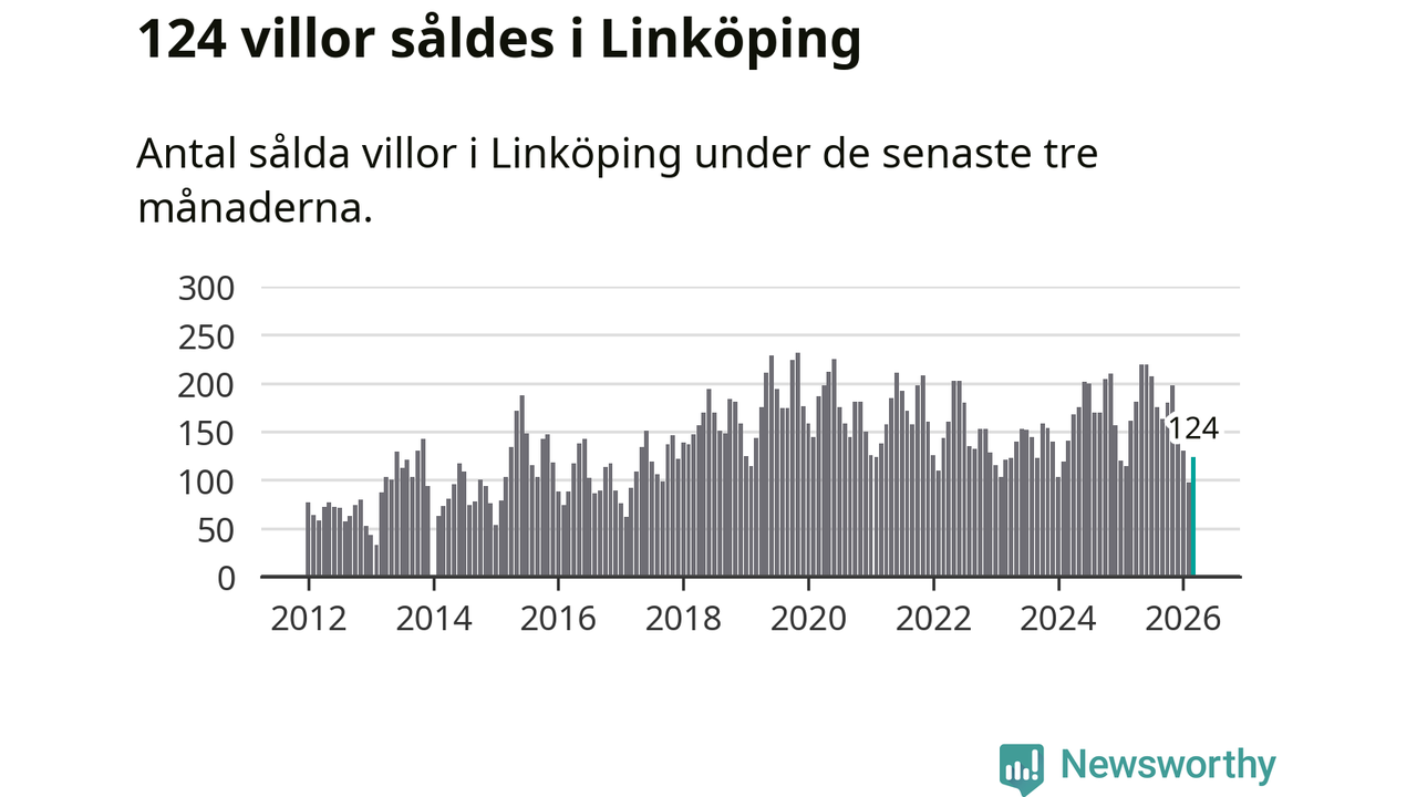 Mellan januari och mars såldes 124 villor i Linköpings kommun. Det är relativt få sett till aktiviteten på bostadsmarknaden i kommunen under de senaste tolv månaderna, samt det historiska snittet för den här tiden på året.