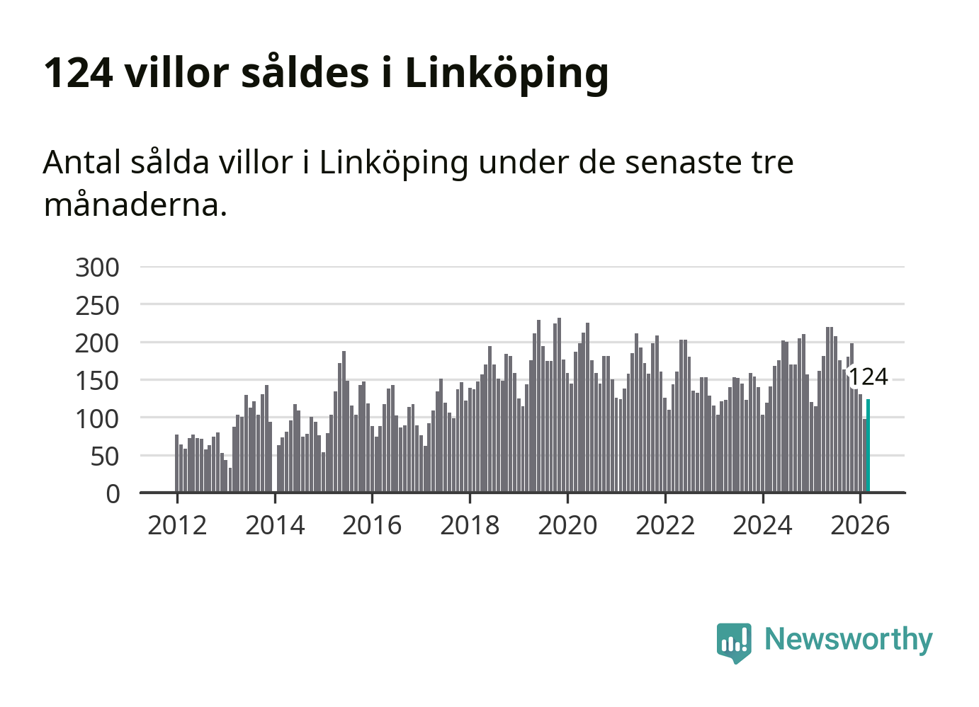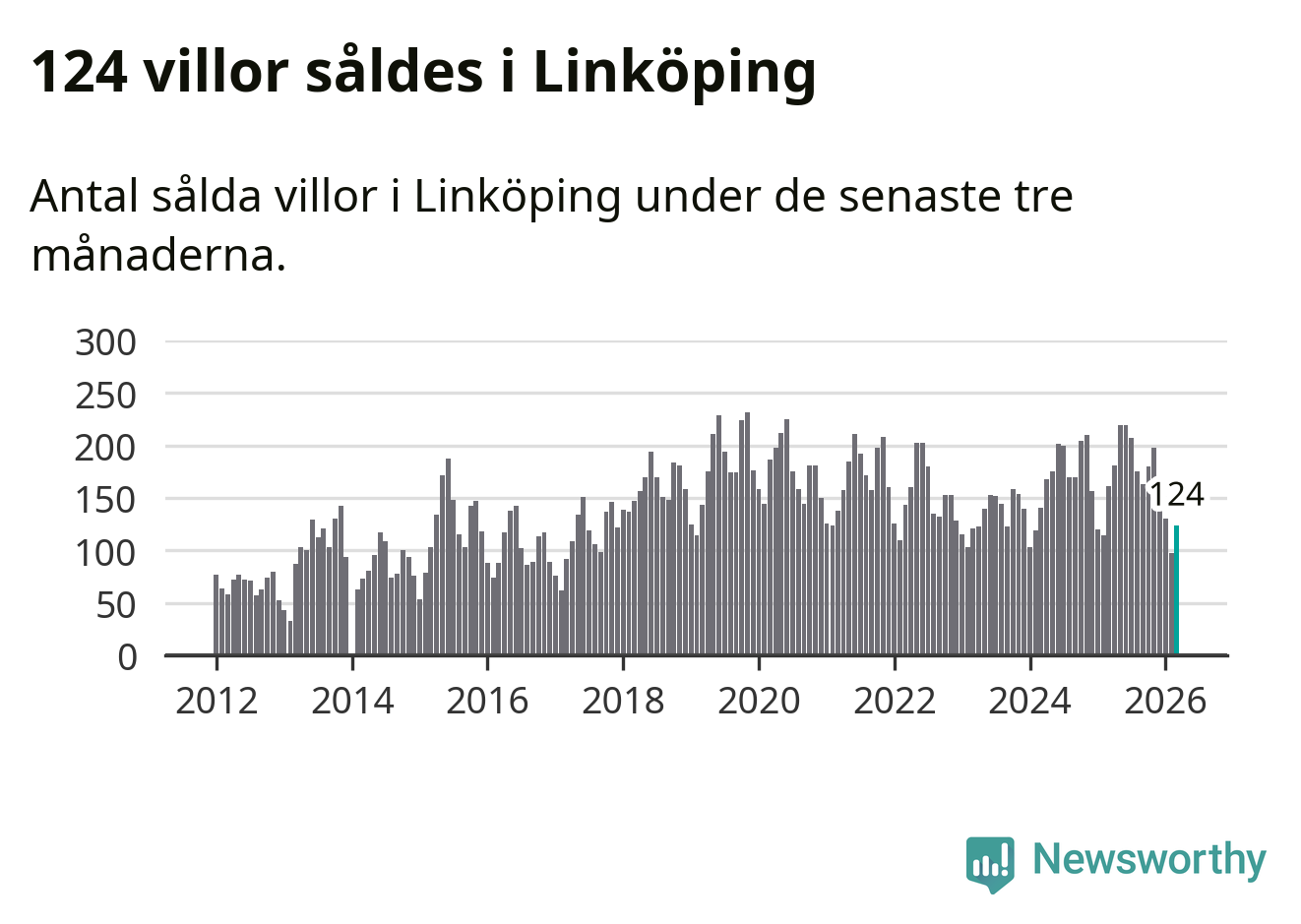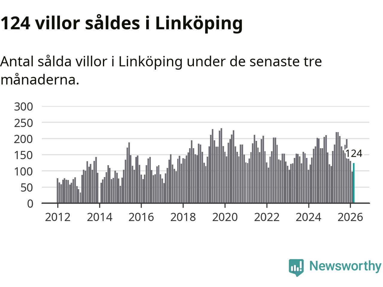 Mellan januari och mars såldes 124 villor i Linköpings kommun. Det är relativt få sett till aktiviteten på bostadsmarknaden i kommunen under de senaste tolv månaderna, samt det historiska snittet för den här tiden på året.
