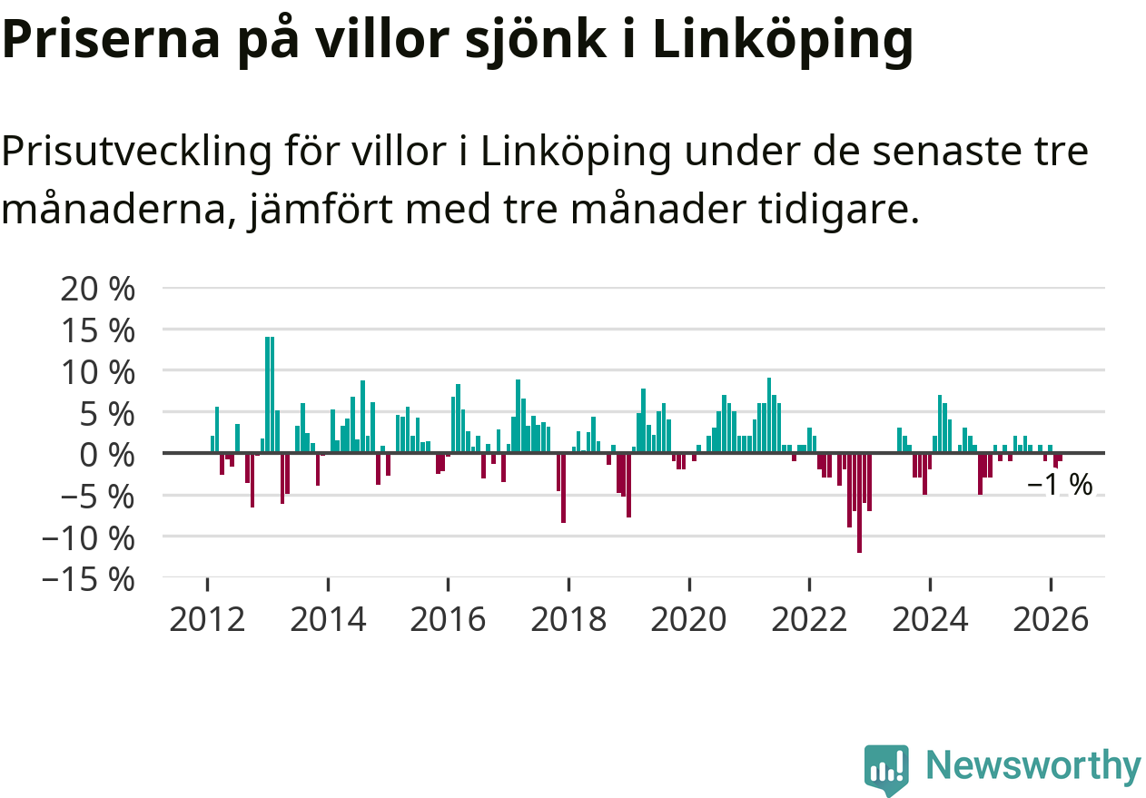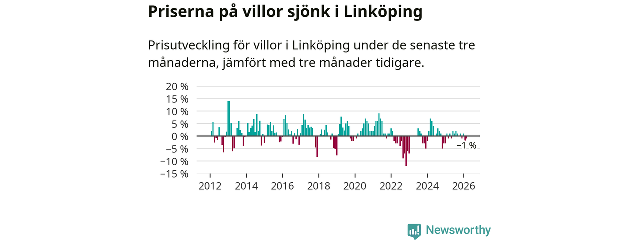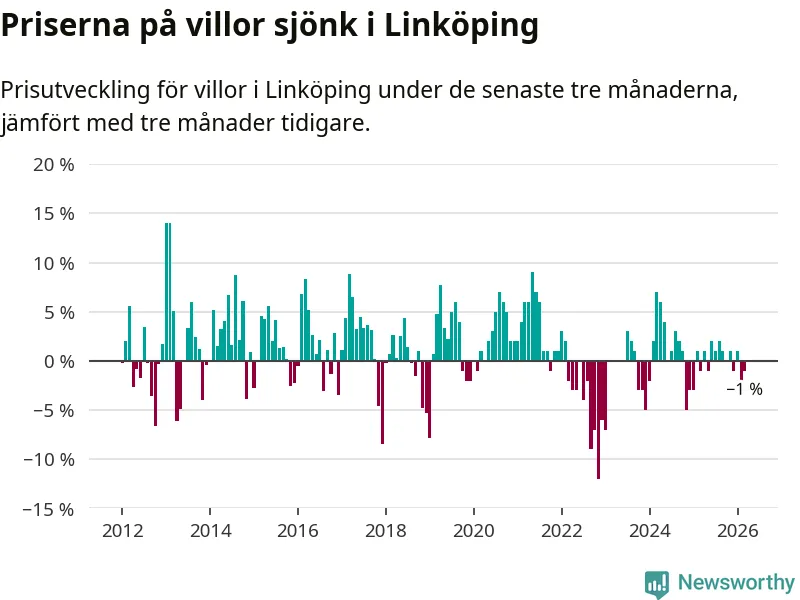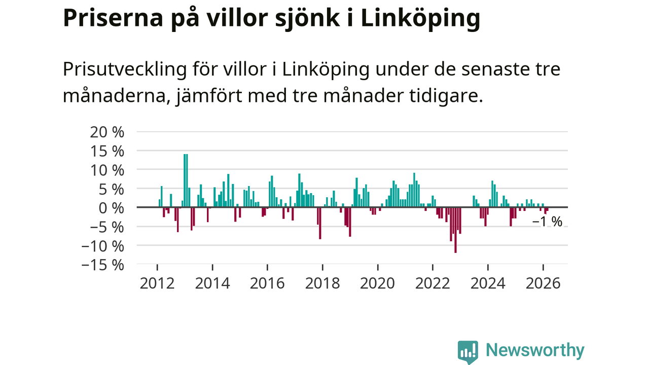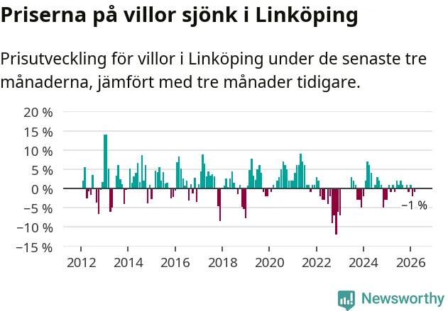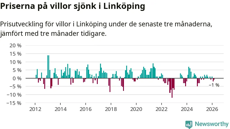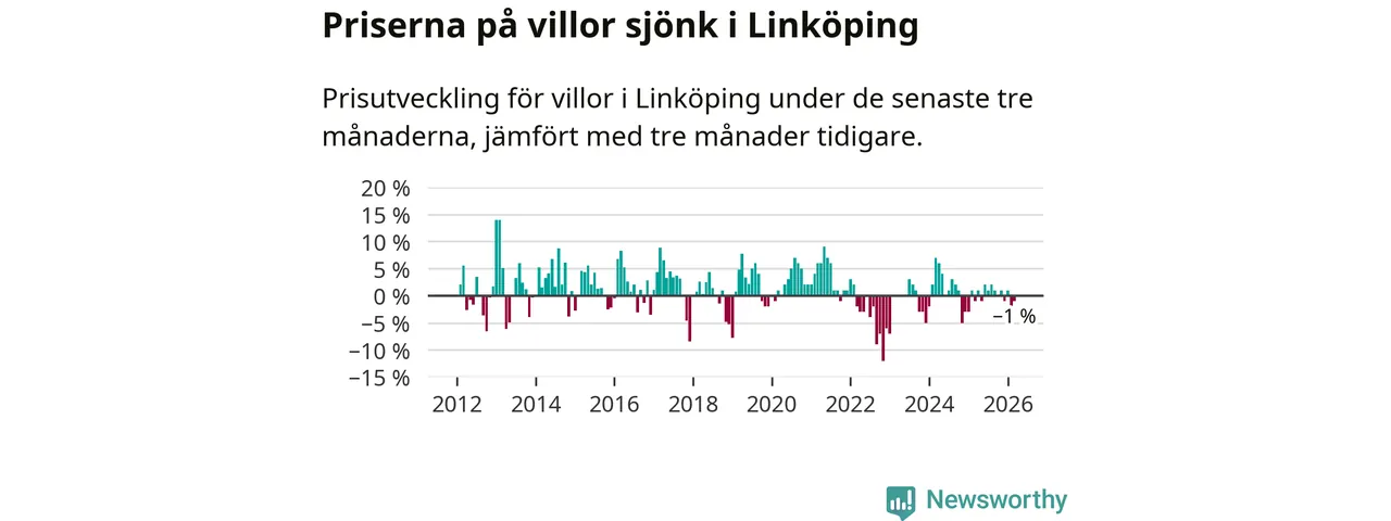 Statistiken visar även på en prisnedgång i Linköpings kommun. Medelpriset på försäljningarna av villor i kommunen var 1 procent lägre än för tre månader sedan. I hela Östergötland däremot ligger villapriserna stilla.