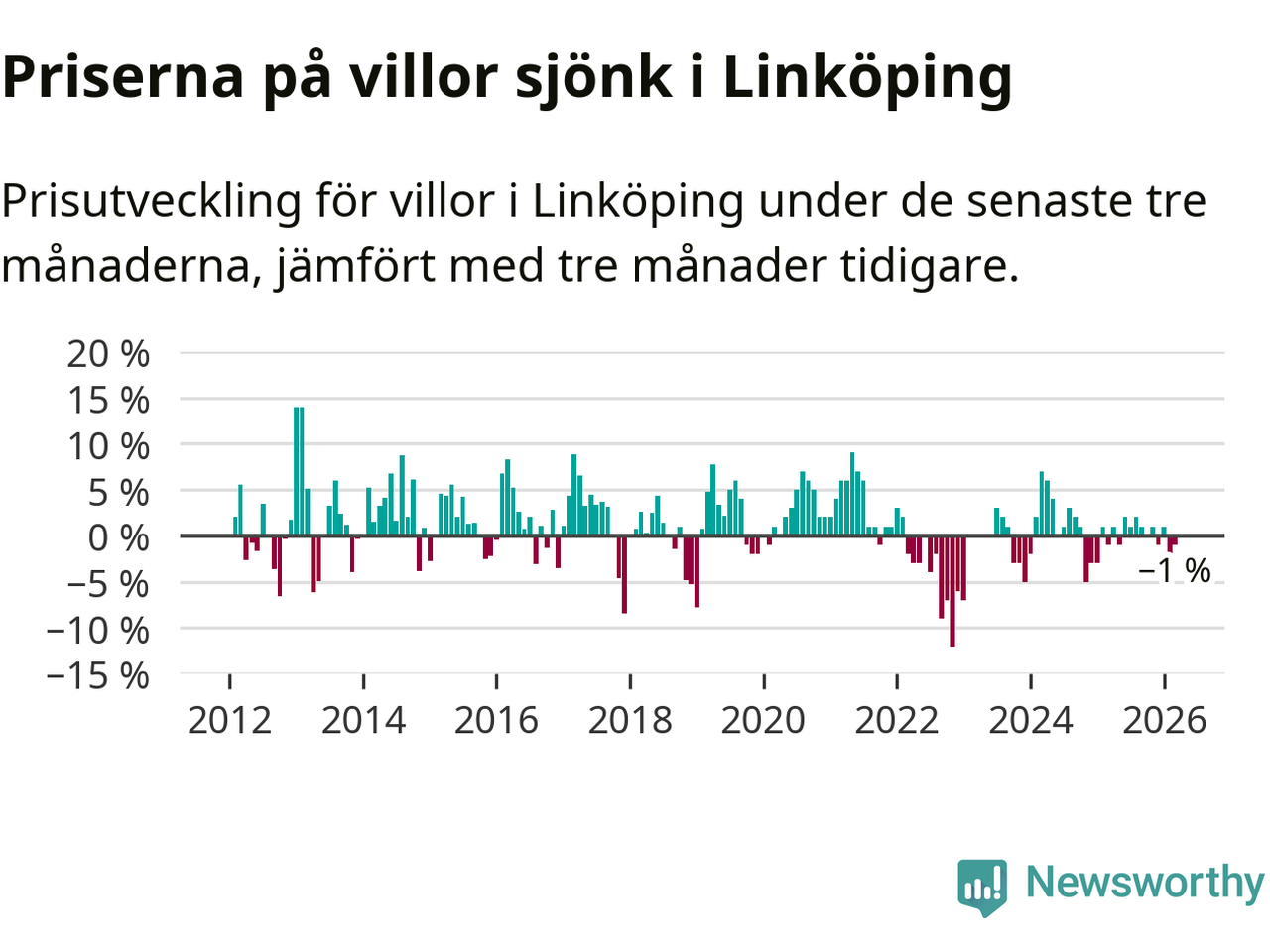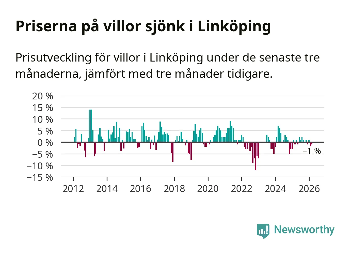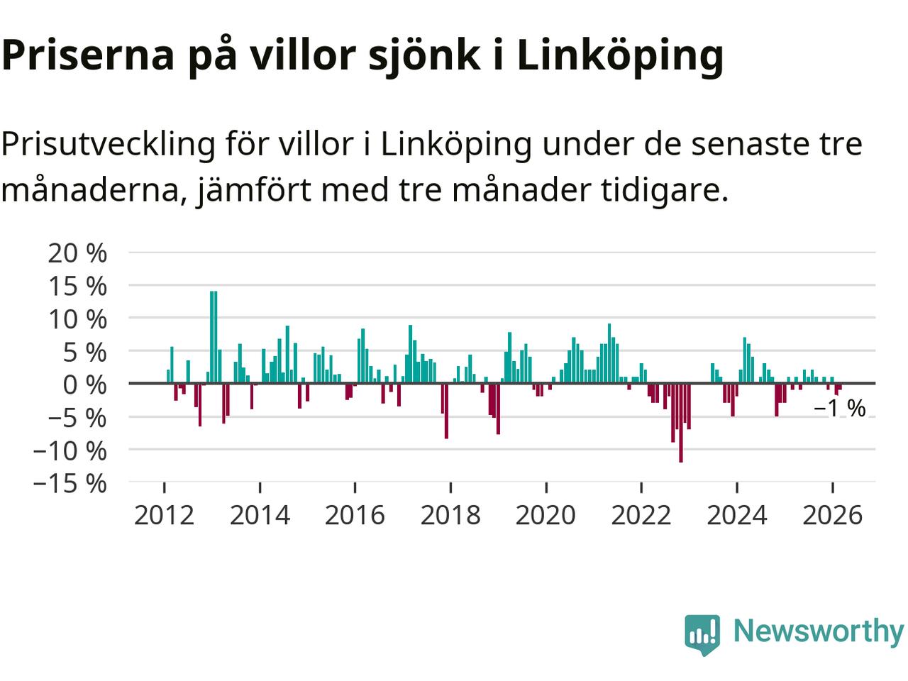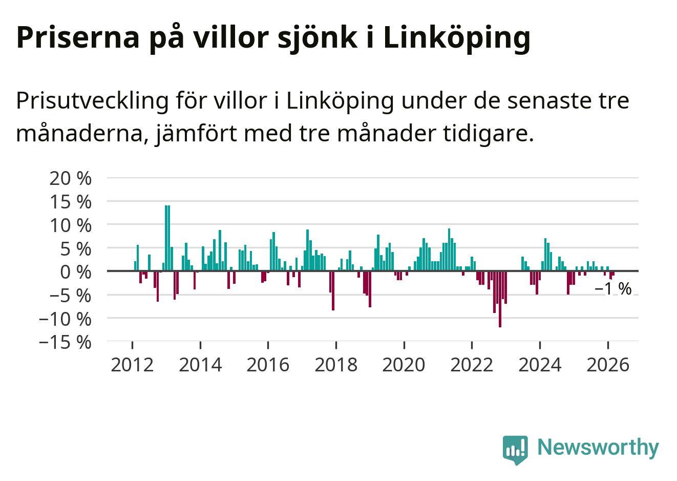 Statistiken visar även på en prisnedgång i Linköpings kommun. Medelpriset på försäljningarna av villor i kommunen var 1 procent lägre än för tre månader sedan. I hela Östergötland däremot ligger villapriserna stilla.