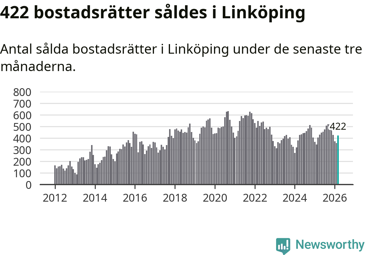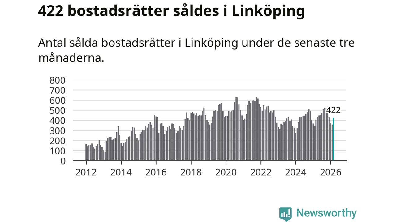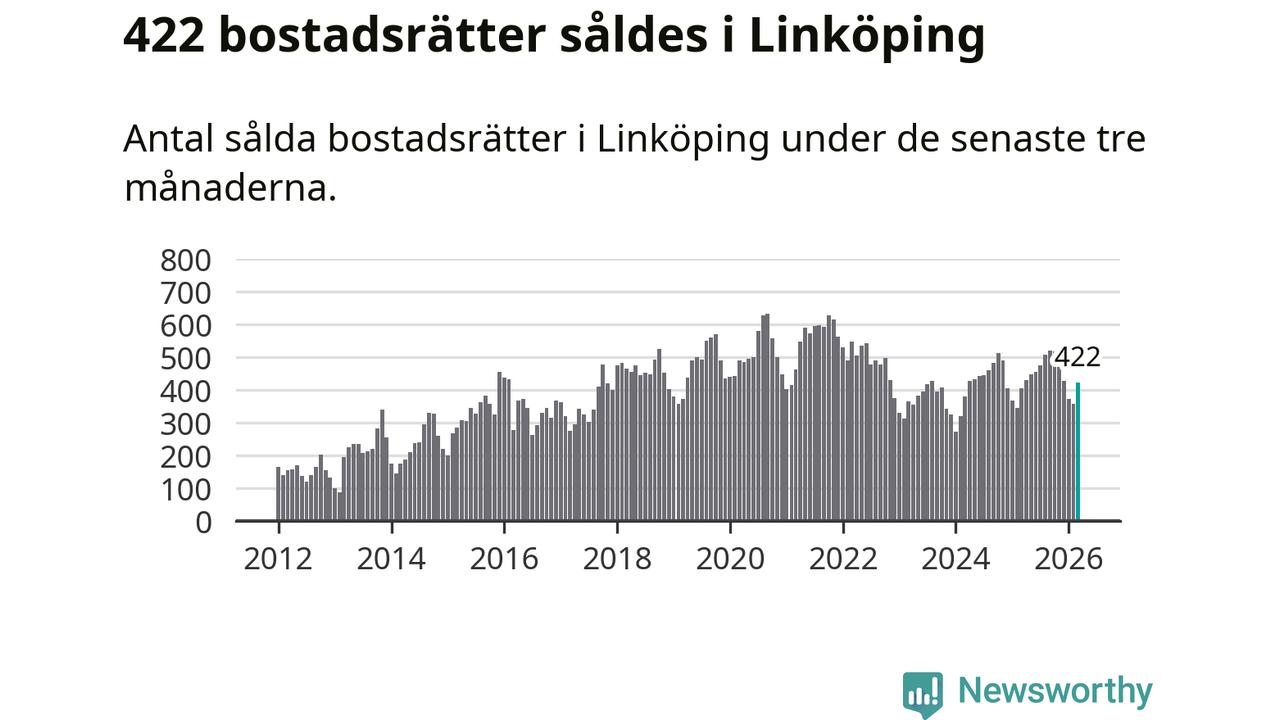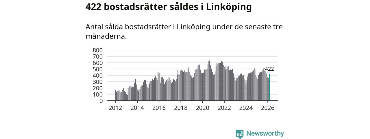 Sammanlagt såldes 422 bostadsrätter i Linköpings kommun mellan januari och mars till ett genomsnittligt pris på 2,1 miljoner kronor. I fjol gjordes 404 affärer vid den här tiden på året.