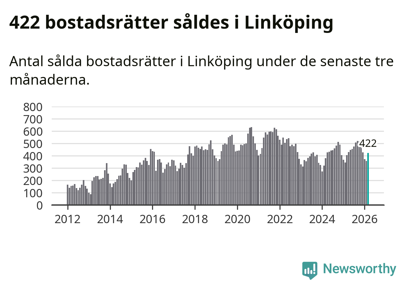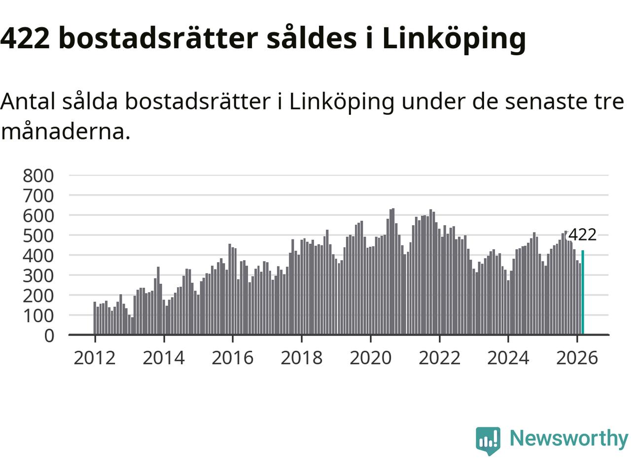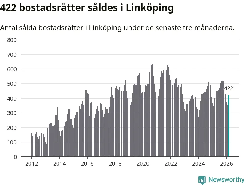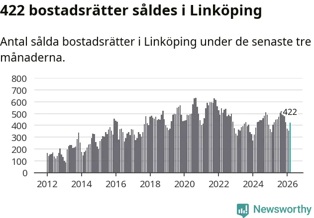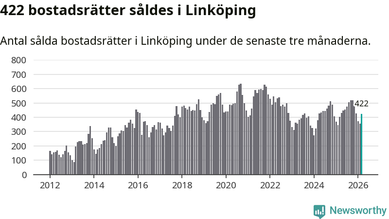 Sammanlagt såldes 422 bostadsrätter i Linköpings kommun mellan januari och mars till ett genomsnittligt pris på 2,1 miljoner kronor. I fjol gjordes 404 affärer vid den här tiden på året.