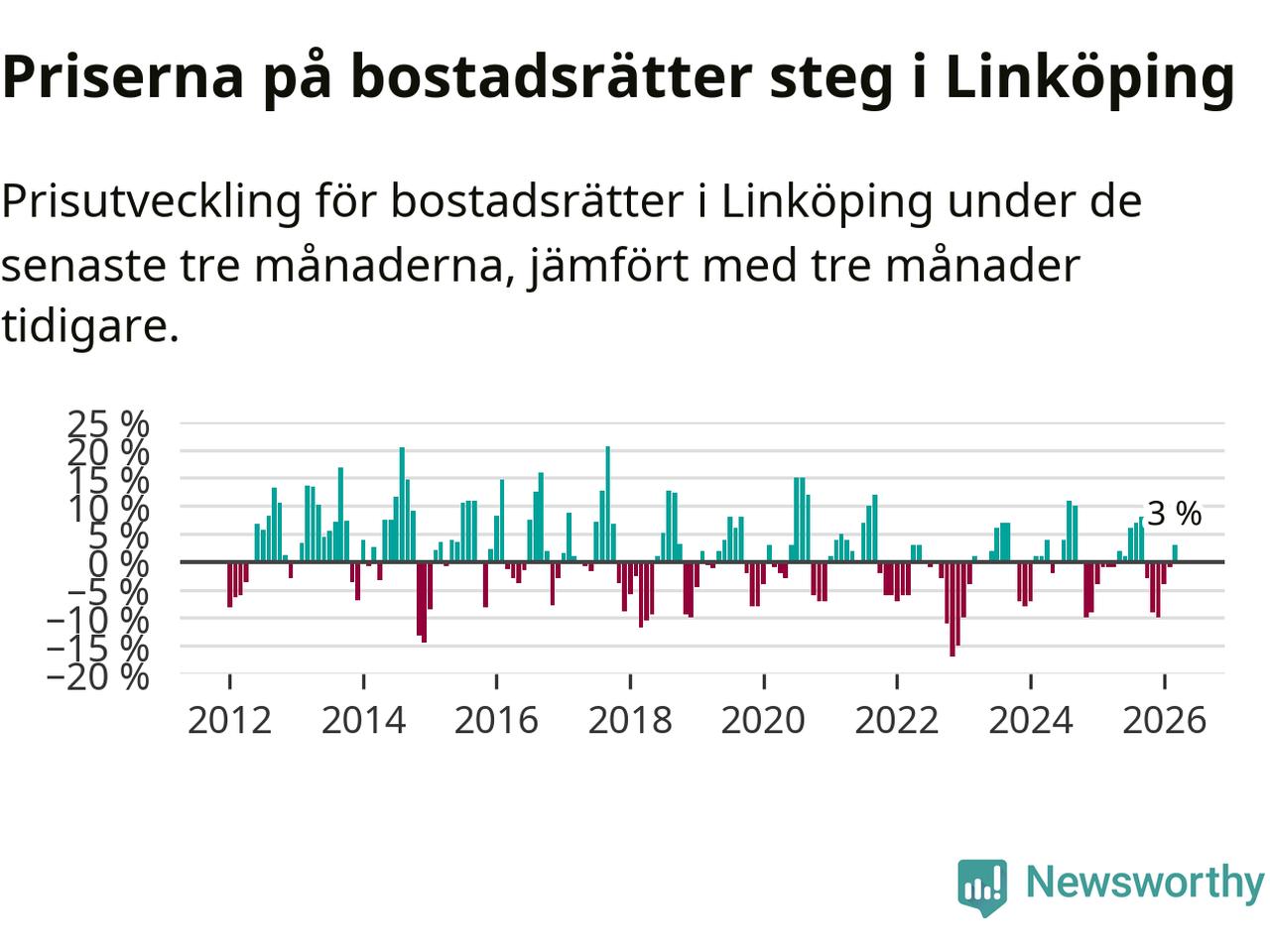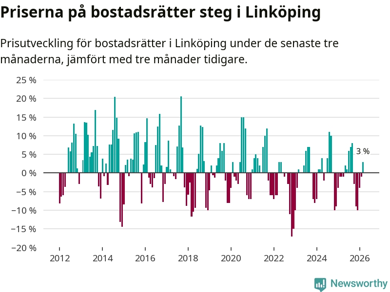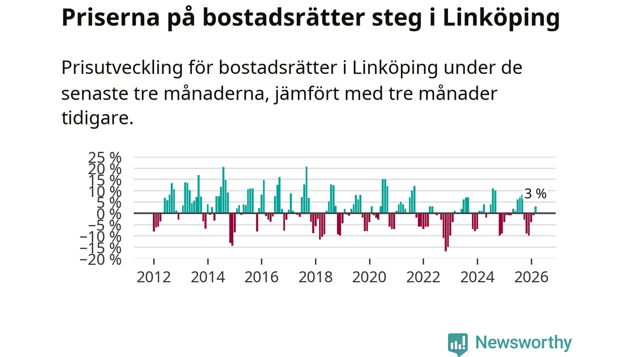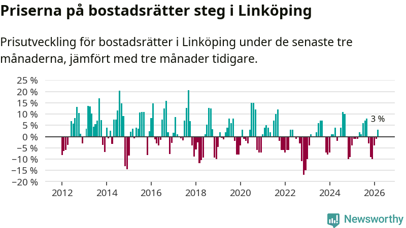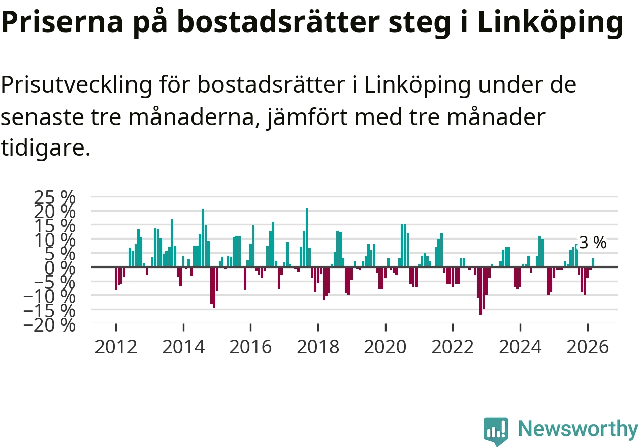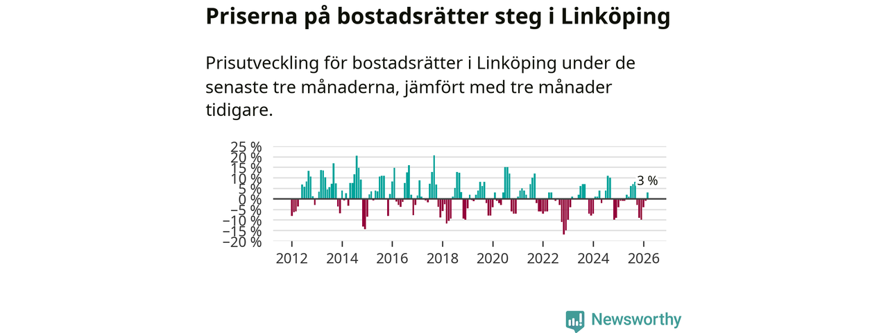 Priserna på bostadsrätter har gått upp i Linköpings kommun. Medelpriset på försäljningarna under de senaste tre månaderna visar på en uppgång med 3 procent.