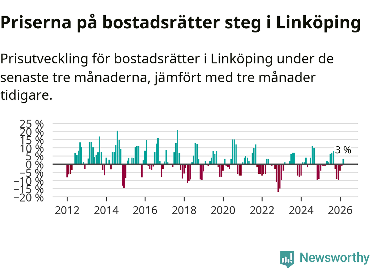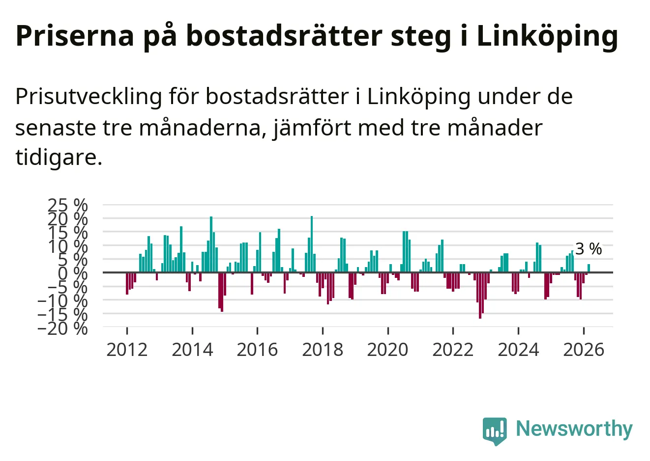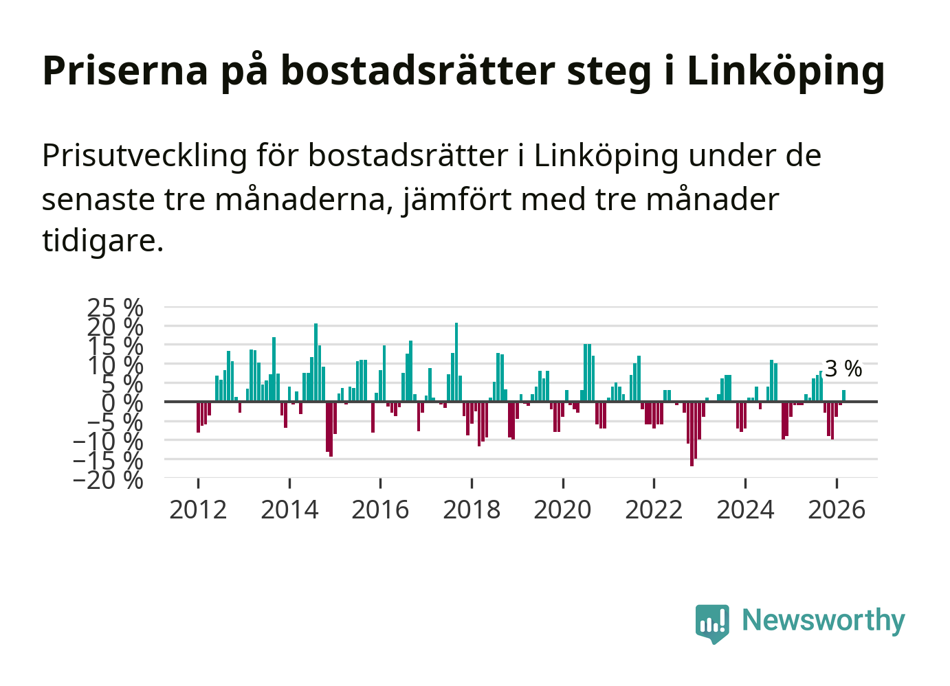 Priserna på bostadsrätter har gått upp i Linköpings kommun. Medelpriset på försäljningarna under de senaste tre månaderna visar på en uppgång med 3 procent.