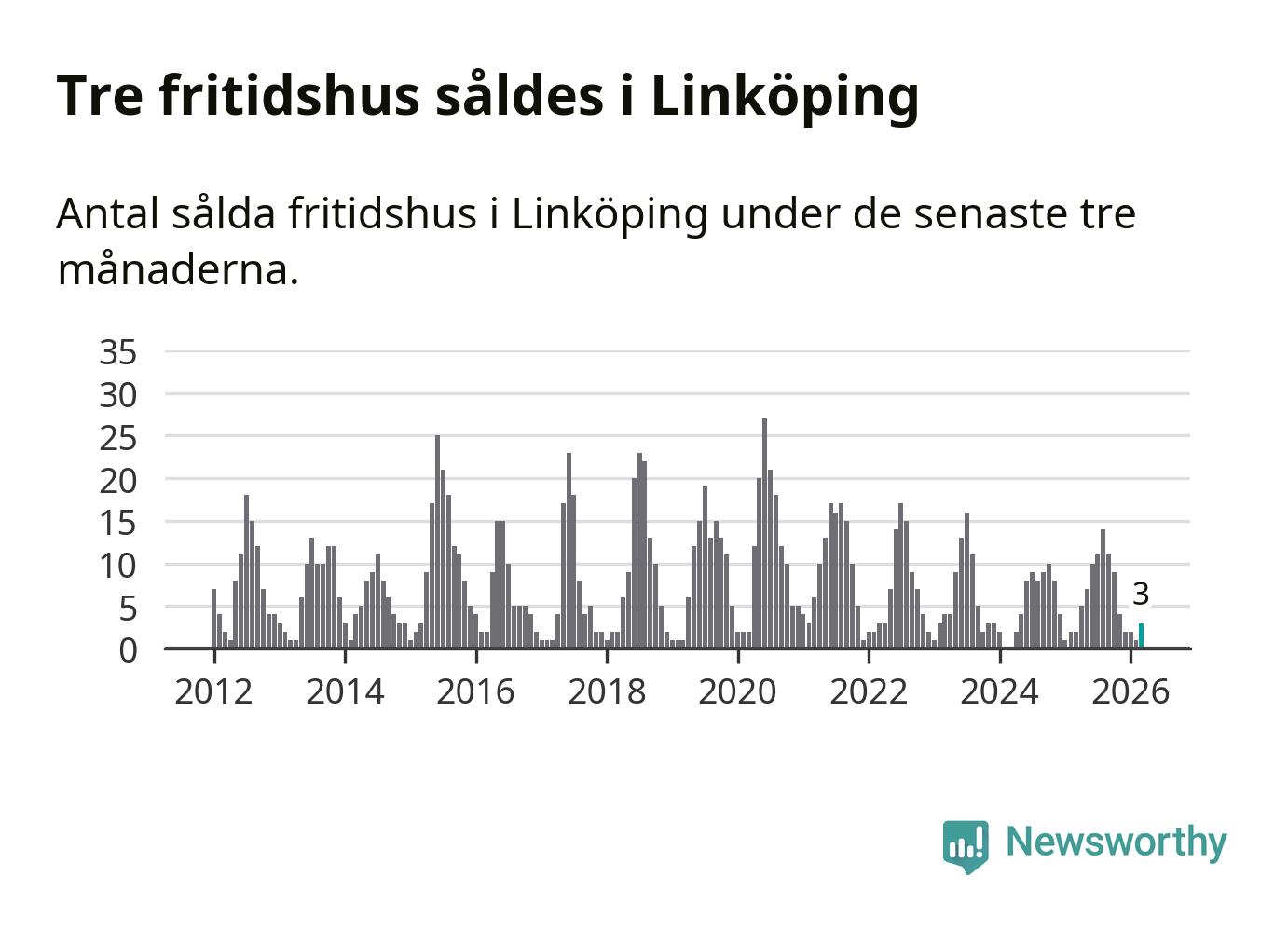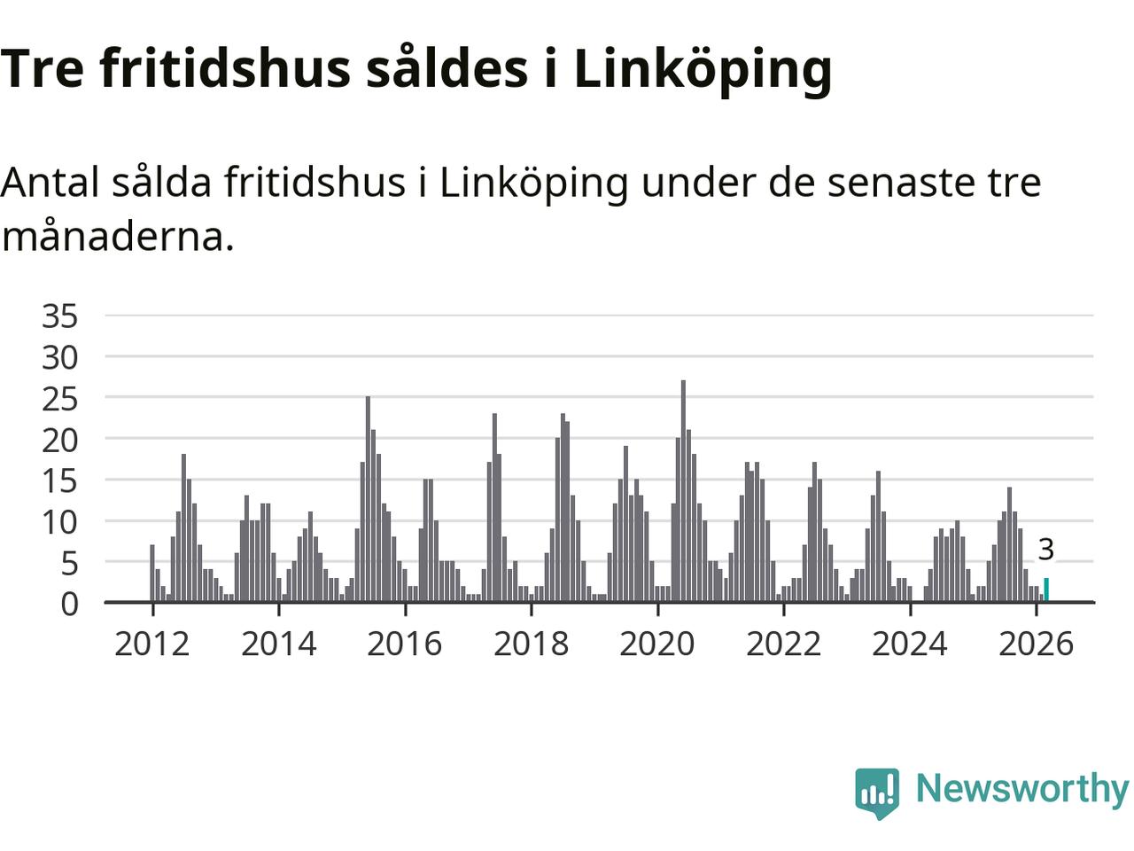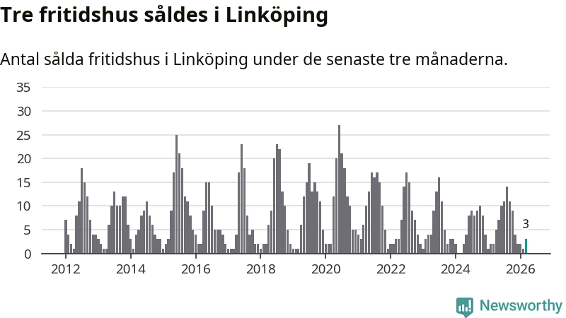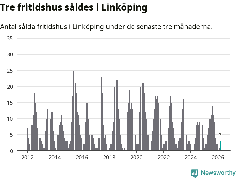 Mellan januari och mars gjordes sammanlagt tre affärer med fritidshus i Linköpings kommun. Det kan jämföras med två vid motsvarande tid i fjol.