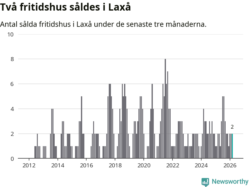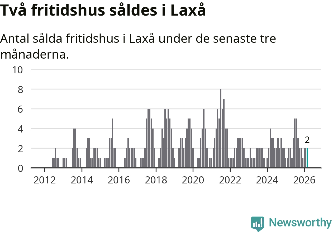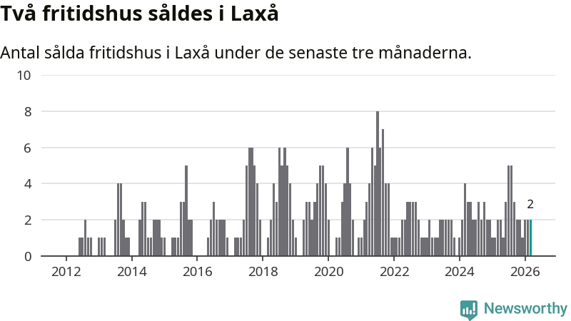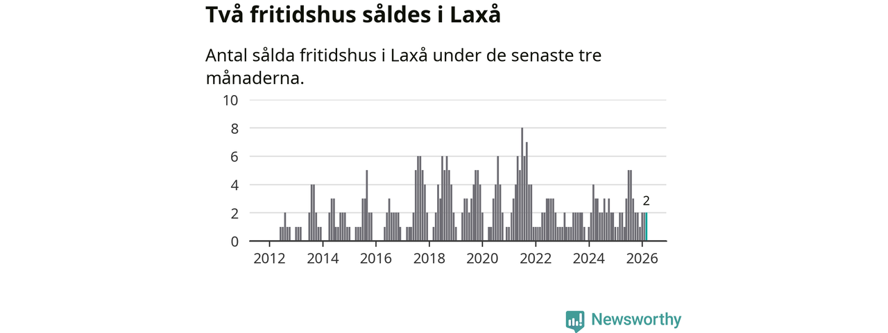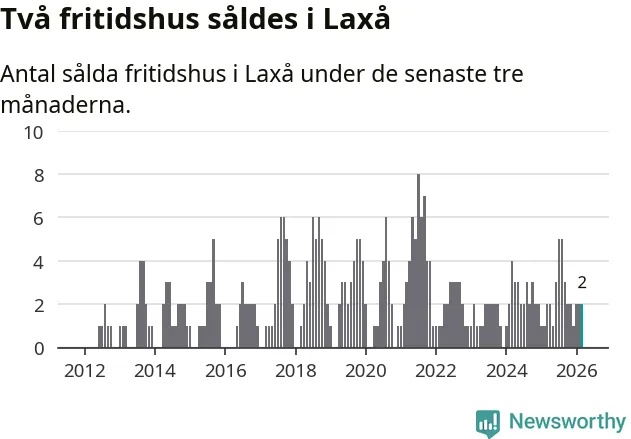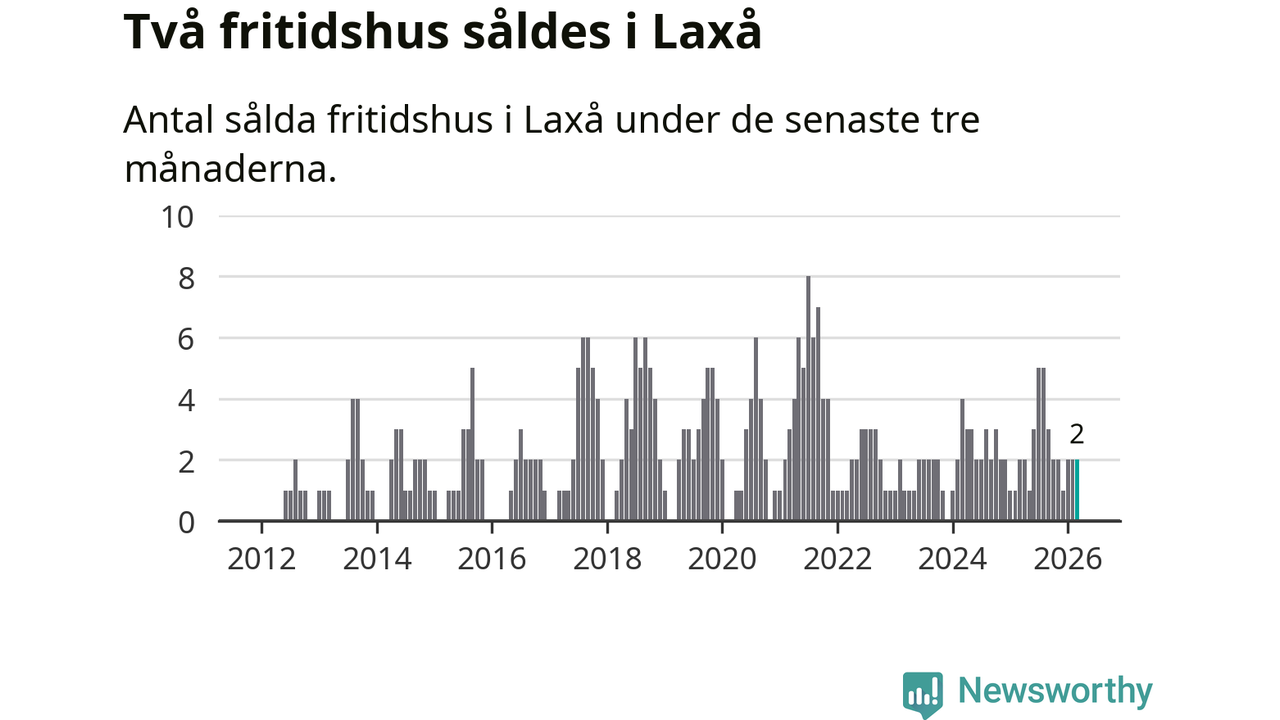 Mellan januari och mars gjordes sammanlagt två affärer med fritidshus i Laxå kommun. Det är lika många affärer som vid motsvarande tid i fjol.