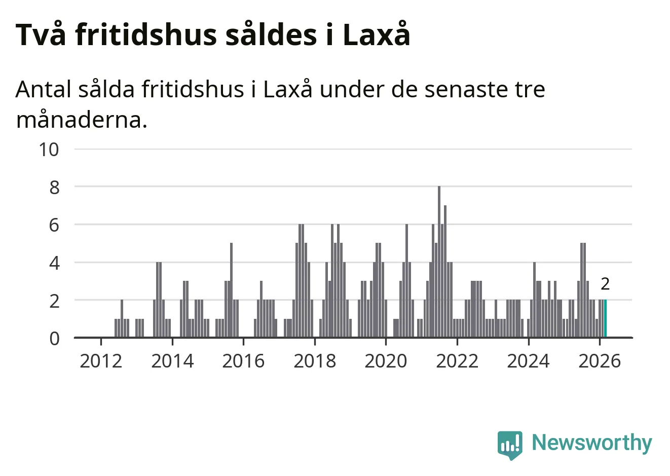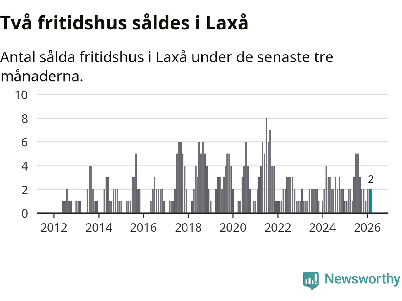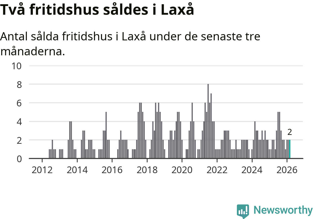 Mellan januari och mars gjordes sammanlagt två affärer med fritidshus i Laxå kommun. Det är lika många affärer som vid motsvarande tid i fjol.