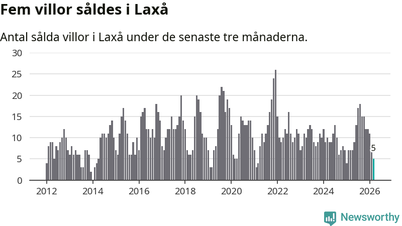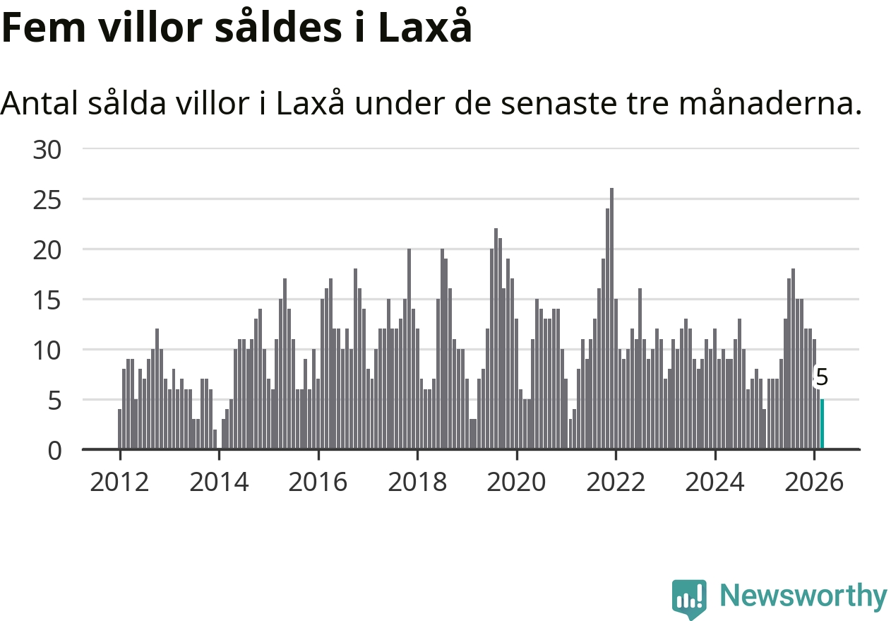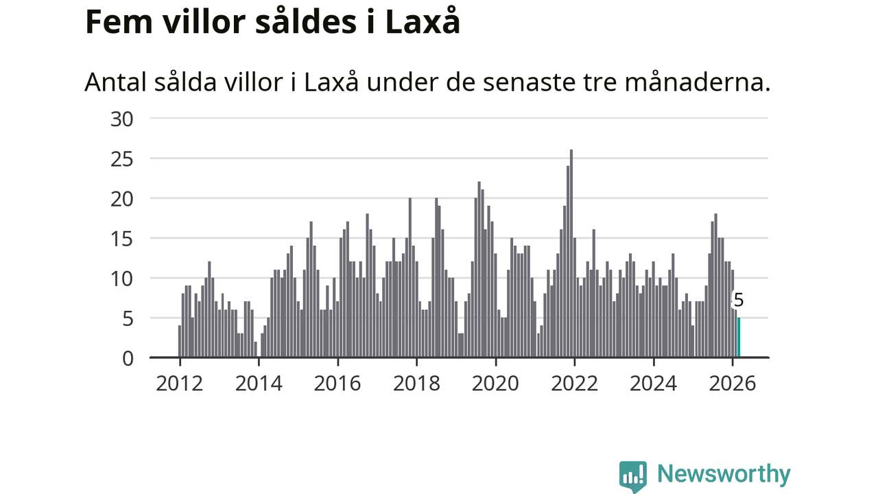 Mellan januari och mars gjordes sammanlagt fem affärer med villor i Laxå kommun. Det kan jämföras med sju vid motsvarande tid i fjol.