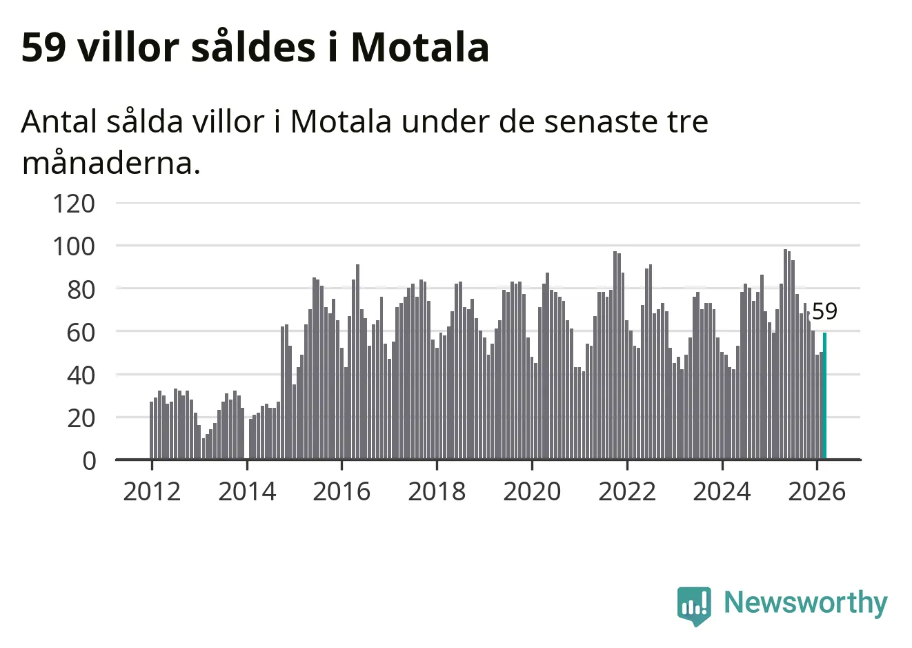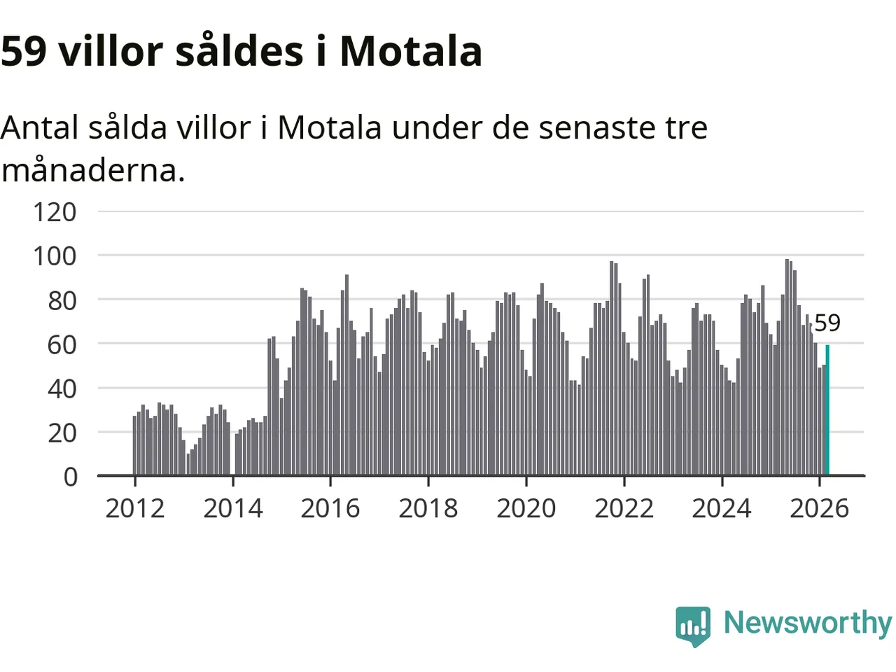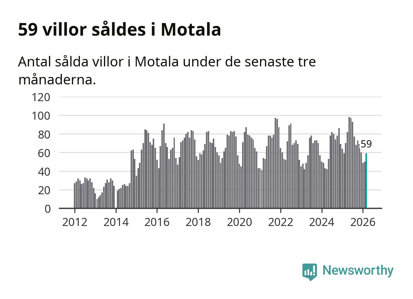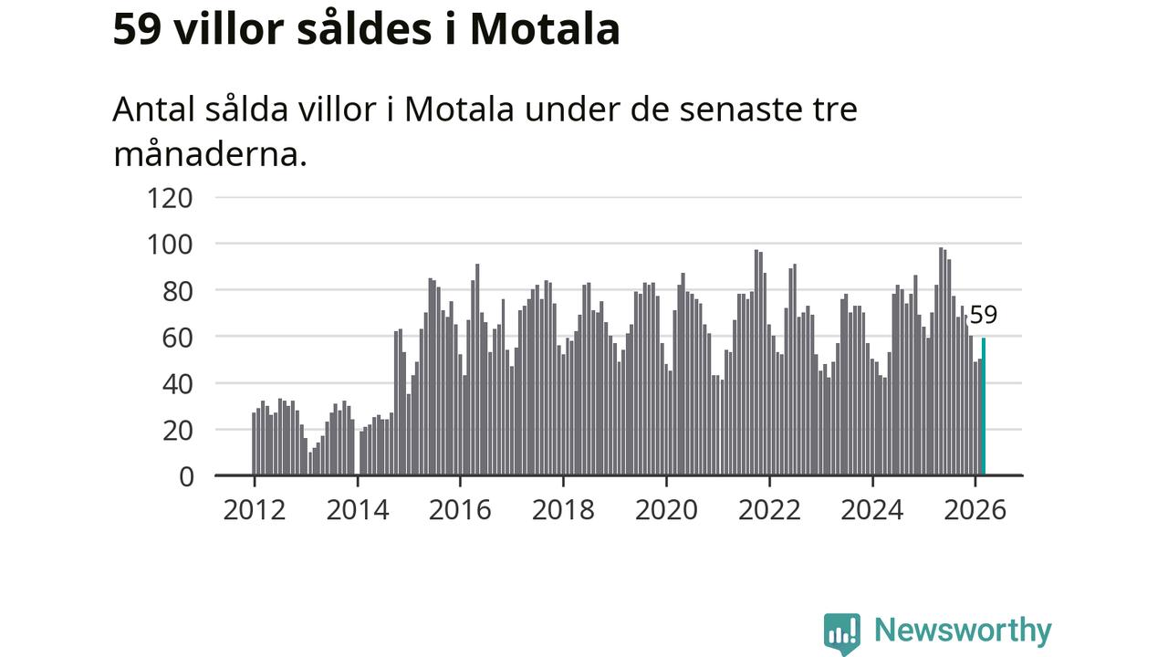 Sammanlagt såldes 59 villor i Motala kommun mellan januari och mars till ett genomsnittligt pris på 3,1 miljoner kronor. I fjol gjordes 70 affärer vid den här tiden på året.