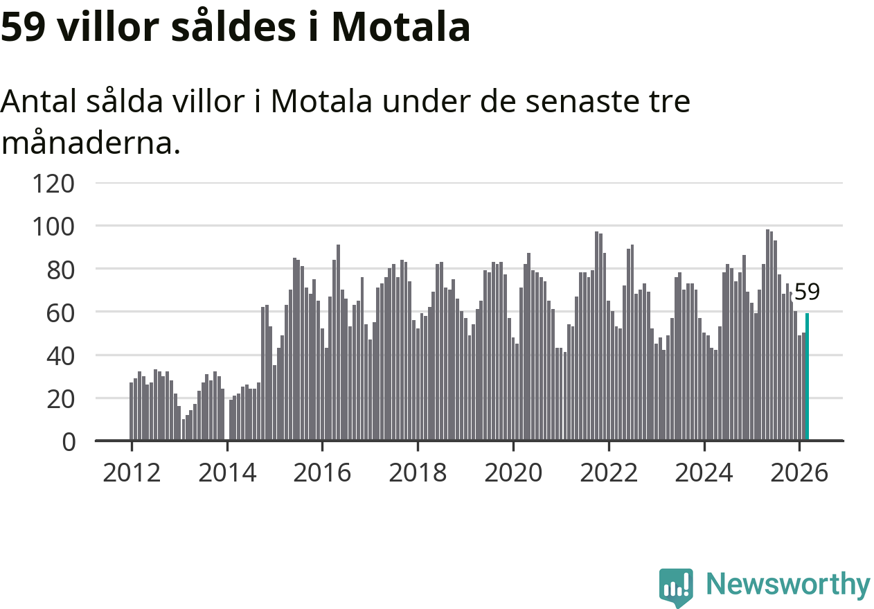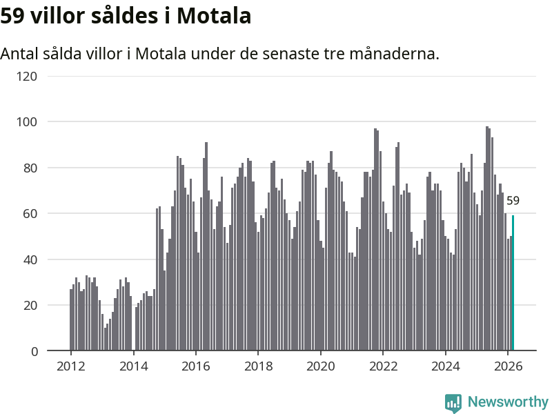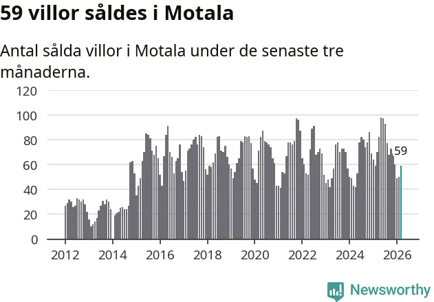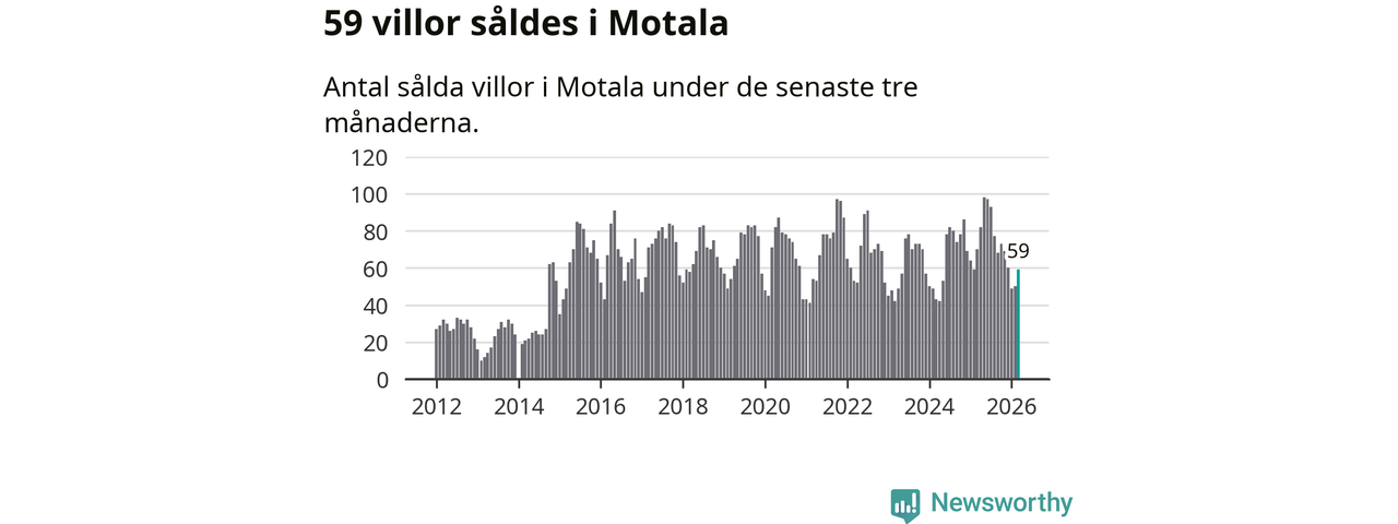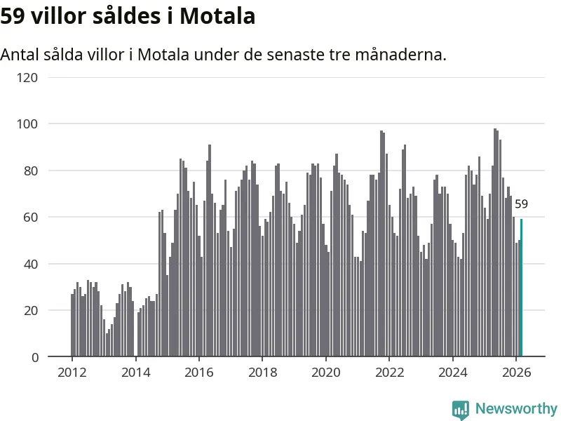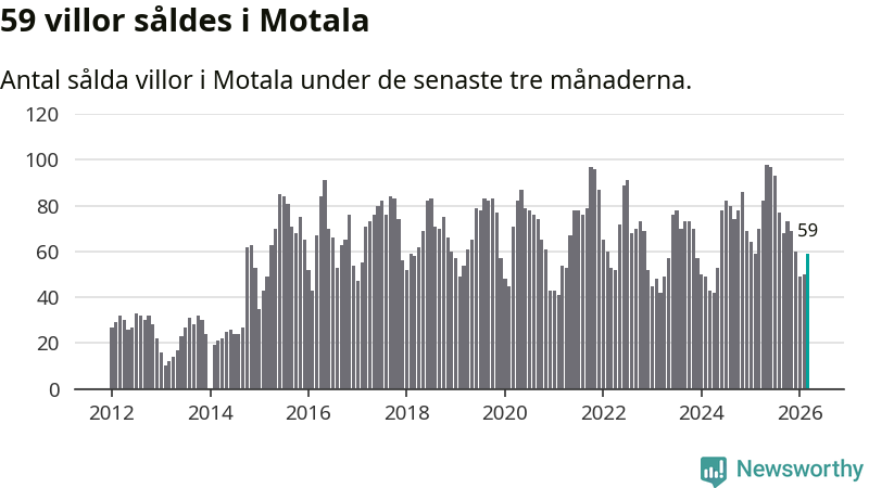 Sammanlagt såldes 59 villor i Motala kommun mellan januari och mars till ett genomsnittligt pris på 3,1 miljoner kronor. I fjol gjordes 70 affärer vid den här tiden på året.