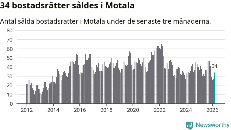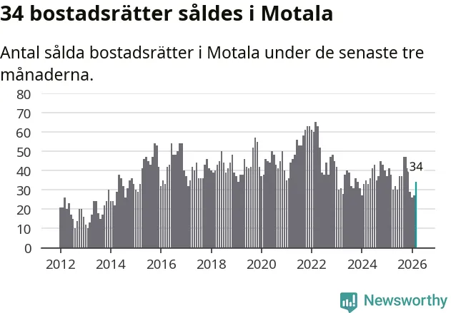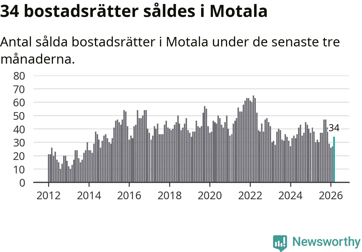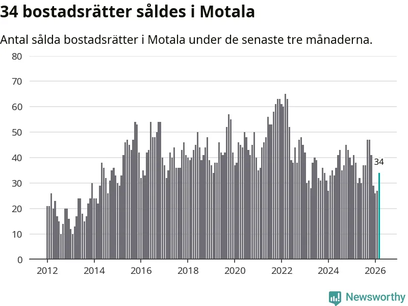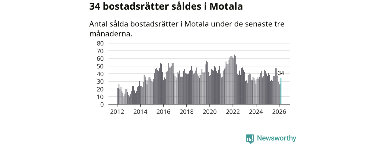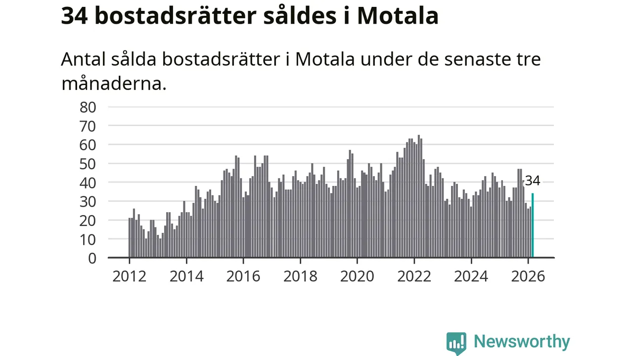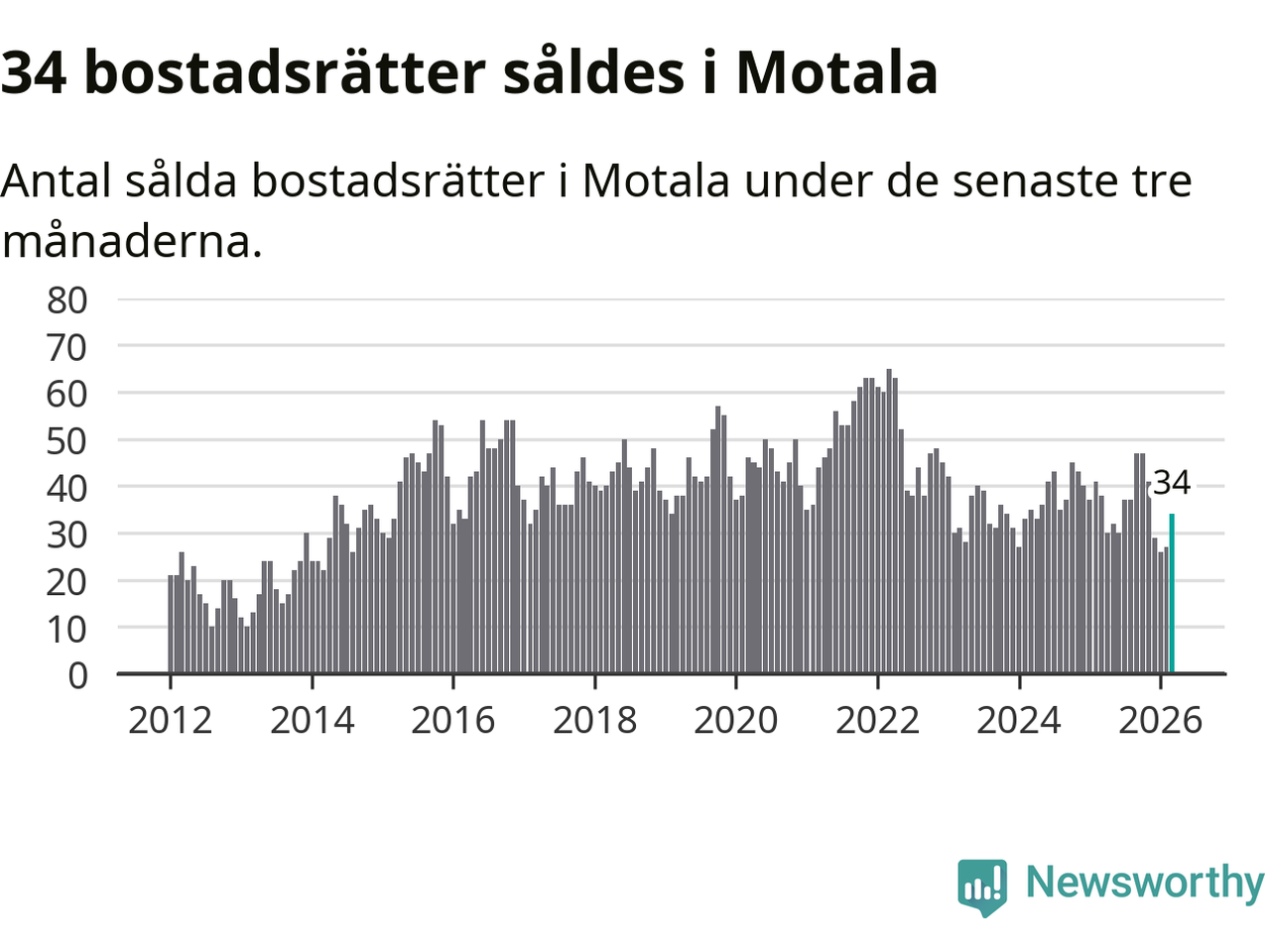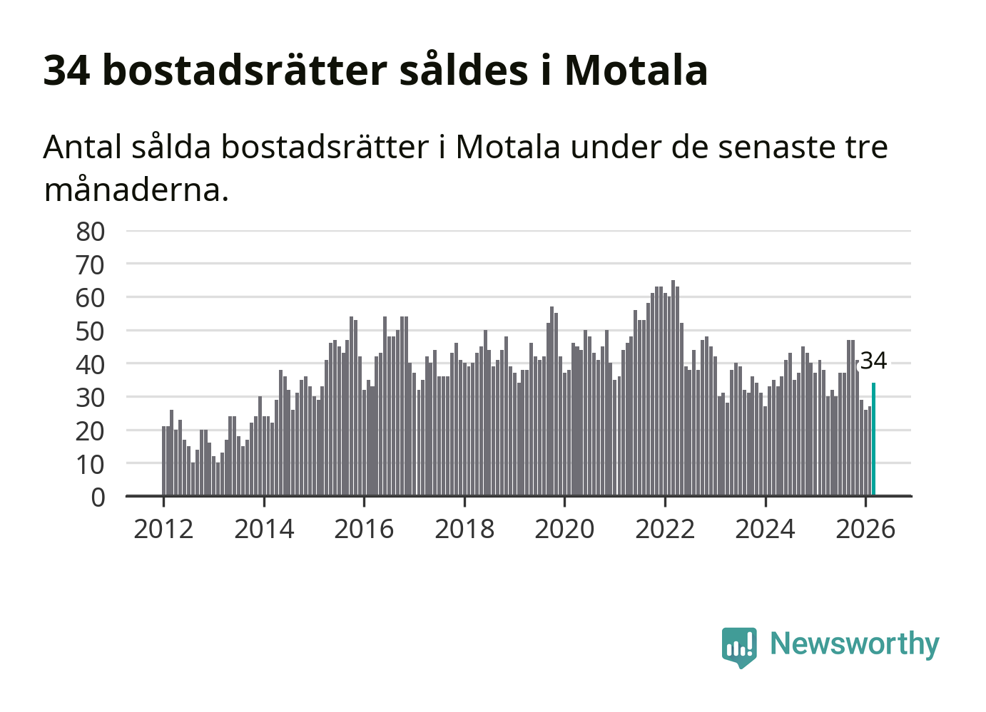 Sammanlagt såldes 34 bostadsrätter i Motala kommun mellan januari och mars till ett genomsnittligt pris på 1,1 miljoner kronor. I fjol gjordes 38 affärer vid den här tiden på året.