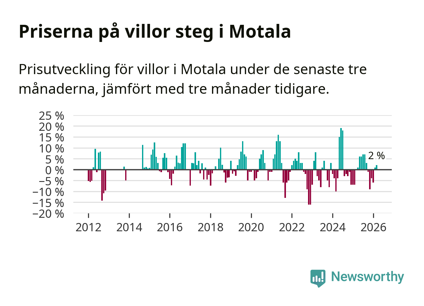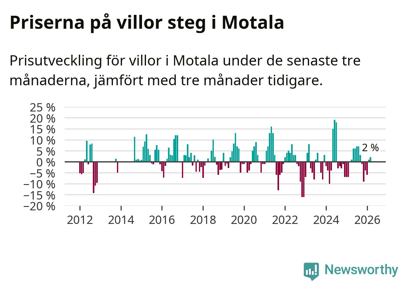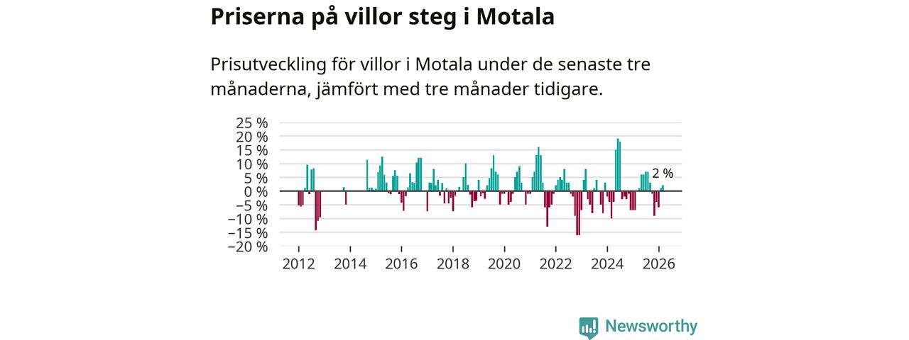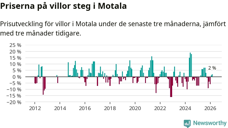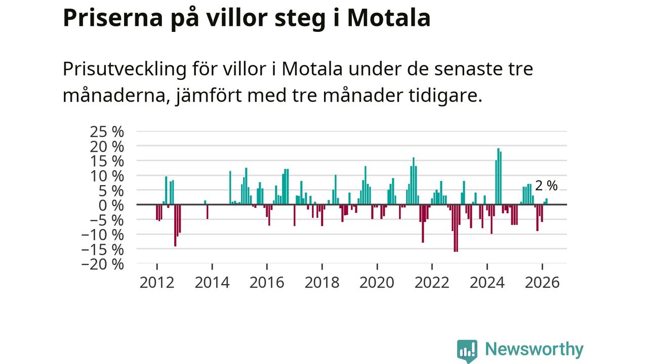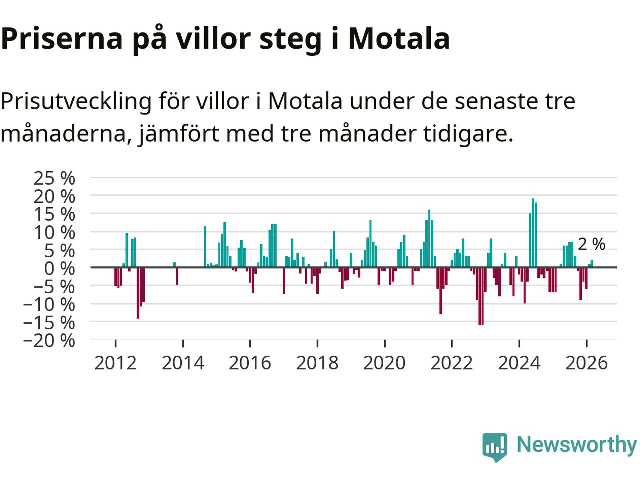 Villapriserna har gått upp i Motala kommun. Medelpriset på försäljningarna under de senaste tre månaderna visar på en uppgång med 2 procent.