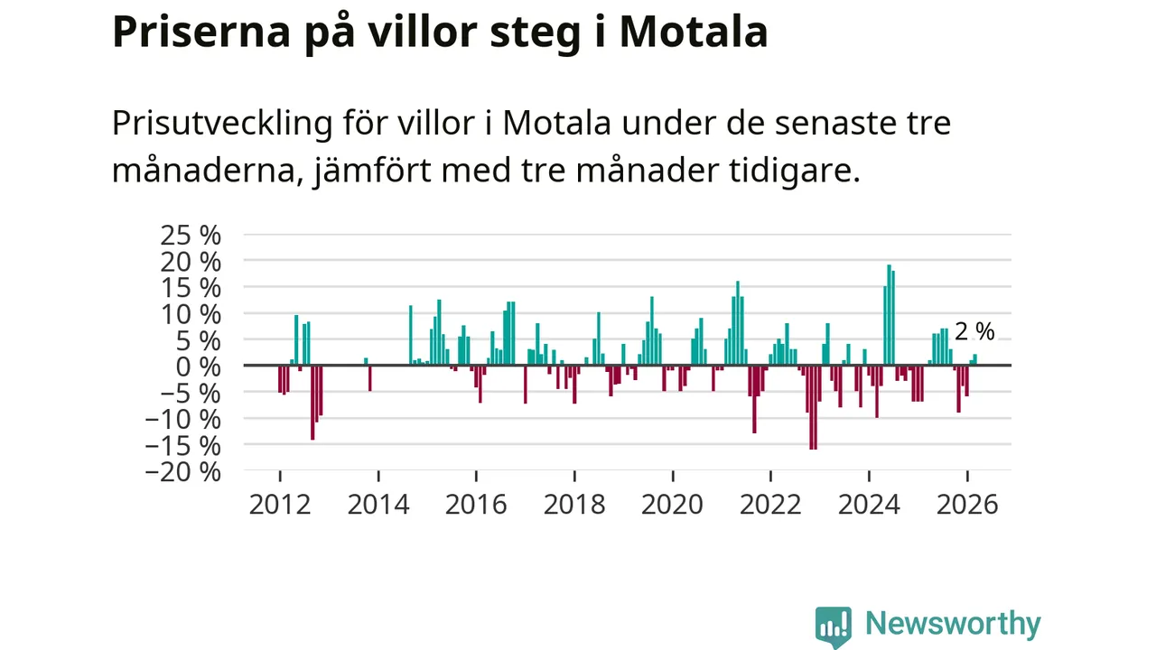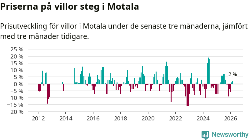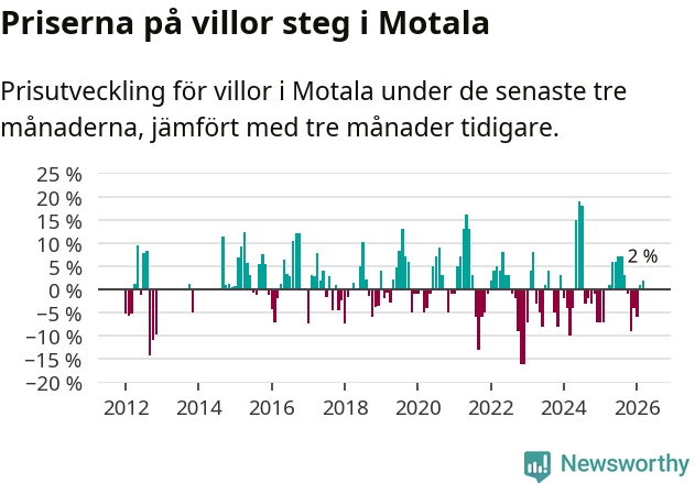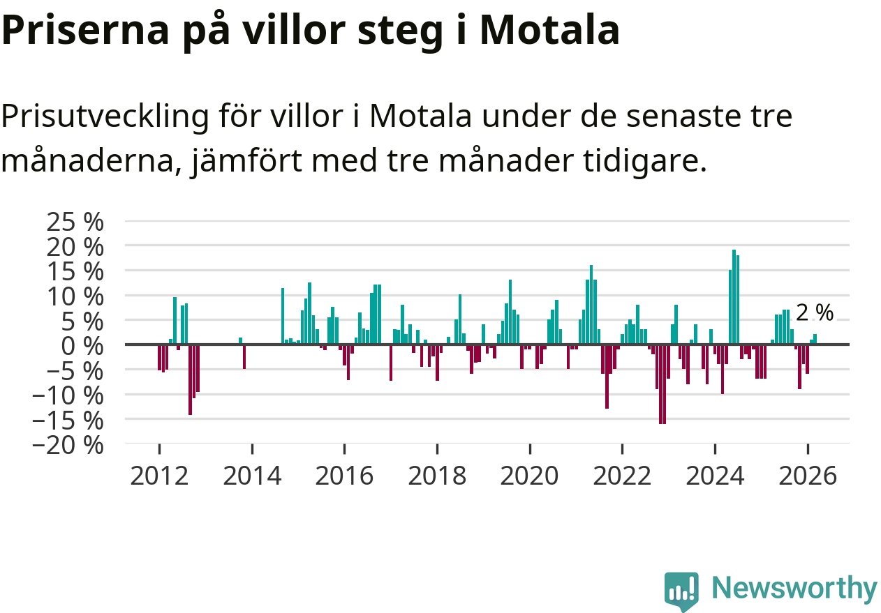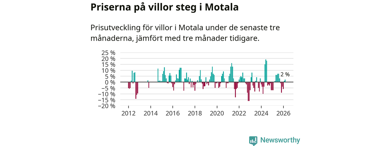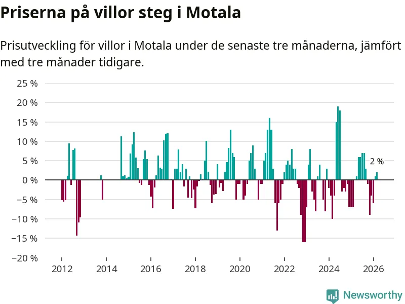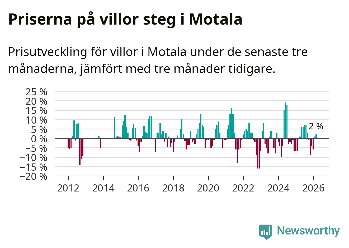 Villapriserna har gått upp i Motala kommun. Medelpriset på försäljningarna under de senaste tre månaderna visar på en uppgång med 2 procent.