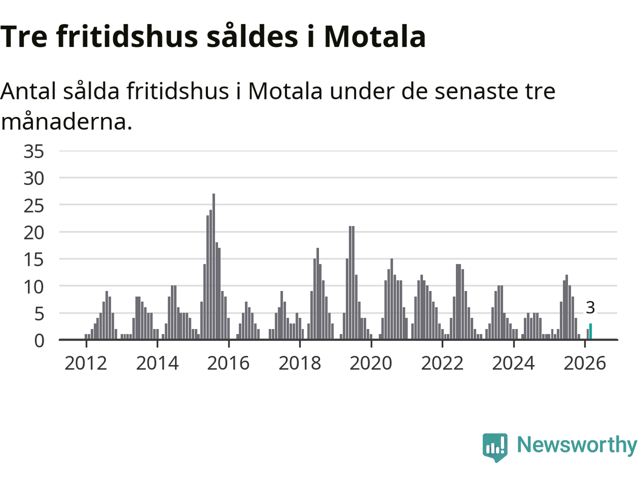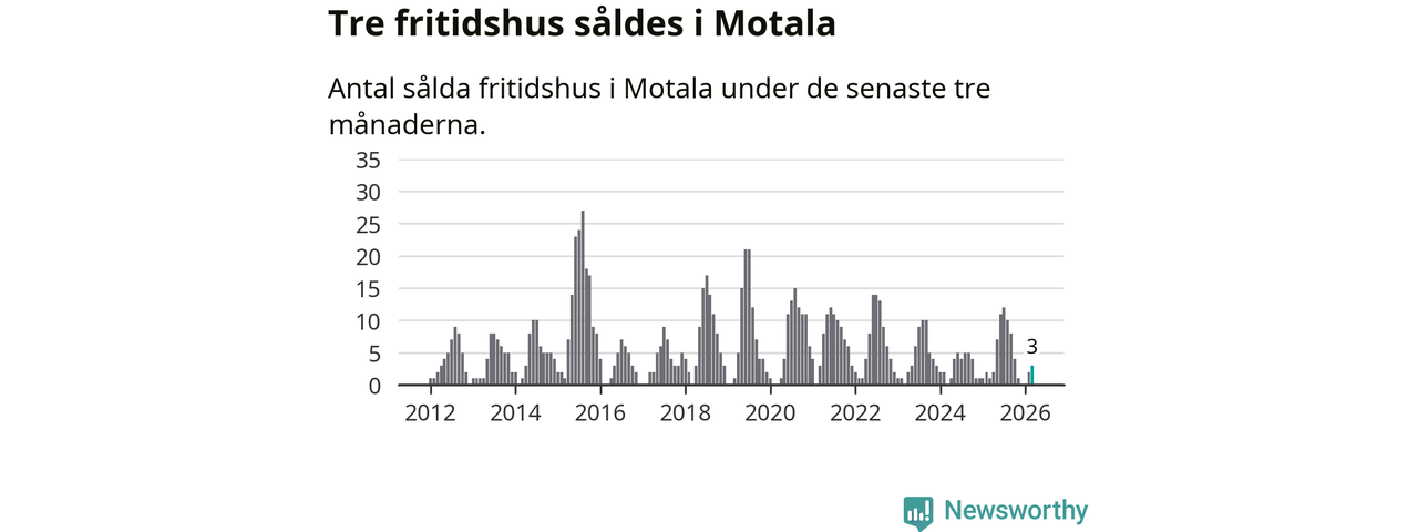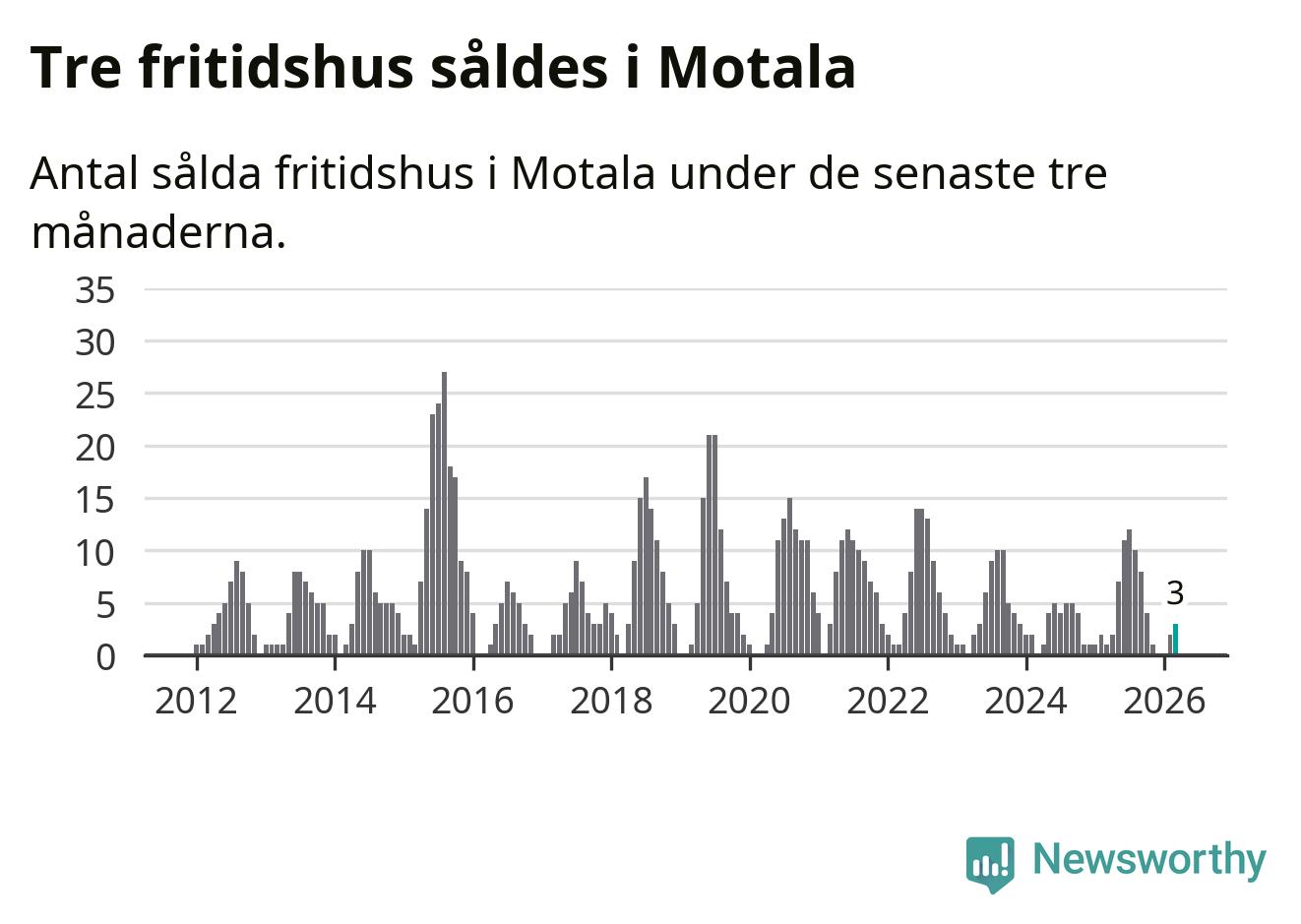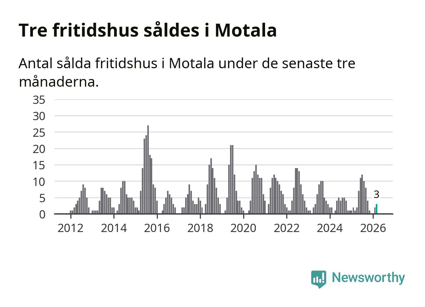Mellan januari och mars gjordes sammanlagt tre affärer med fritidshus i Motala kommun. Det kan jämföras med ett vid motsvarande tid i fjol.