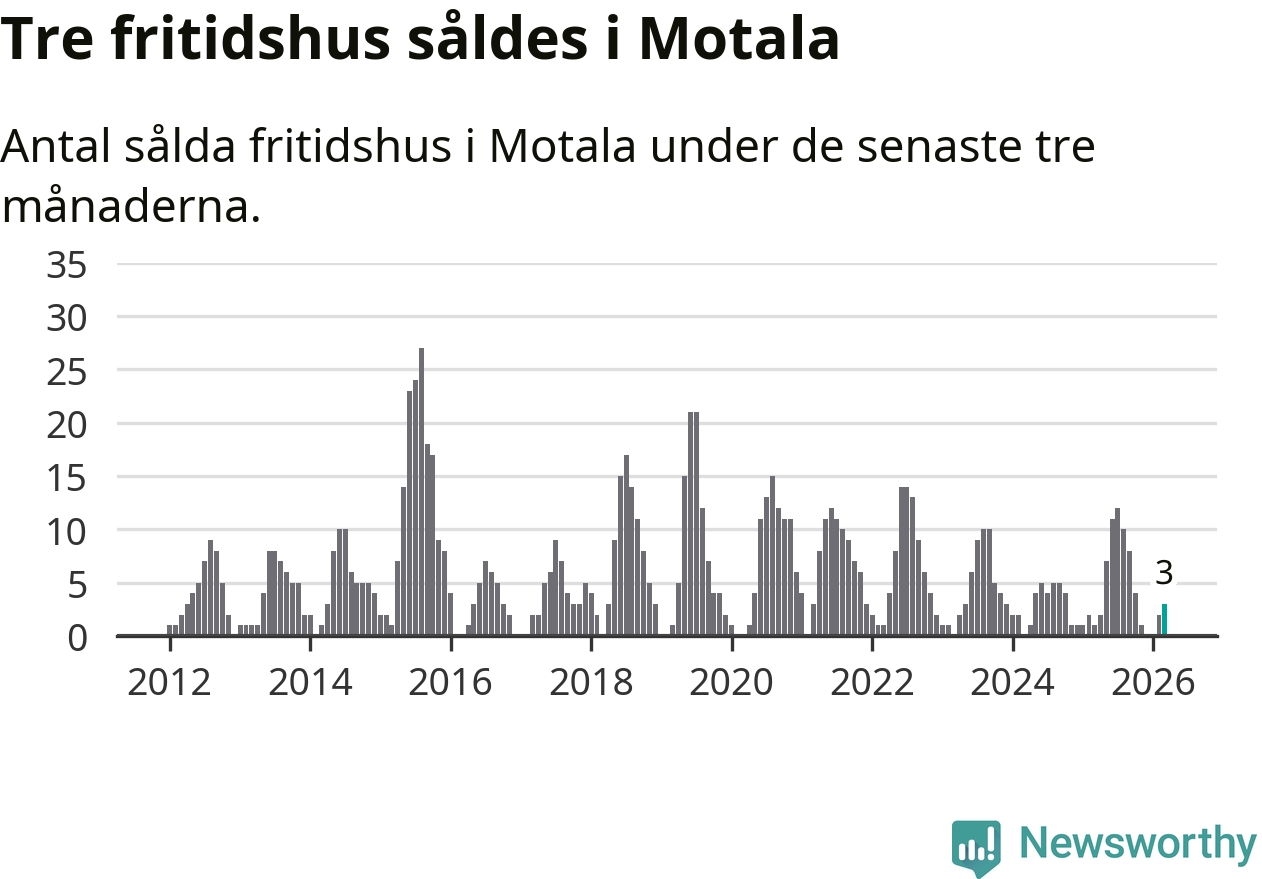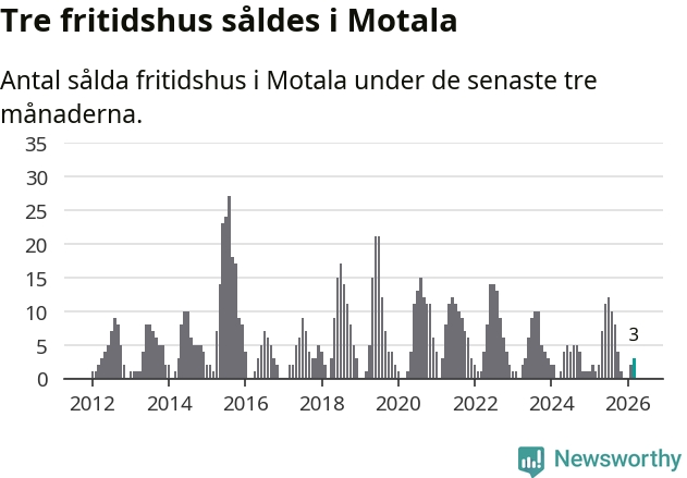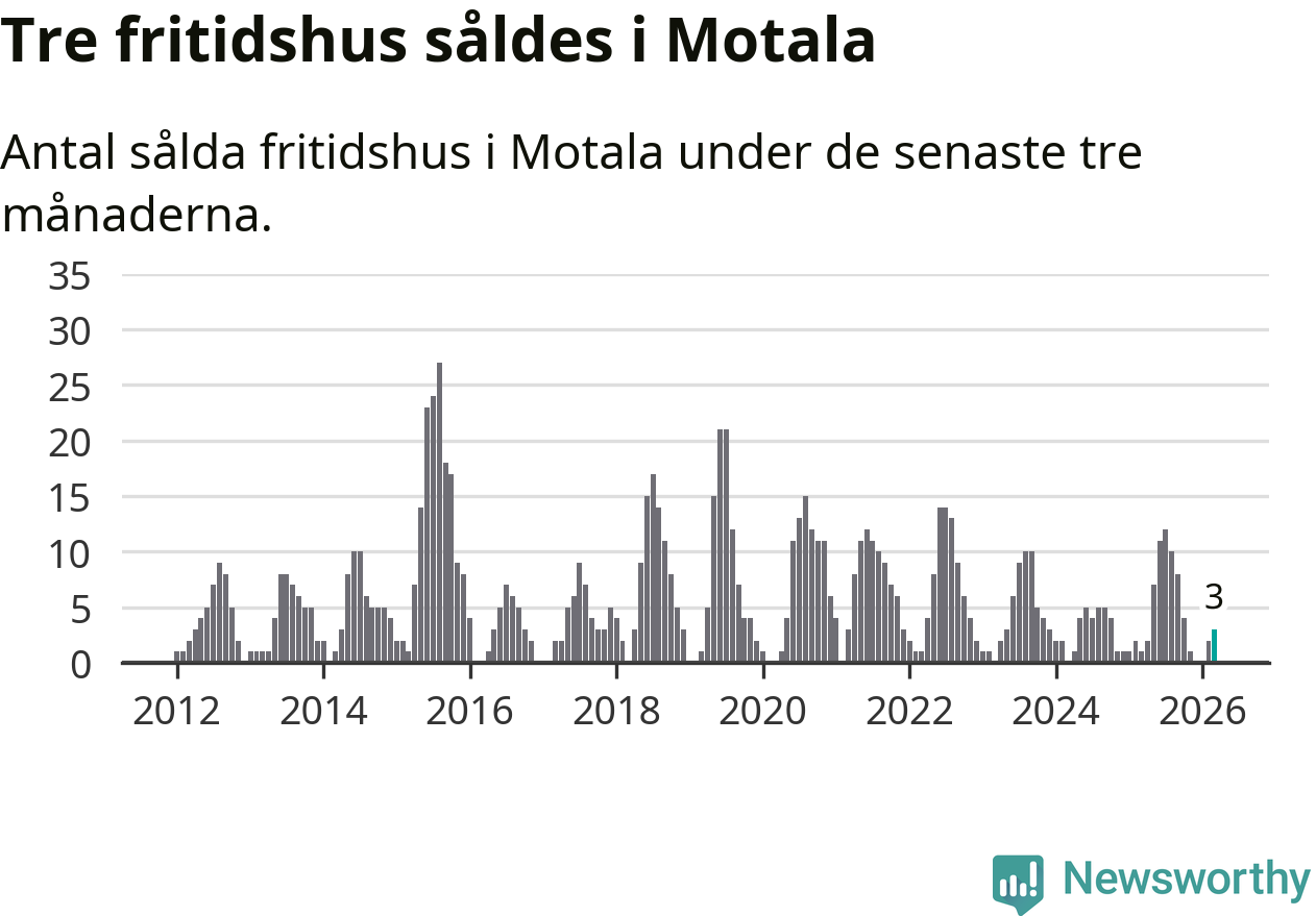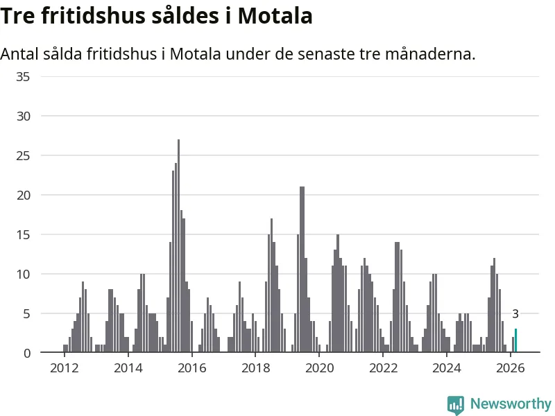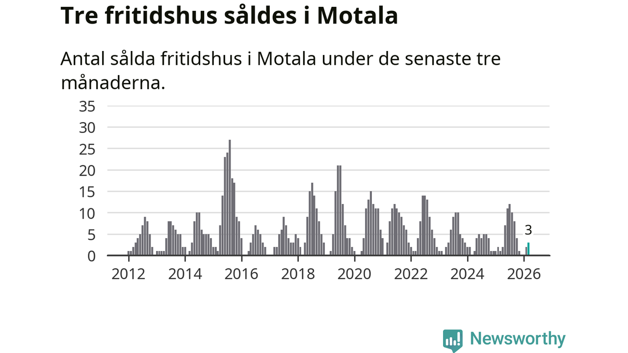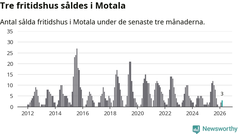 Mellan januari och mars gjordes sammanlagt tre affärer med fritidshus i Motala kommun. Det kan jämföras med ett vid motsvarande tid i fjol.