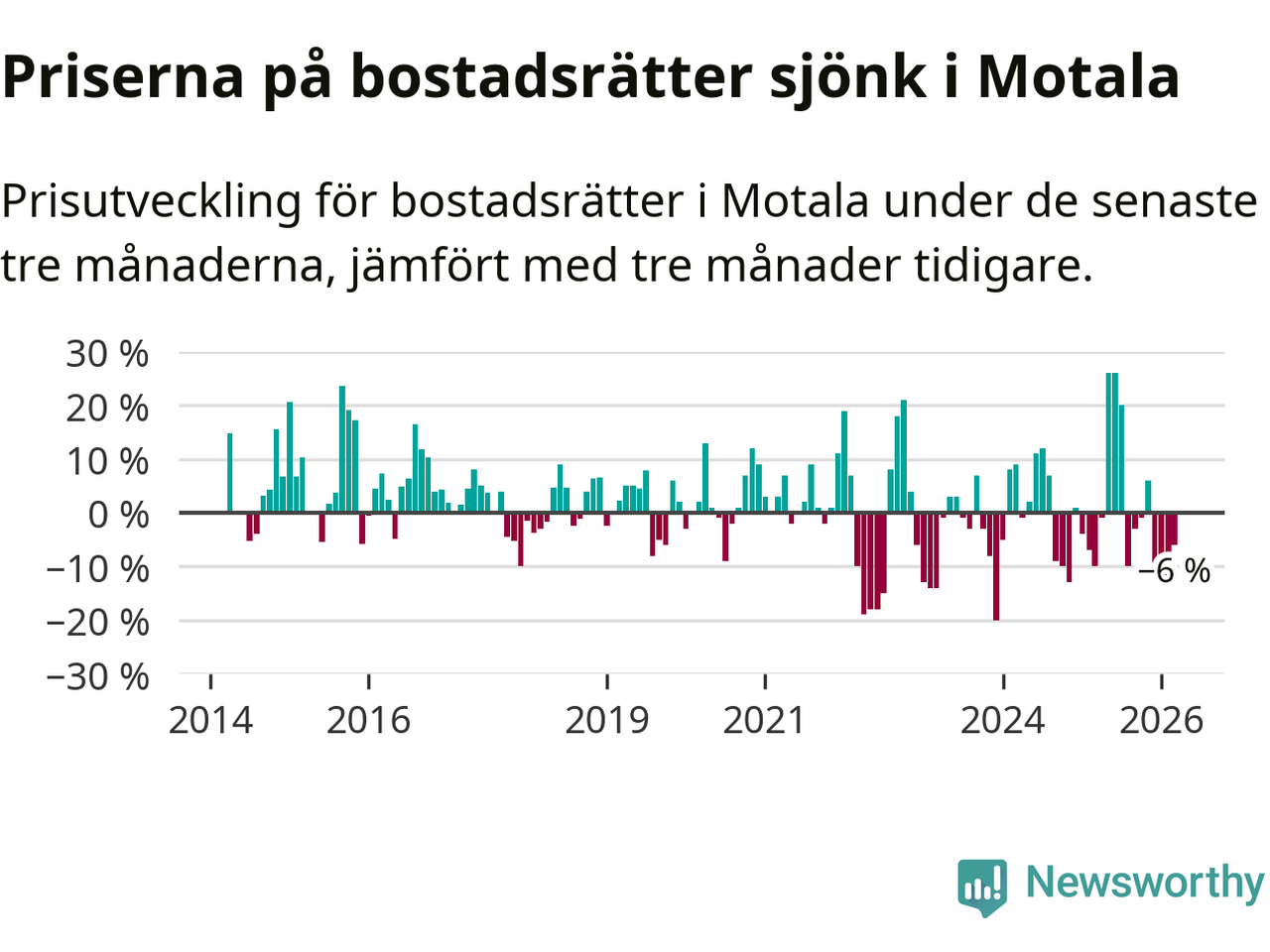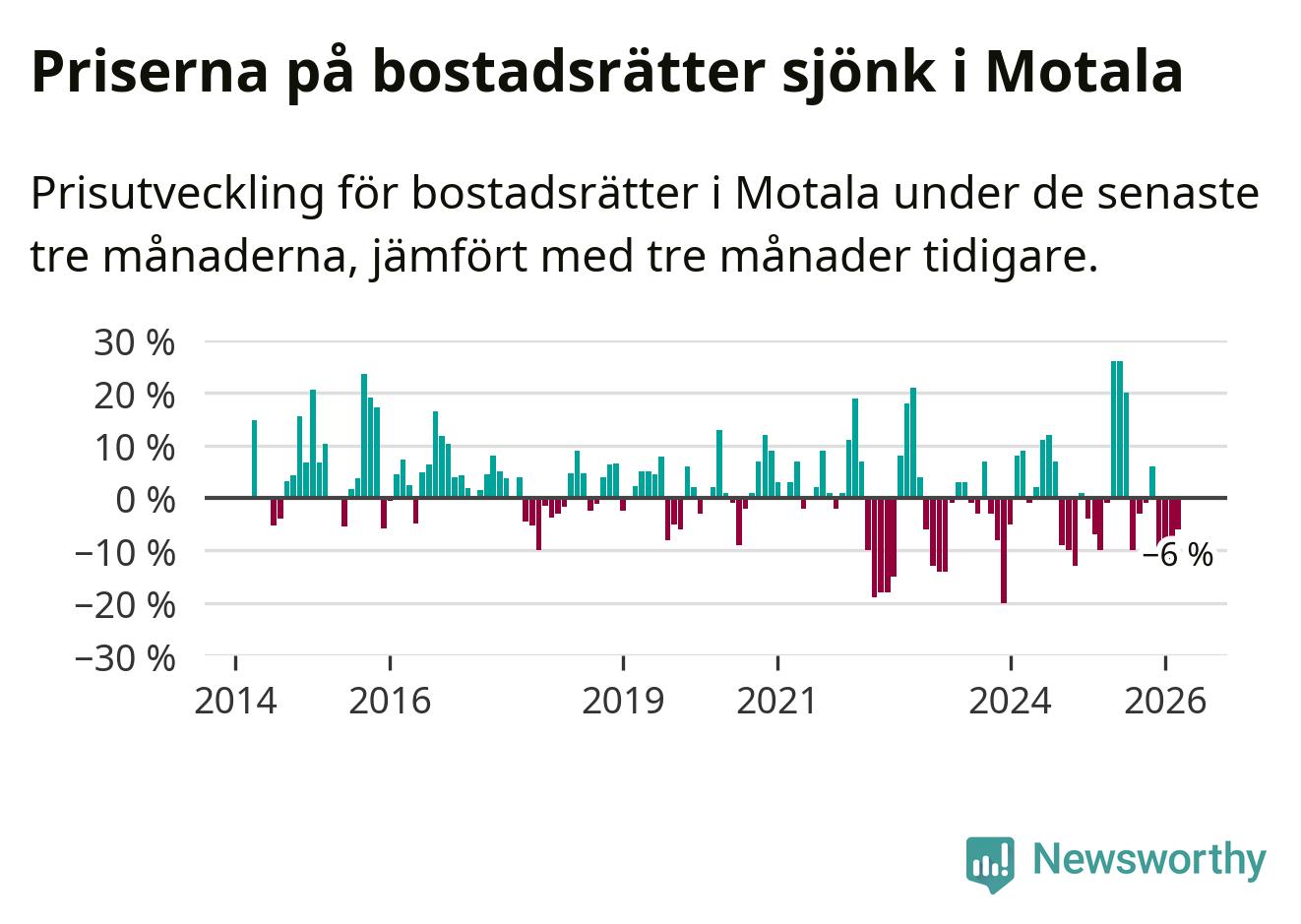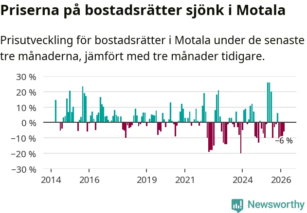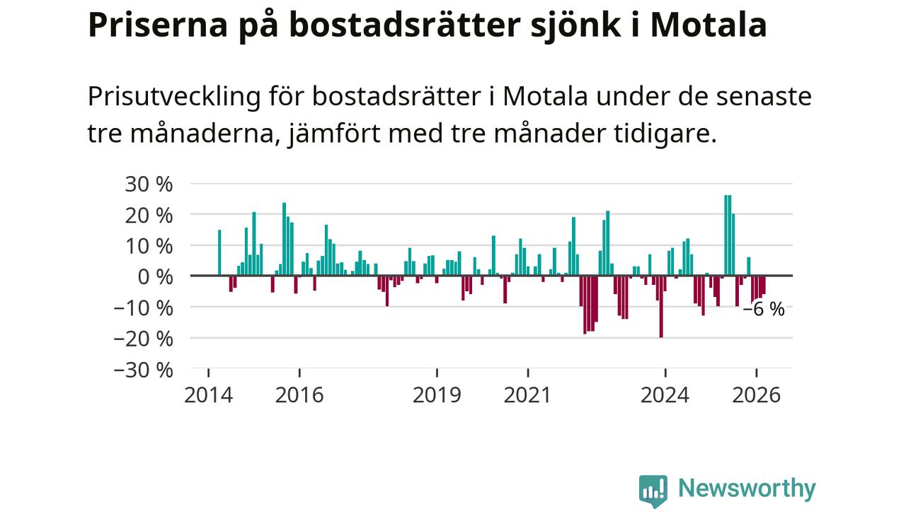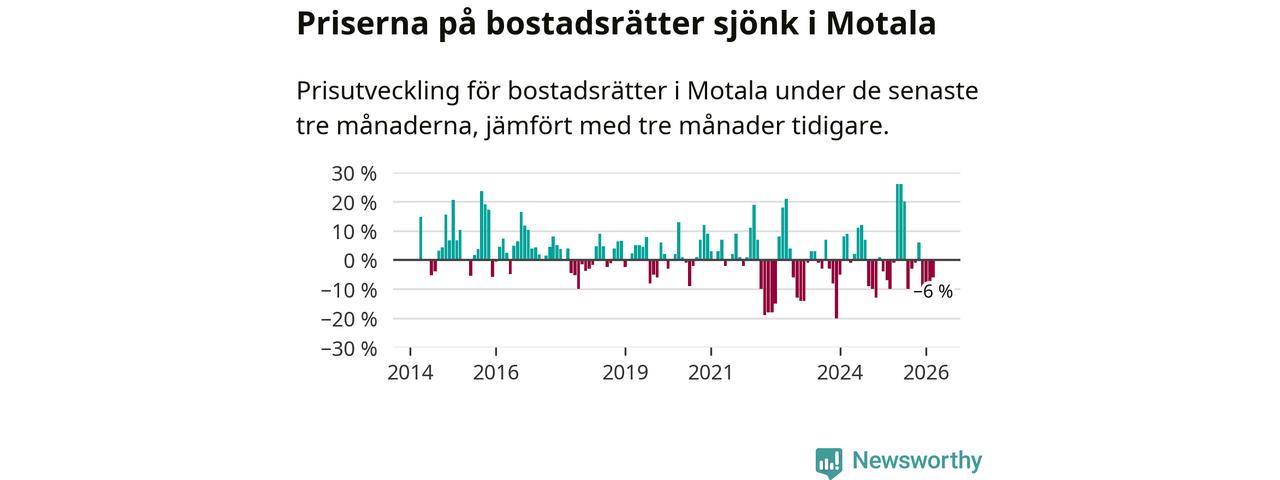 Priserna på bostadsrätter har gått ner i Motala kommun. Medelpriset på försäljningarna under de senaste tre månaderna visar på en nedgång med 6 procent.