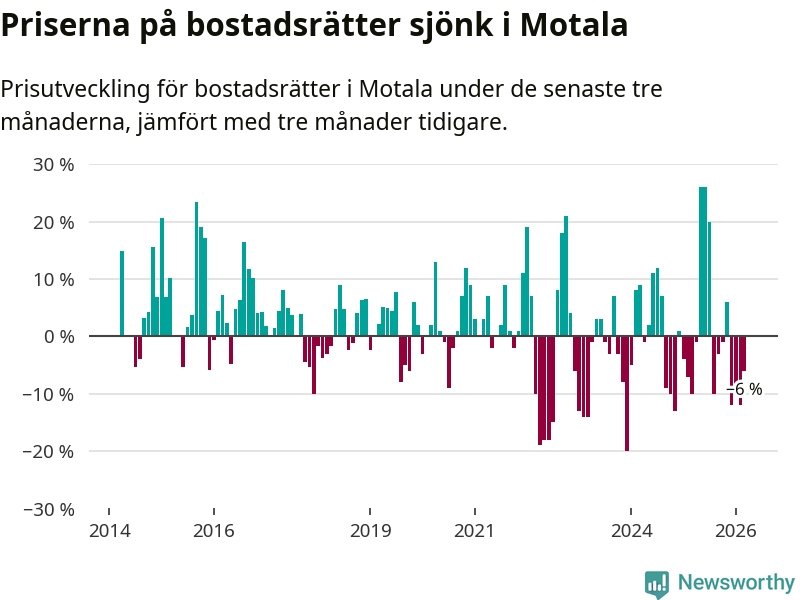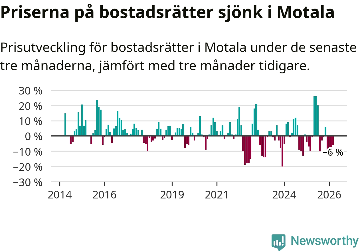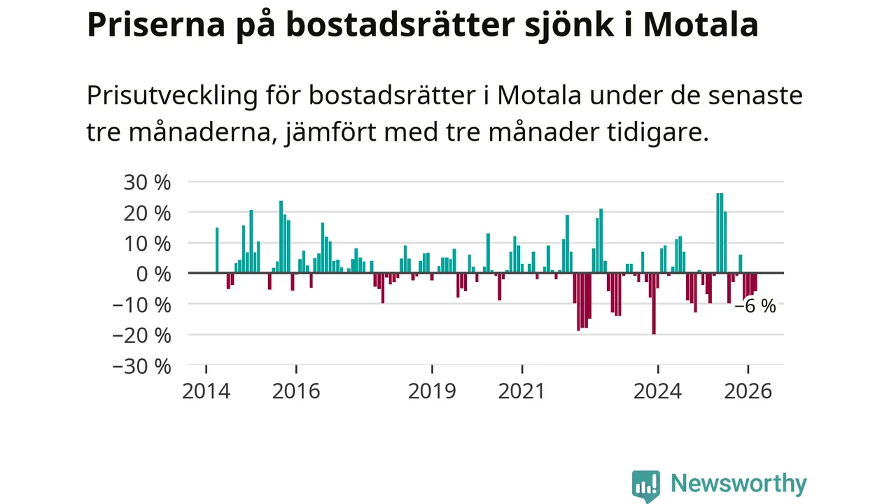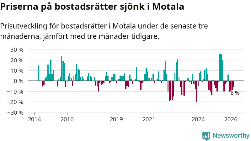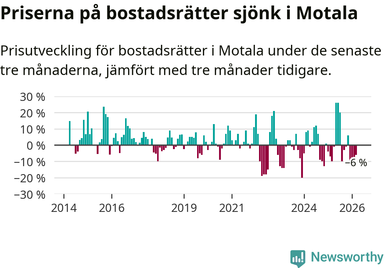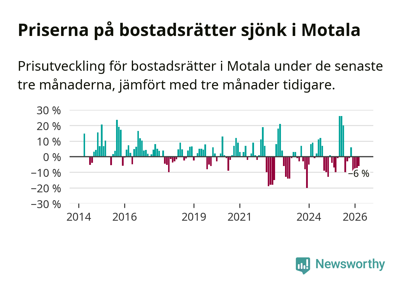 Priserna på bostadsrätter har gått ner i Motala kommun. Medelpriset på försäljningarna under de senaste tre månaderna visar på en nedgång med 6 procent.