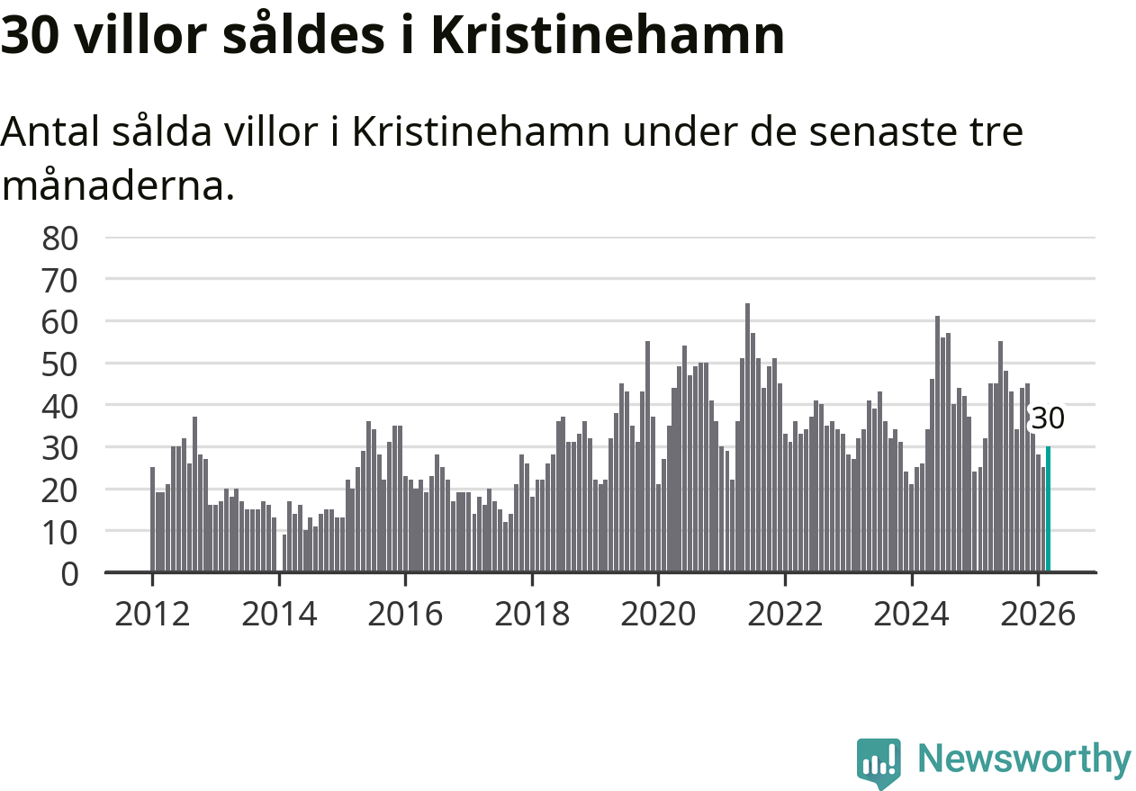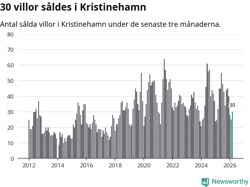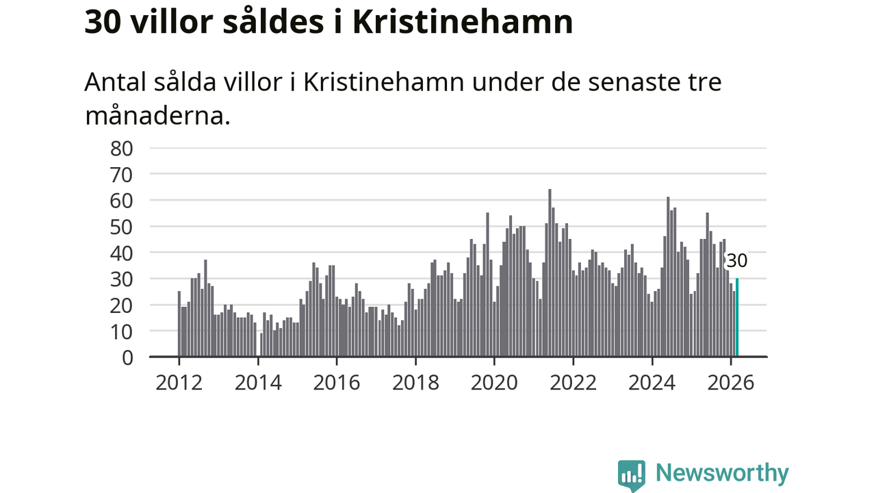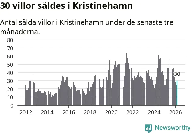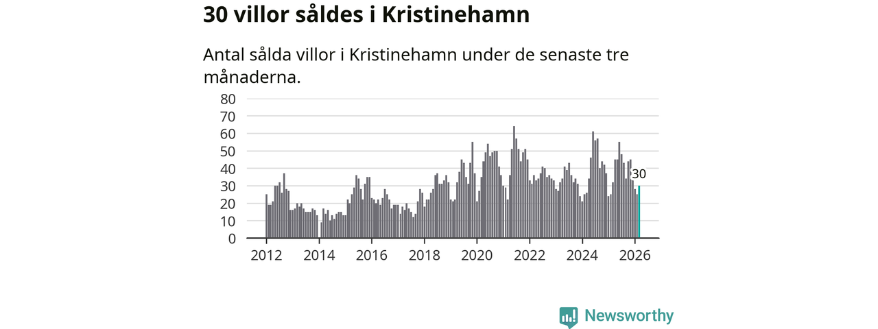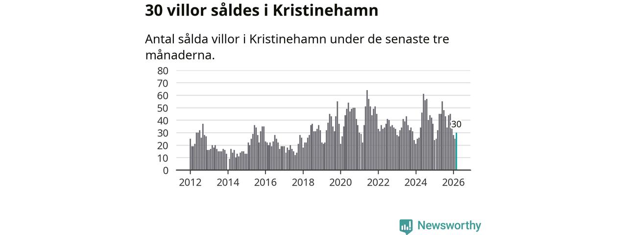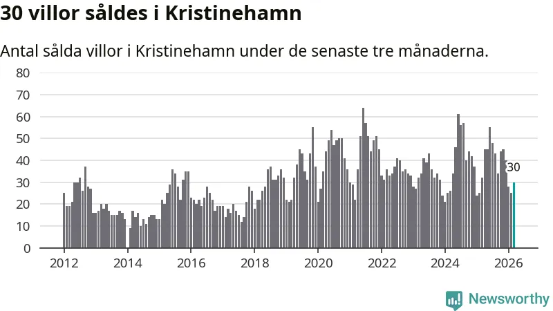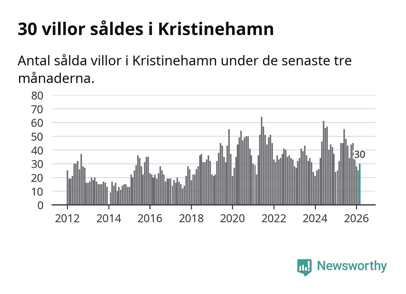 Mellan januari och mars gjordes sammanlagt 30 affärer med villor i Kristinehamns kommun. Det kan jämföras med 32 vid motsvarande tid i fjol.