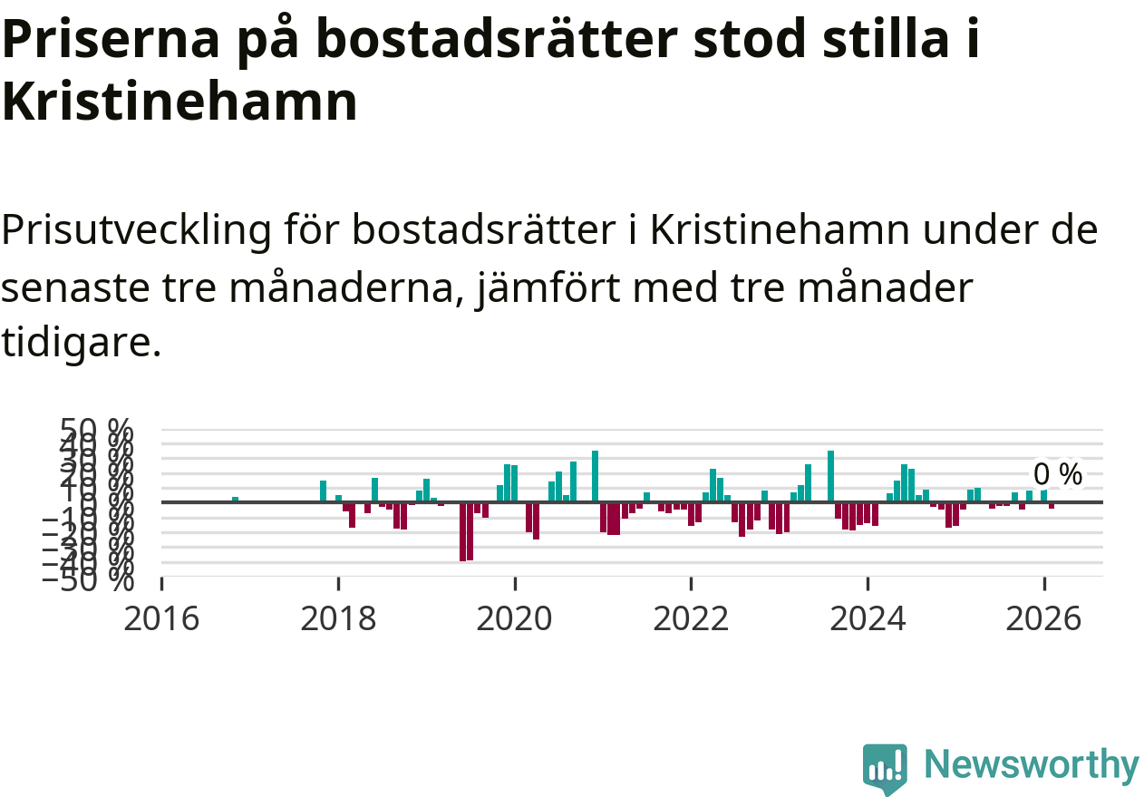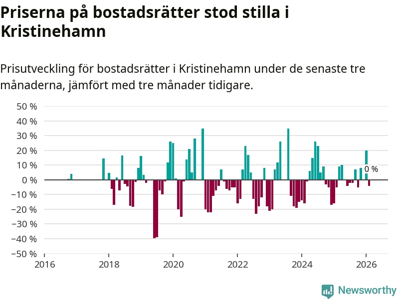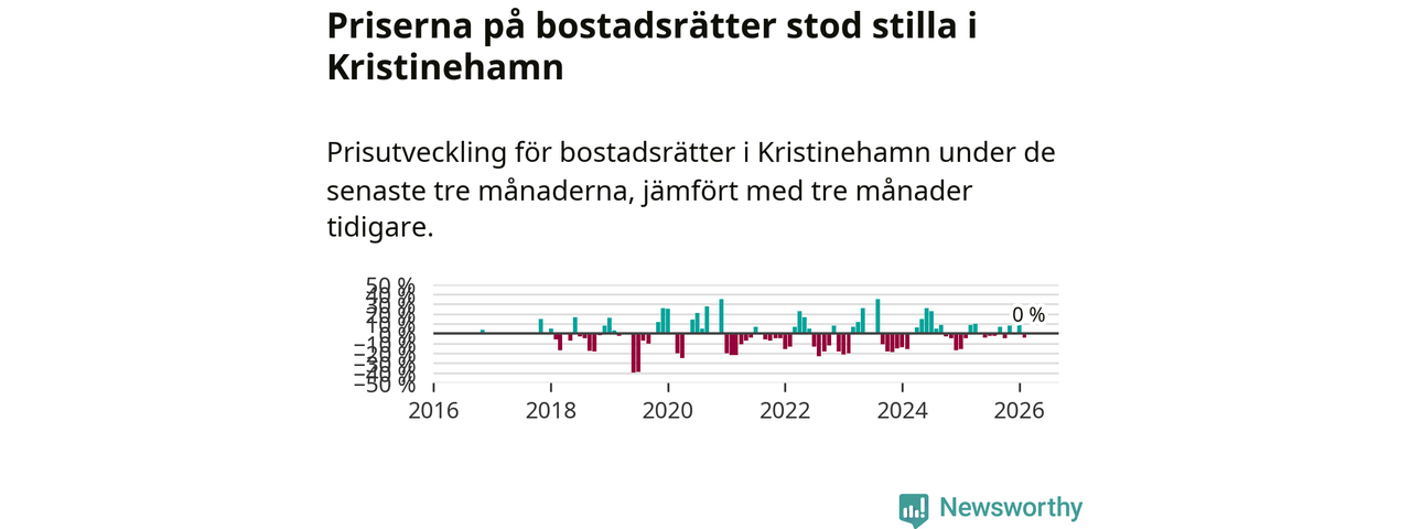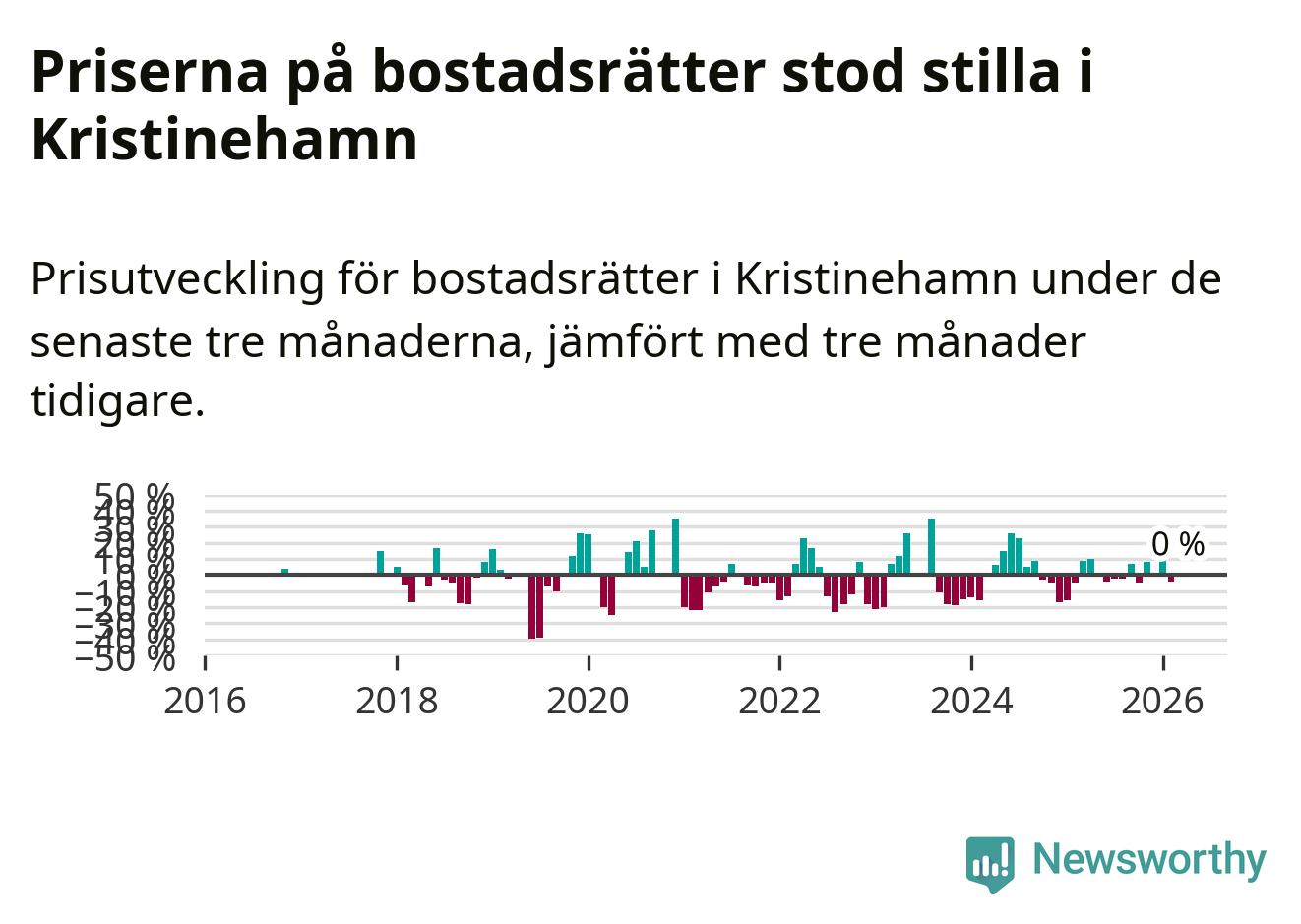 Medelpriset på försäljningarna i Kristinehamns kommun låg på i stort sett samma nivå som för tre månader sedan. I hela Värmland däremot sjunker priserna på bostadsrätter. I hela länet noterades en prisnedgång på 4 procent.
