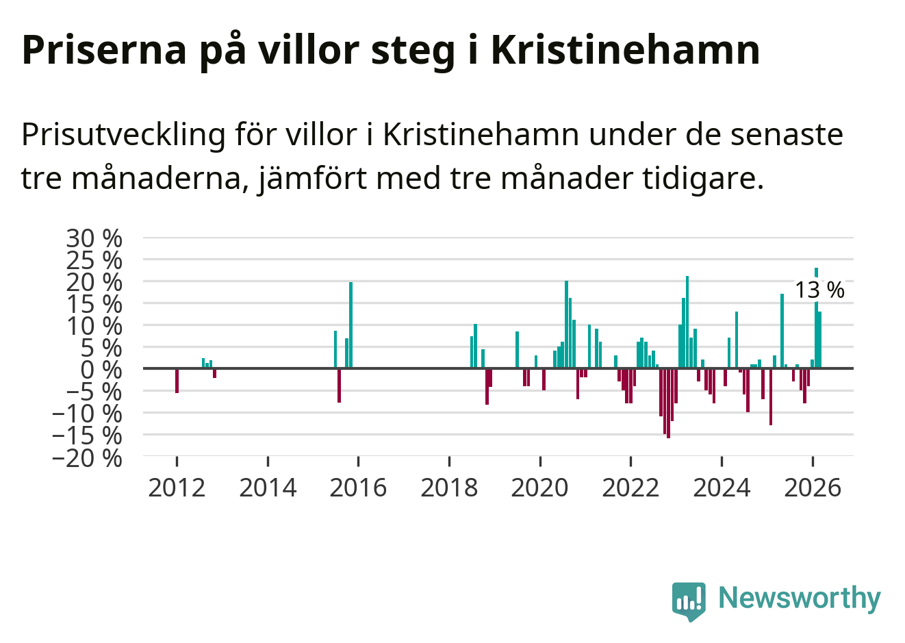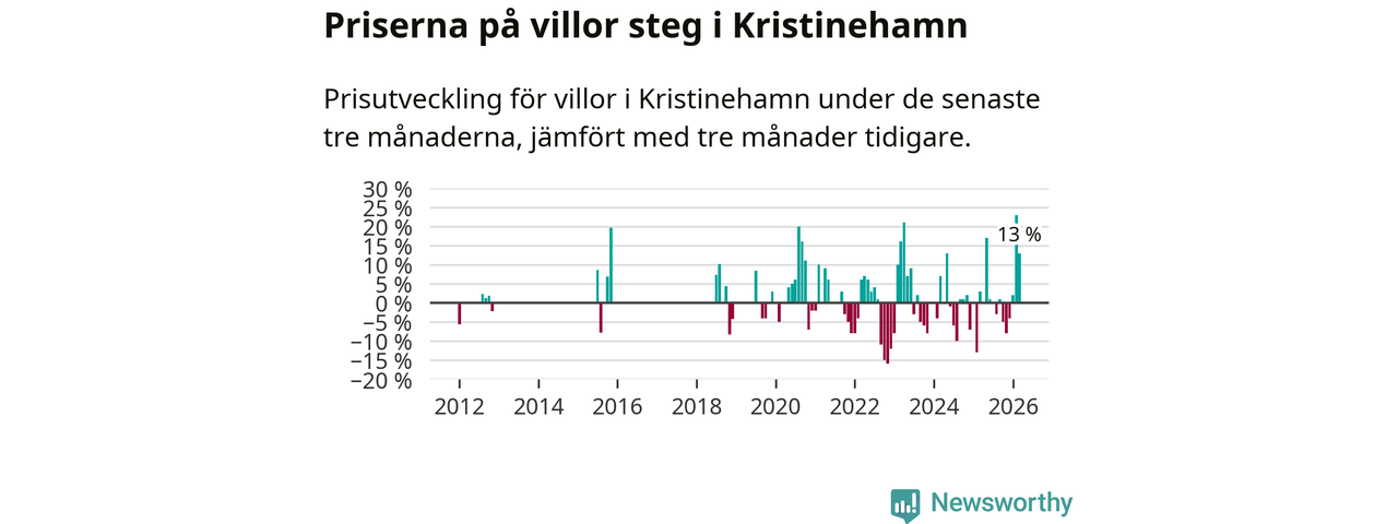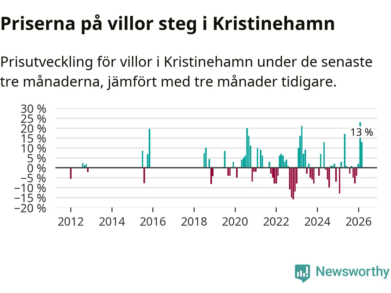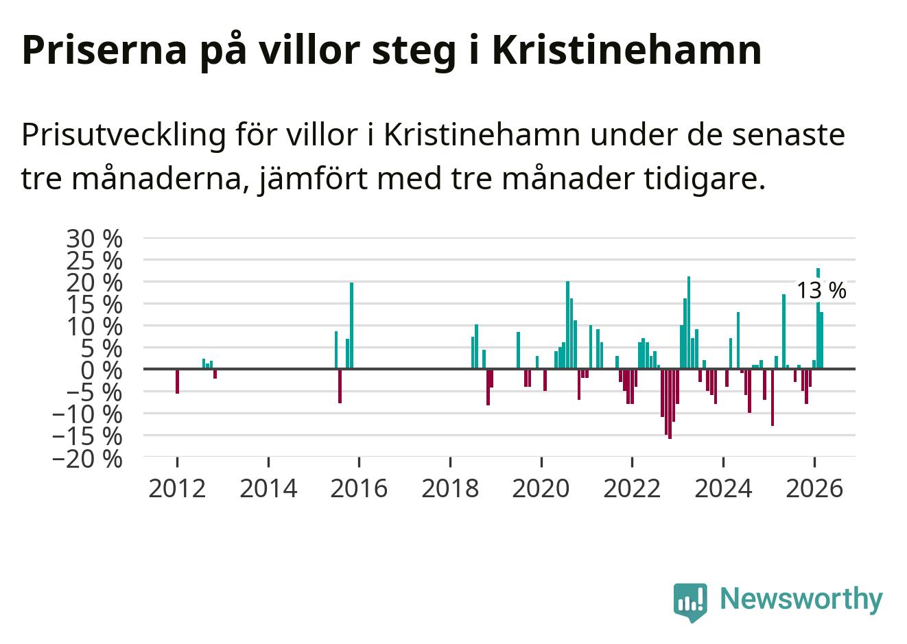 Statistiken visar även på en stor prisuppgång i Kristinehamns kommun. Medelpriset på försäljningarna av villor i kommunen var 13 procent högre än för tre månader sedan. Även i hela Värmland ökar villapriserna. I hela länet noterades en prisuppgång på 3 procent.