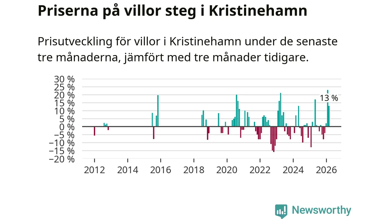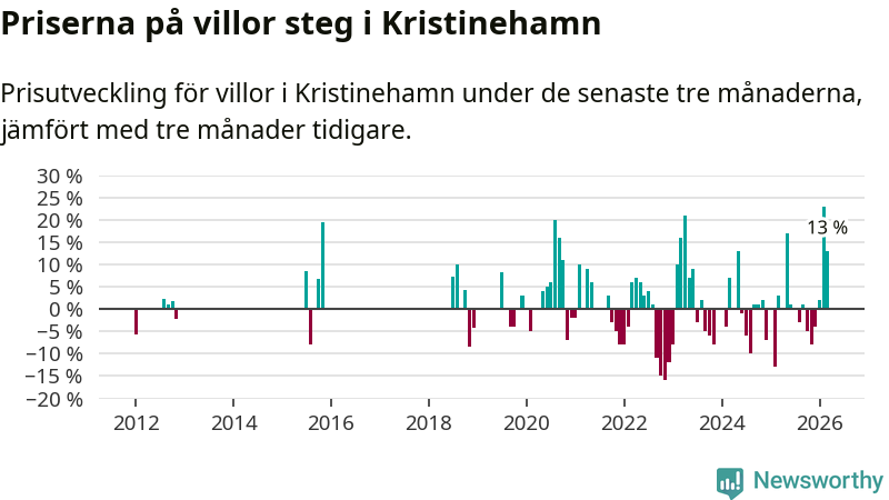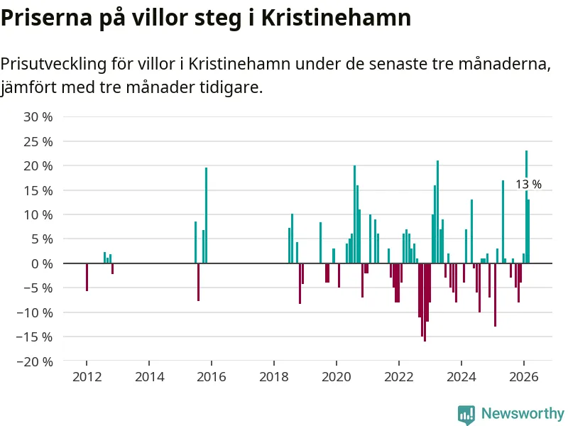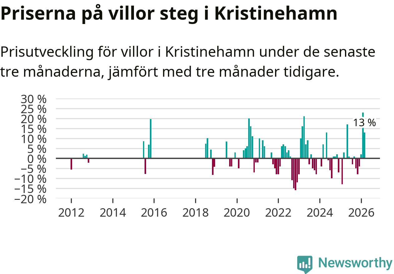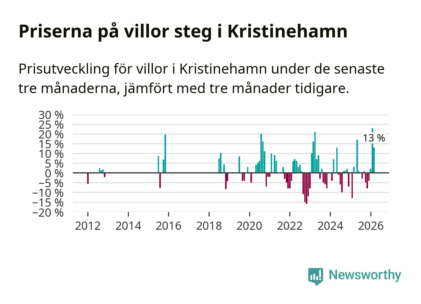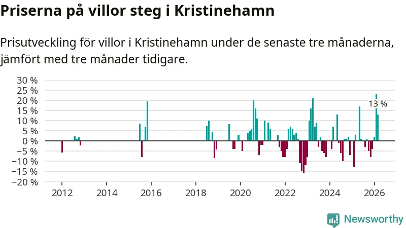 Statistiken visar även på en stor prisuppgång i Kristinehamns kommun. Medelpriset på försäljningarna av villor i kommunen var 13 procent högre än för tre månader sedan. Även i hela Värmland ökar villapriserna. I hela länet noterades en prisuppgång på 3 procent.