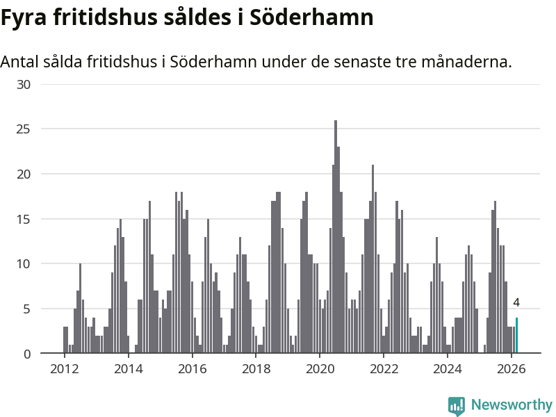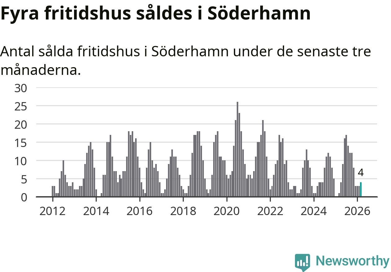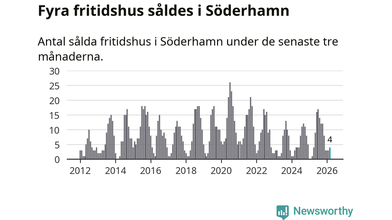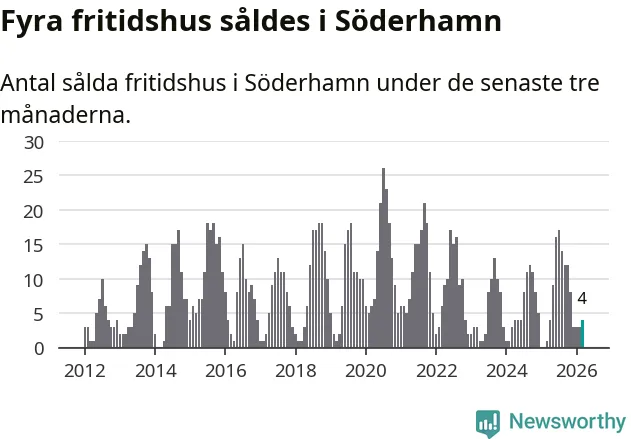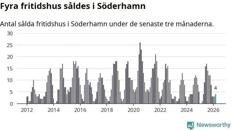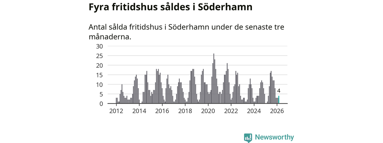 Mellan januari och mars gjordes sammanlagt fyra affärer med fritidshus i Söderhamns kommun. Det kan jämföras med ett vid motsvarande tid i fjol.