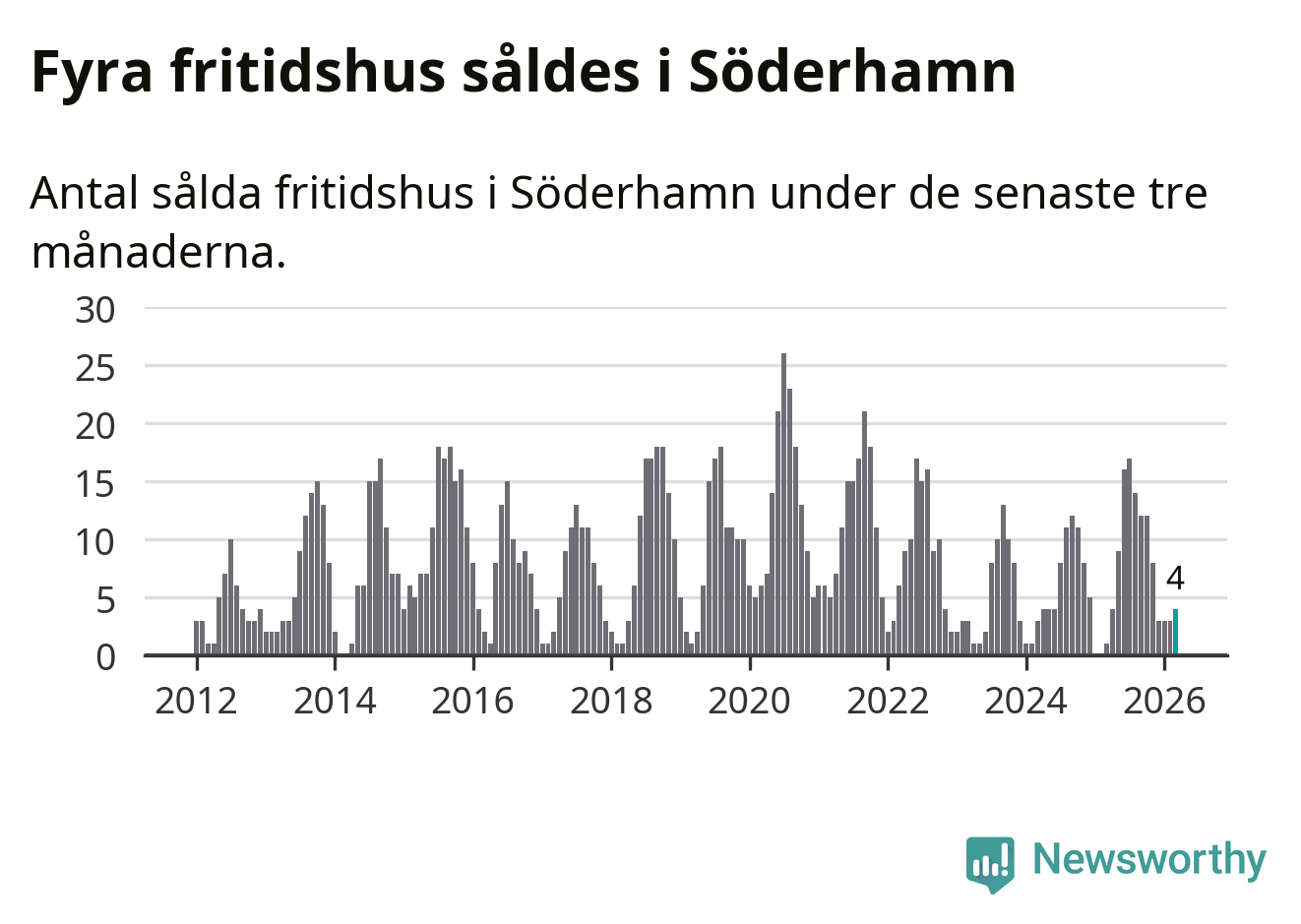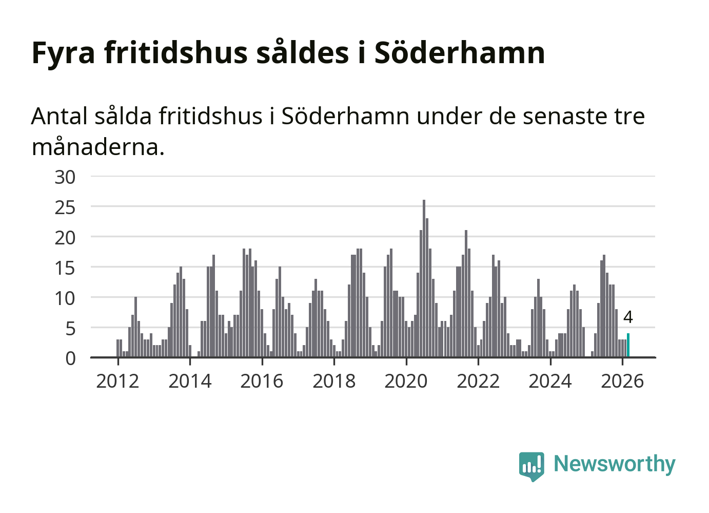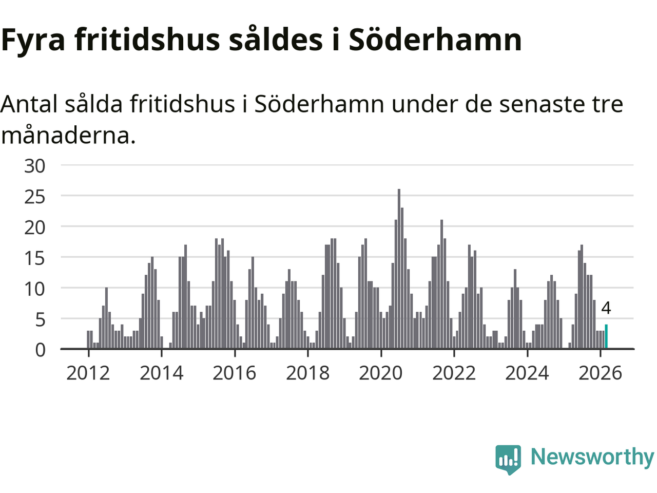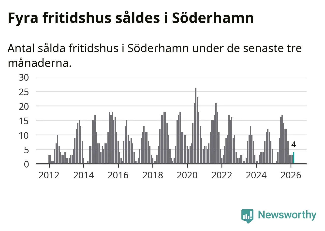 Mellan januari och mars gjordes sammanlagt fyra affärer med fritidshus i Söderhamns kommun. Det kan jämföras med ett vid motsvarande tid i fjol.