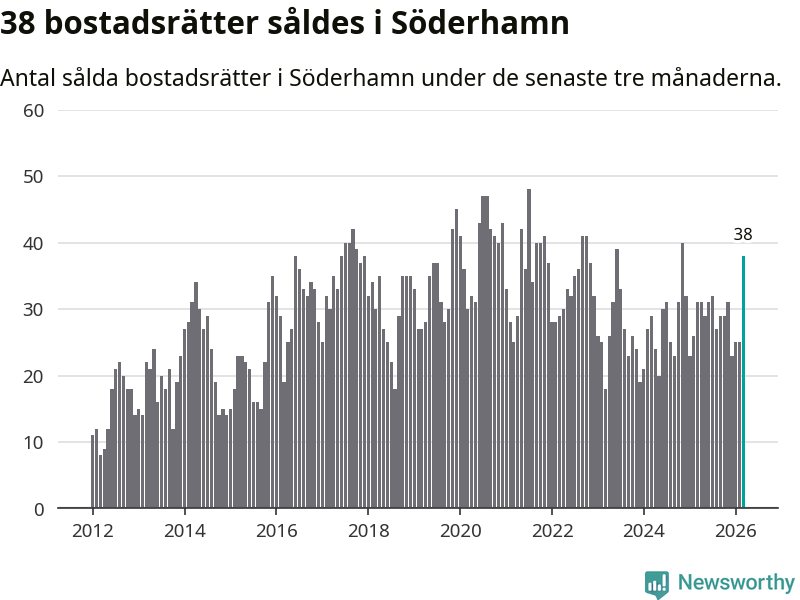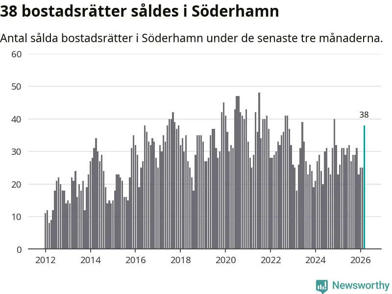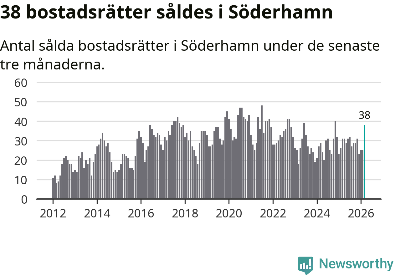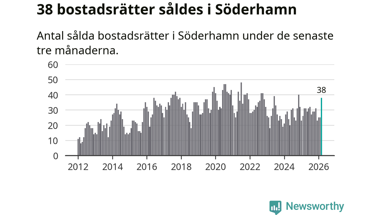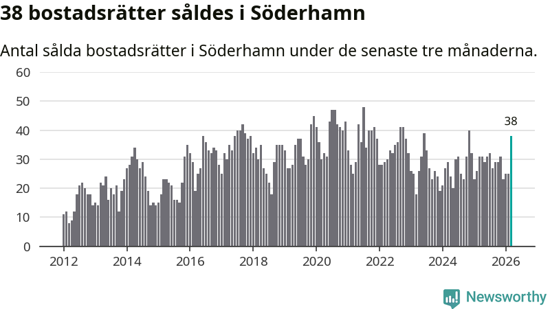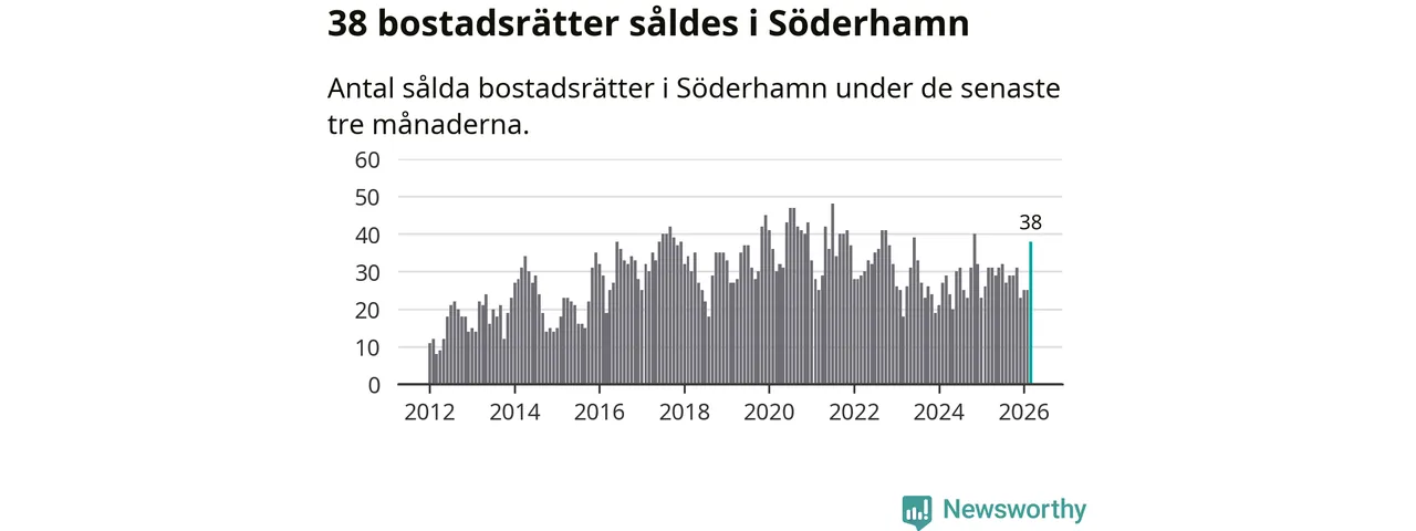 Mellan januari och mars såldes 38 bostadsrätter i Söderhamns kommun. Det är relativt många sett till aktiviteten på bostadsmarknaden i kommunen under de senaste tolv månaderna, samt det historiska snittet för den här tiden på året.