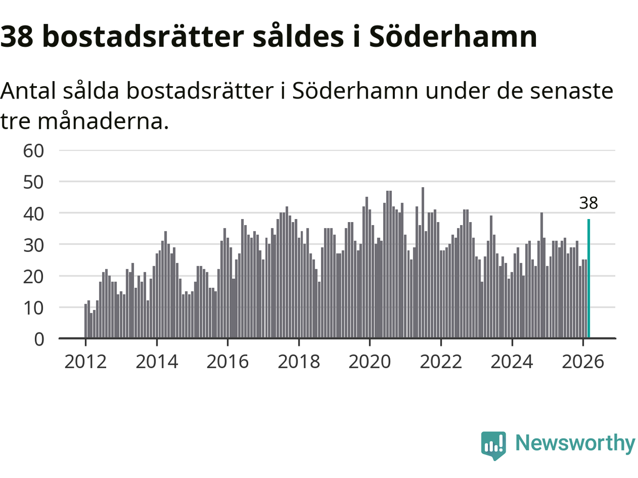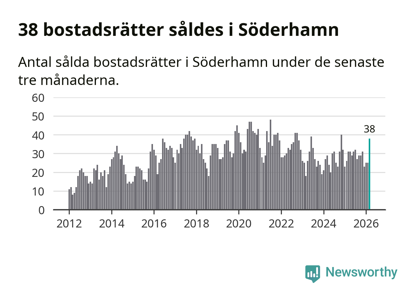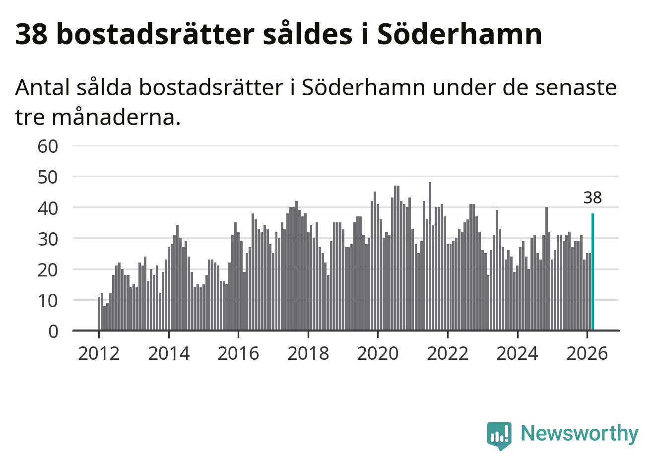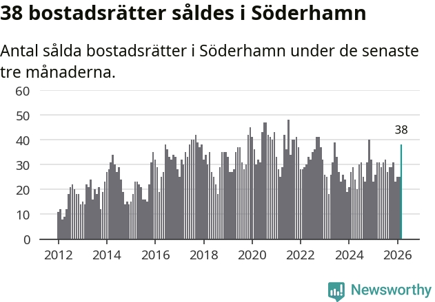 Mellan januari och mars såldes 38 bostadsrätter i Söderhamns kommun. Det är relativt många sett till aktiviteten på bostadsmarknaden i kommunen under de senaste tolv månaderna, samt det historiska snittet för den här tiden på året.