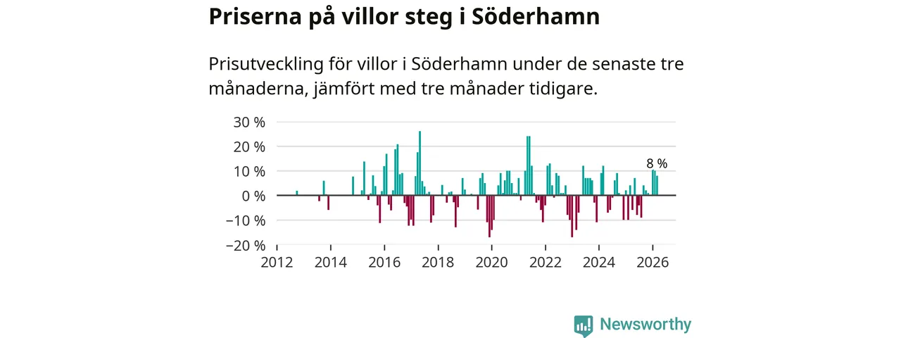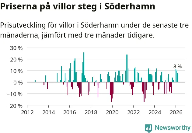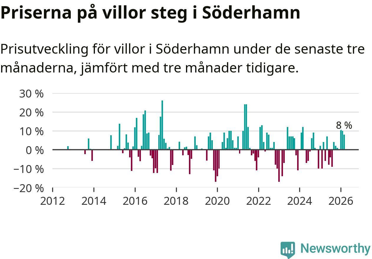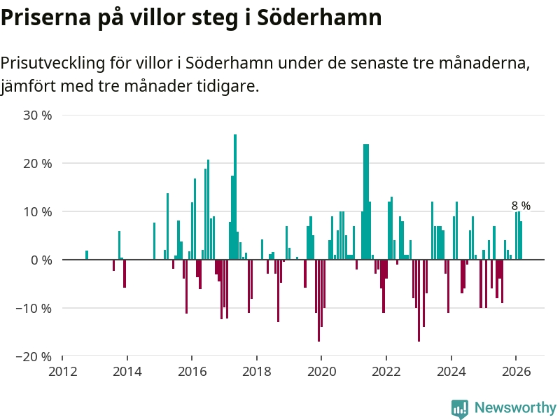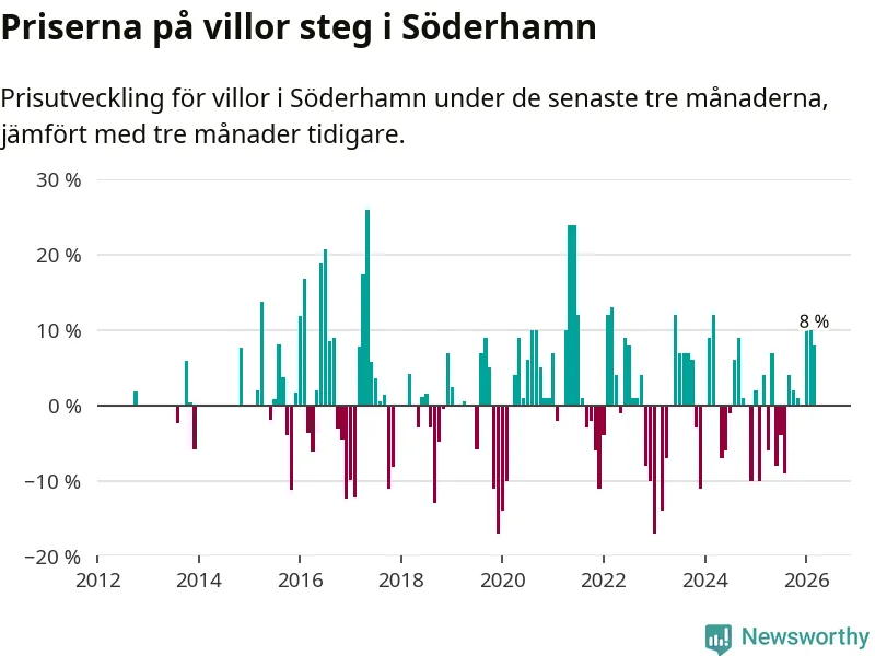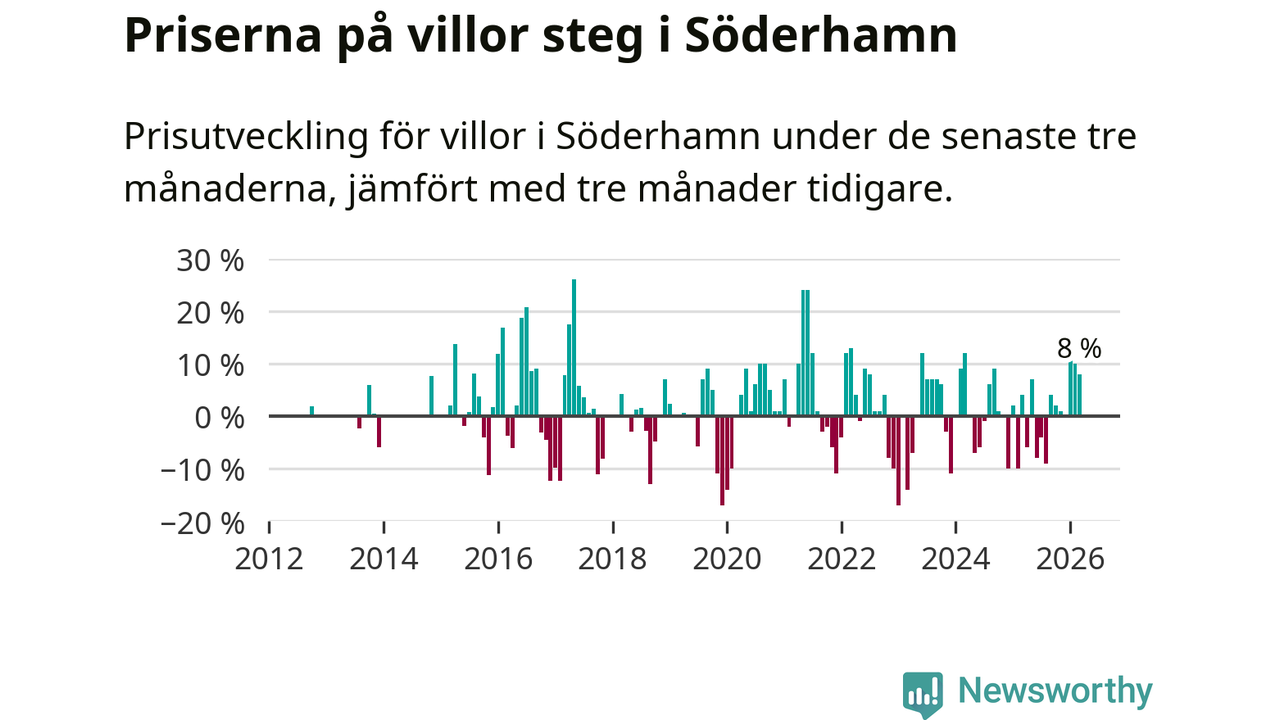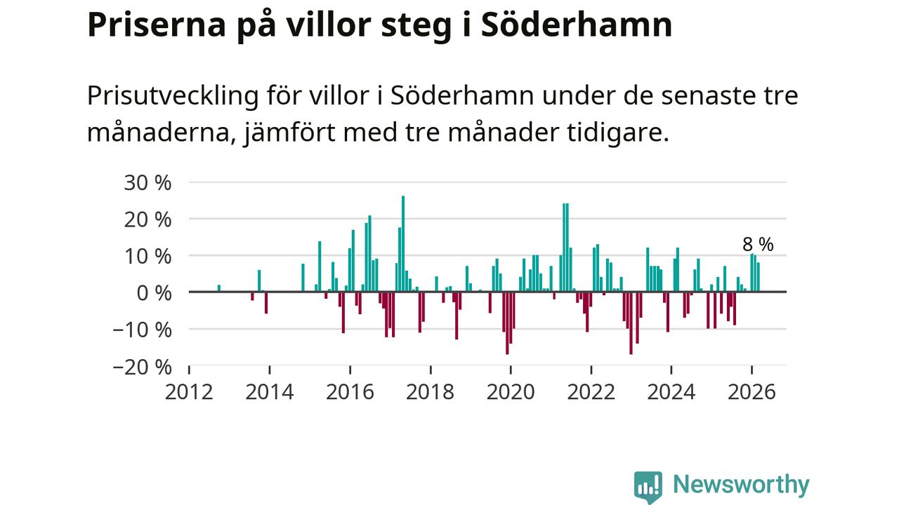 Villapriserna har gått upp i Söderhamns kommun. Medelpriset på försäljningarna under de senaste tre månaderna visar på en uppgång med 8 procent.