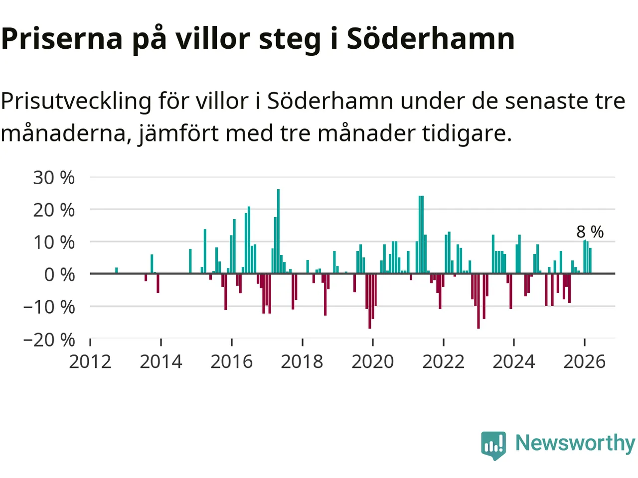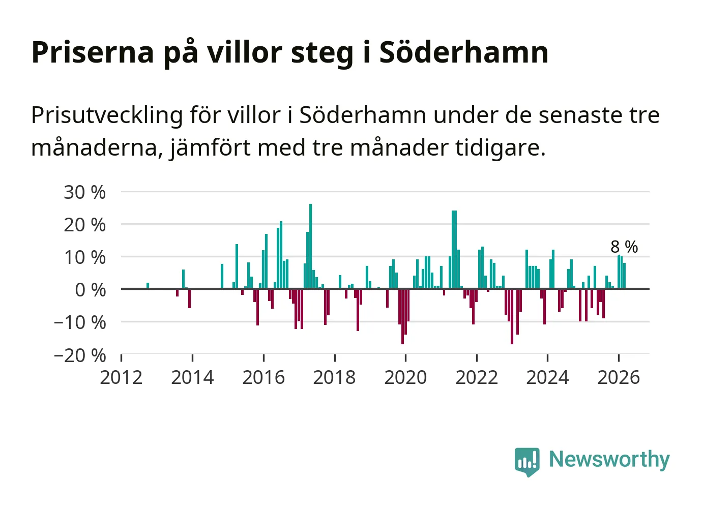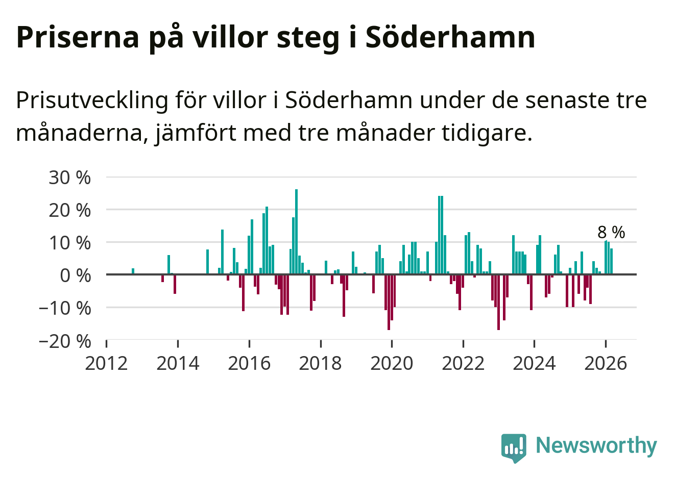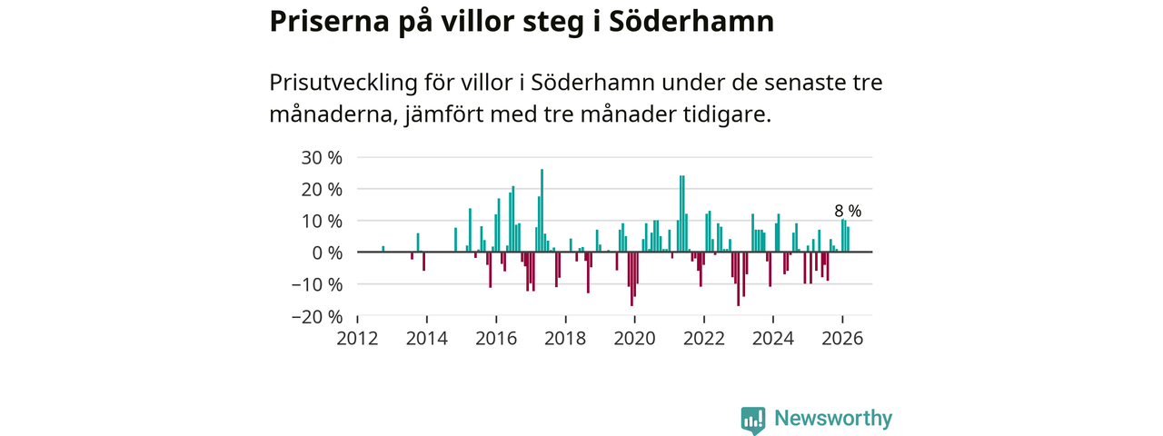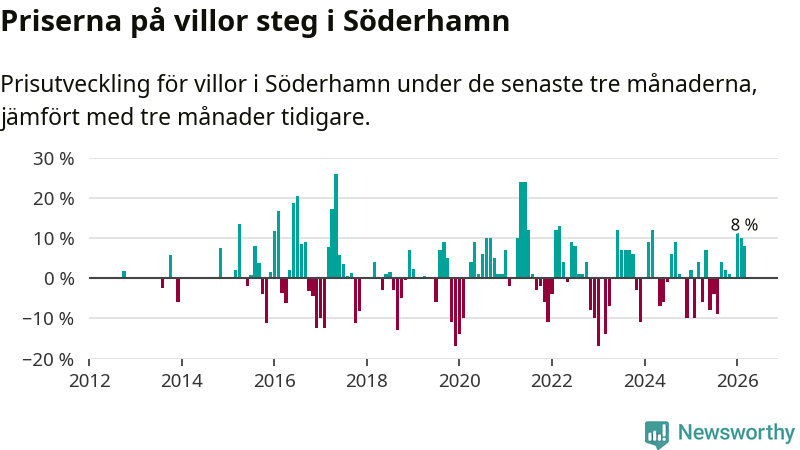 Villapriserna har gått upp i Söderhamns kommun. Medelpriset på försäljningarna under de senaste tre månaderna visar på en uppgång med 8 procent.