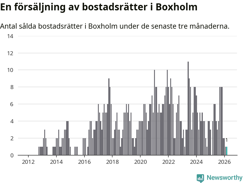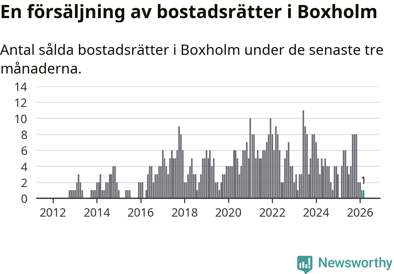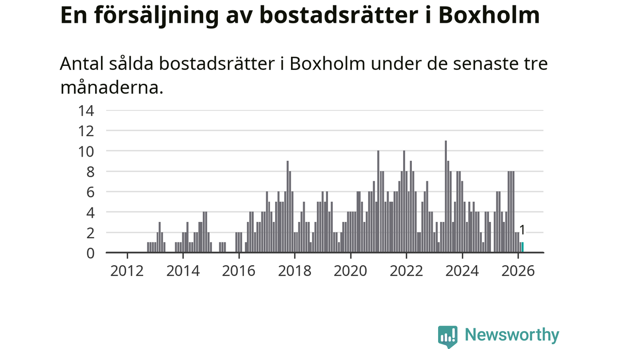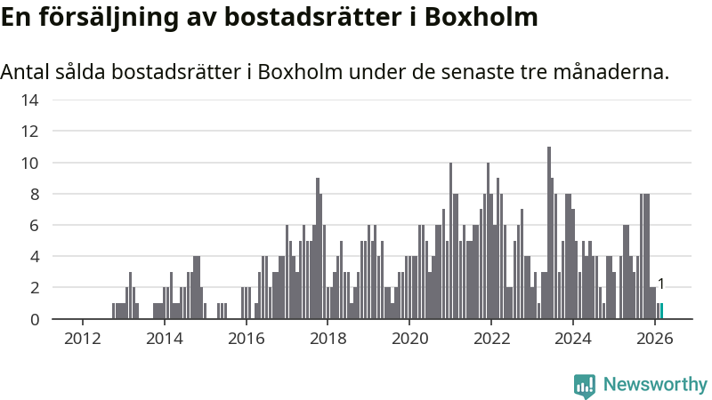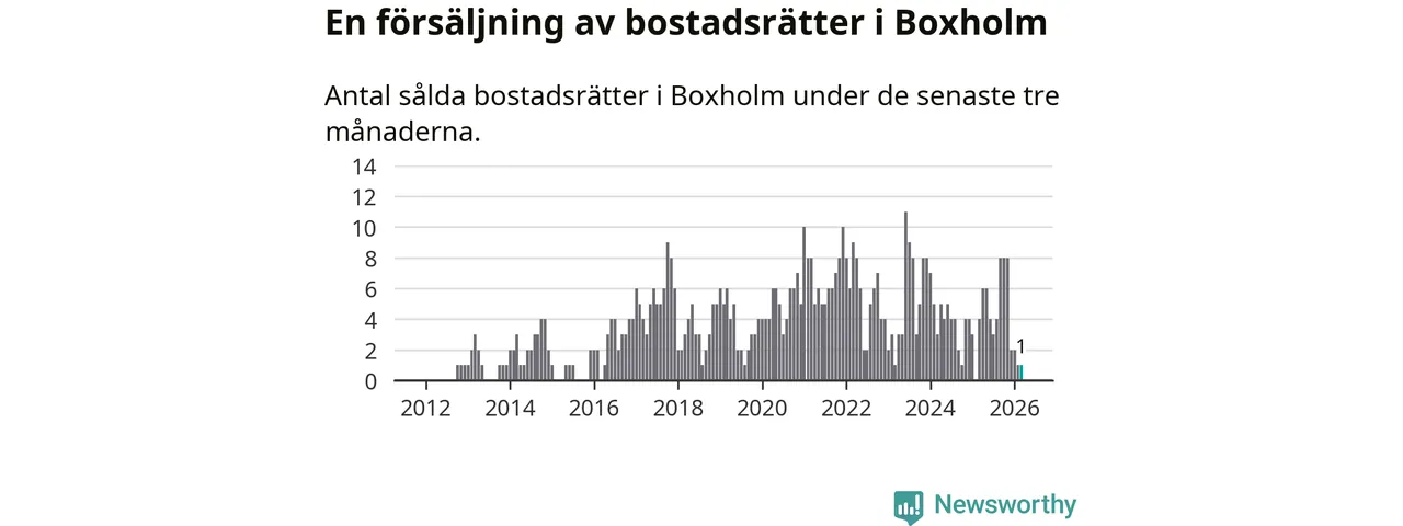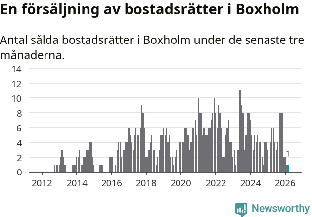 Mellan januari och mars gjordes sammanlagt en affär med bostadsrätter i Boxholms kommun. Det kan jämföras med fyra vid motsvarande tid i fjol.