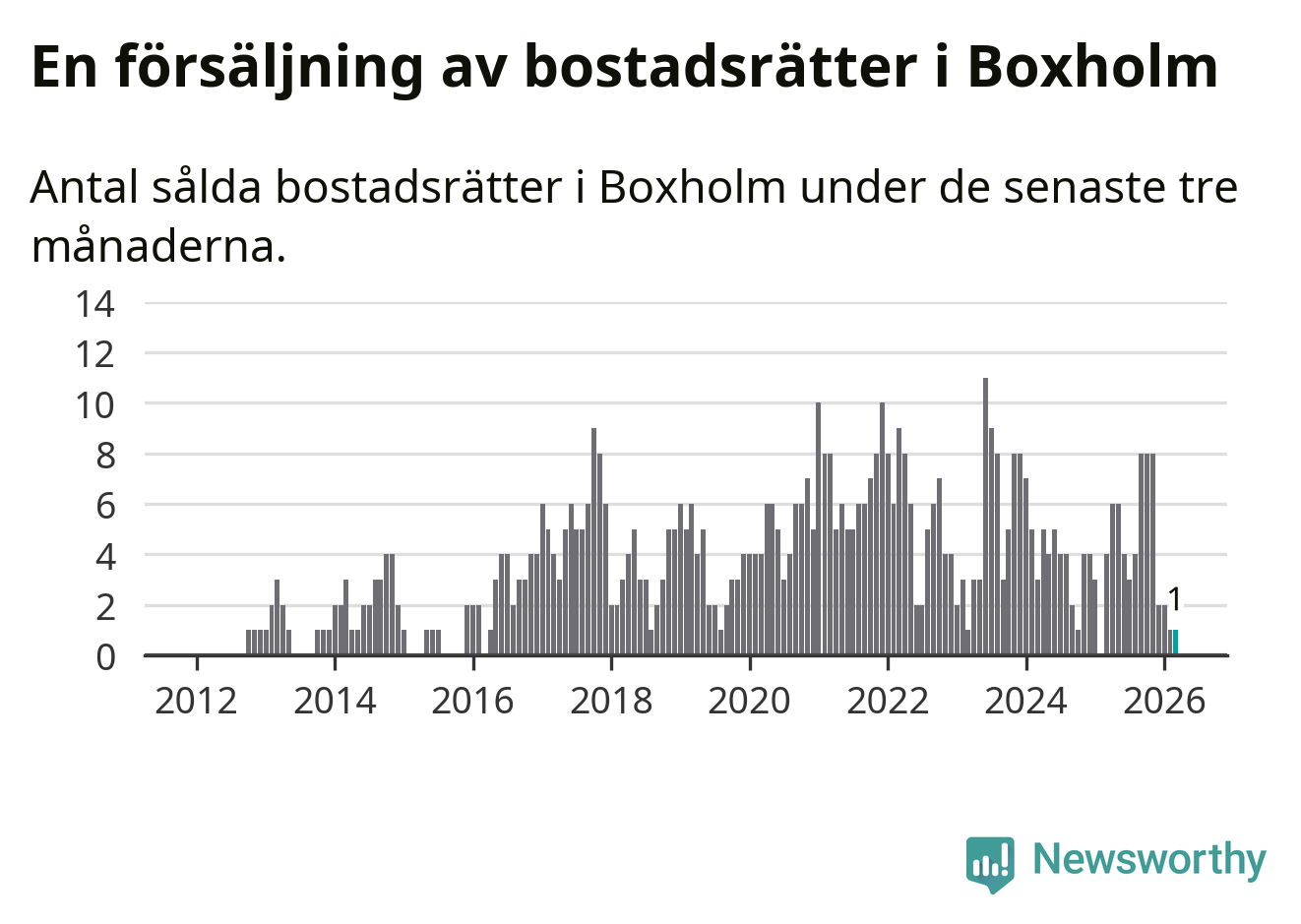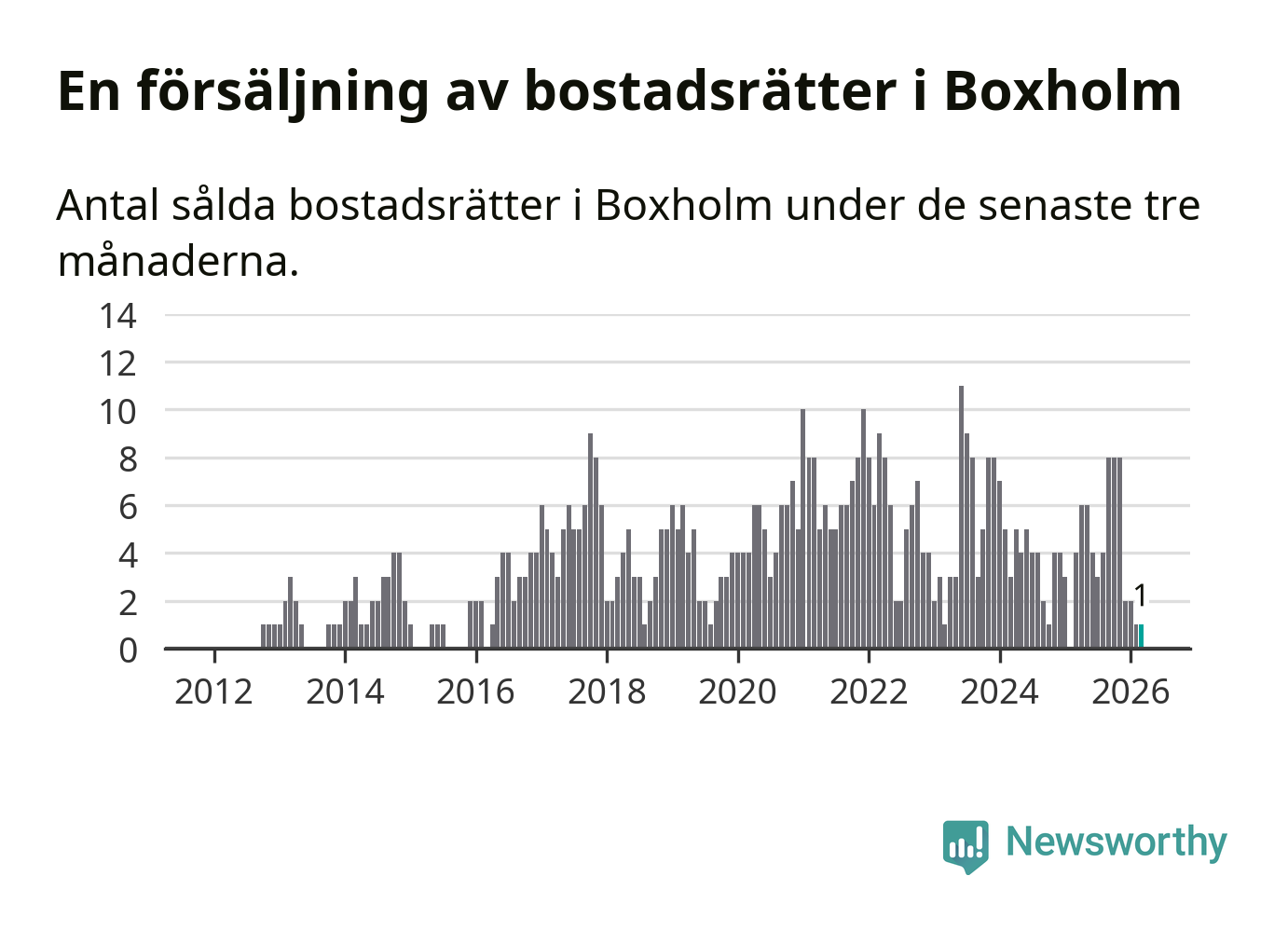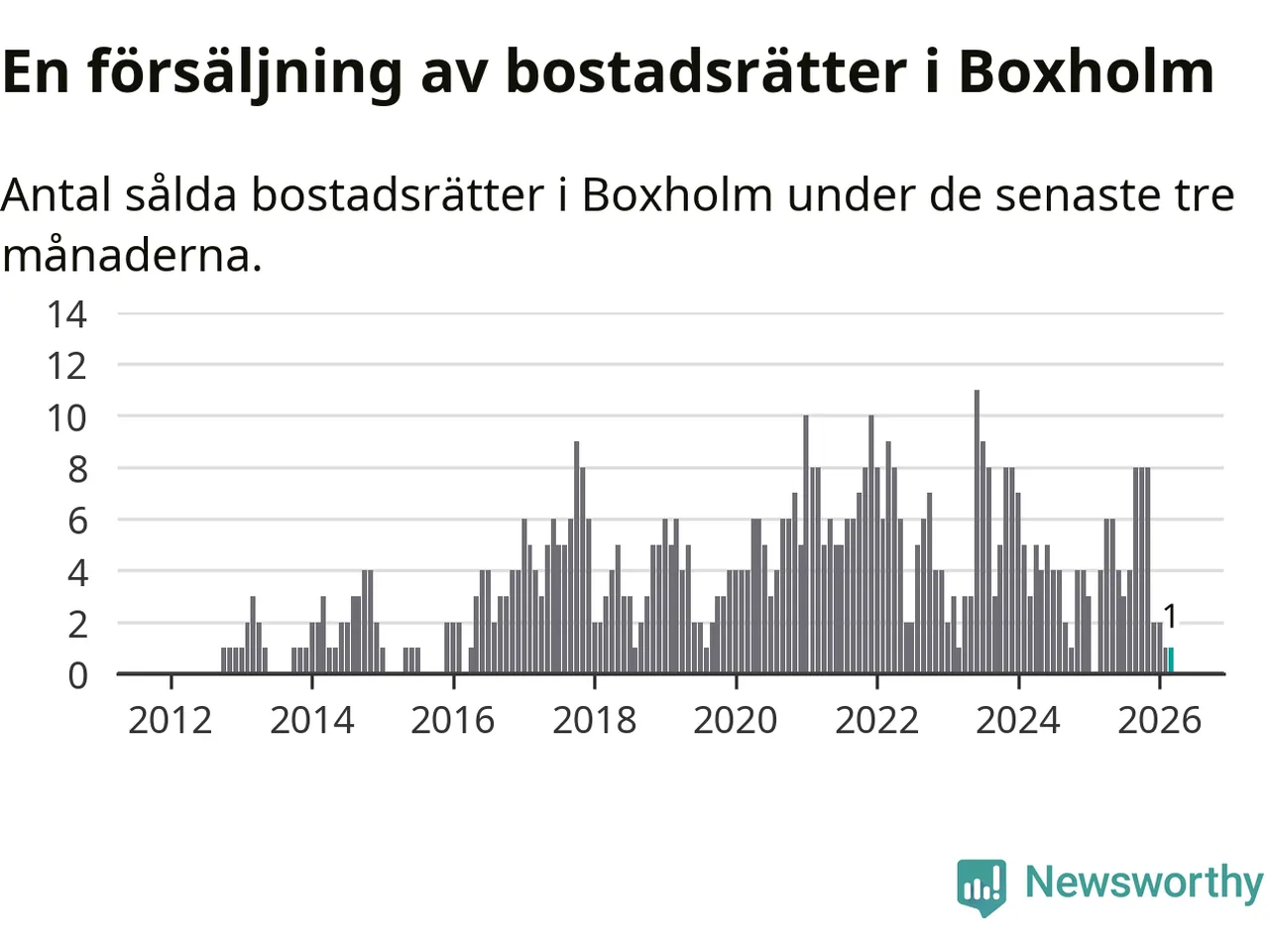 Mellan januari och mars gjordes sammanlagt en affär med bostadsrätter i Boxholms kommun. Det kan jämföras med fyra vid motsvarande tid i fjol.