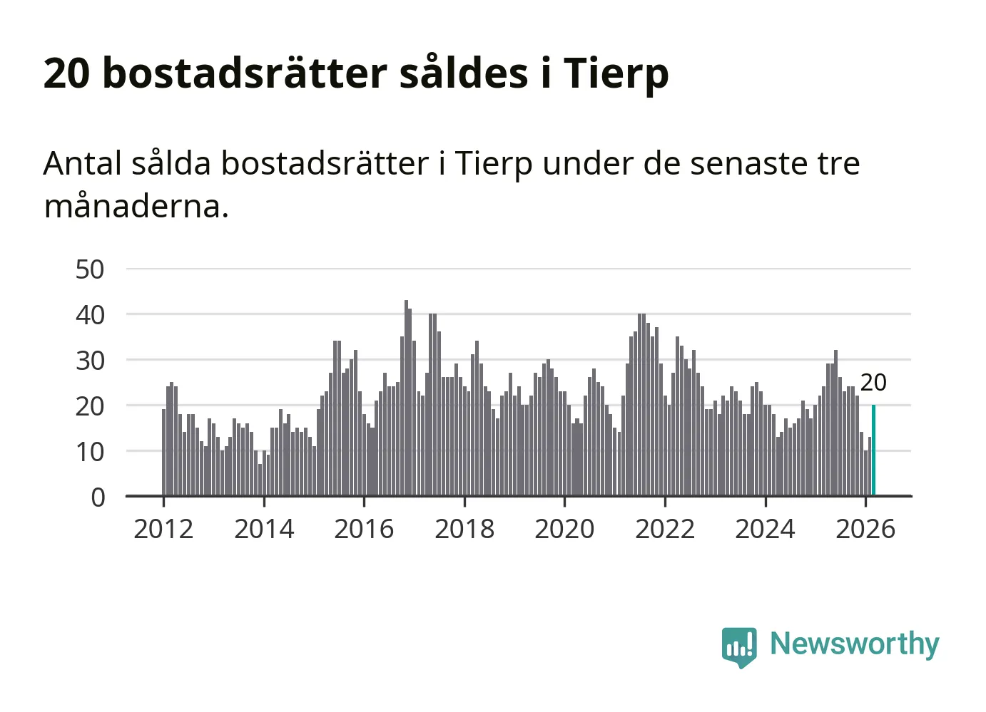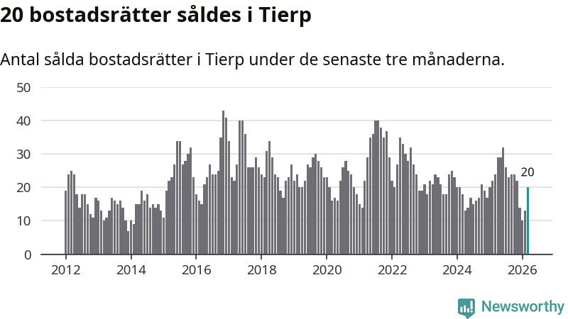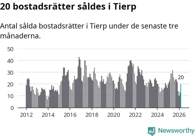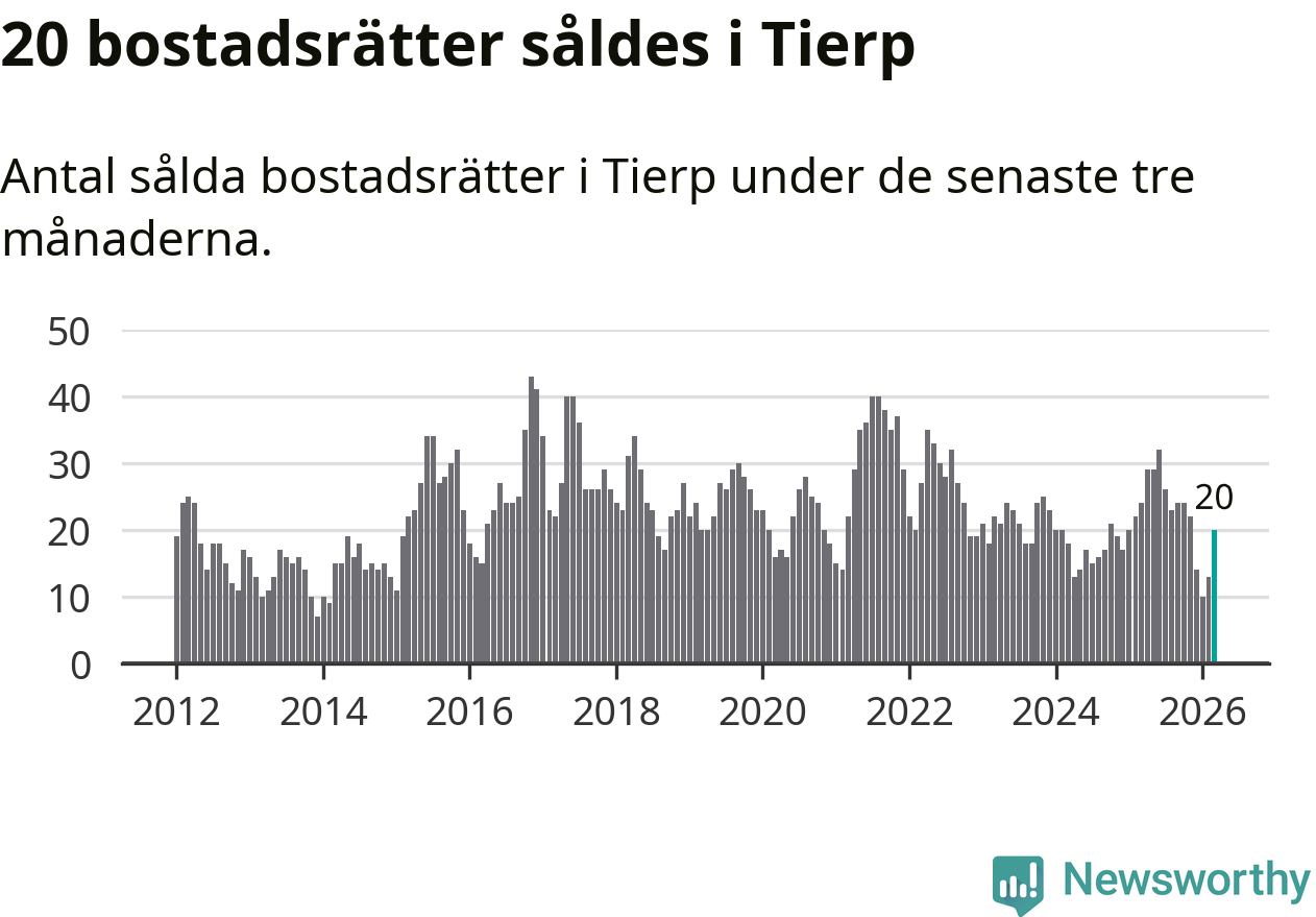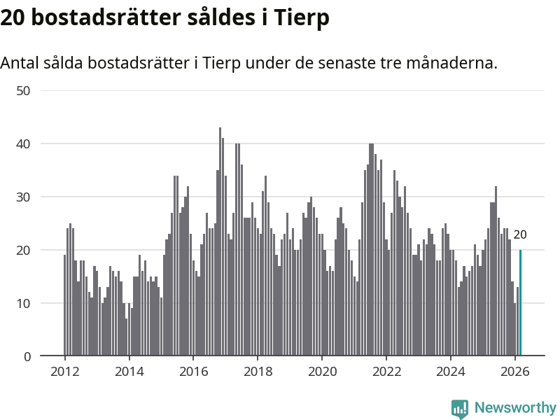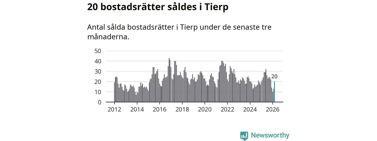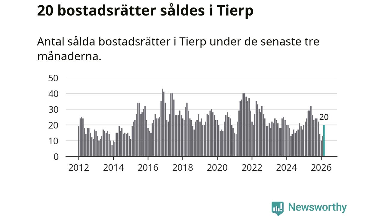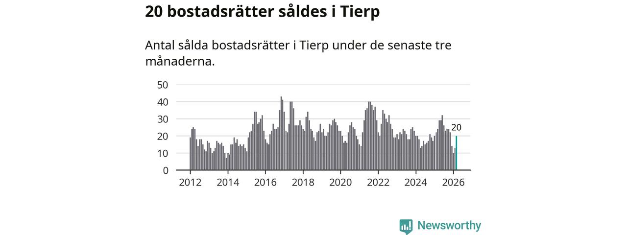 Mellan januari och mars gjordes sammanlagt 20 affärer med bostadsrätter i Tierps kommun. Det kan jämföras med 24 vid motsvarande tid i fjol.