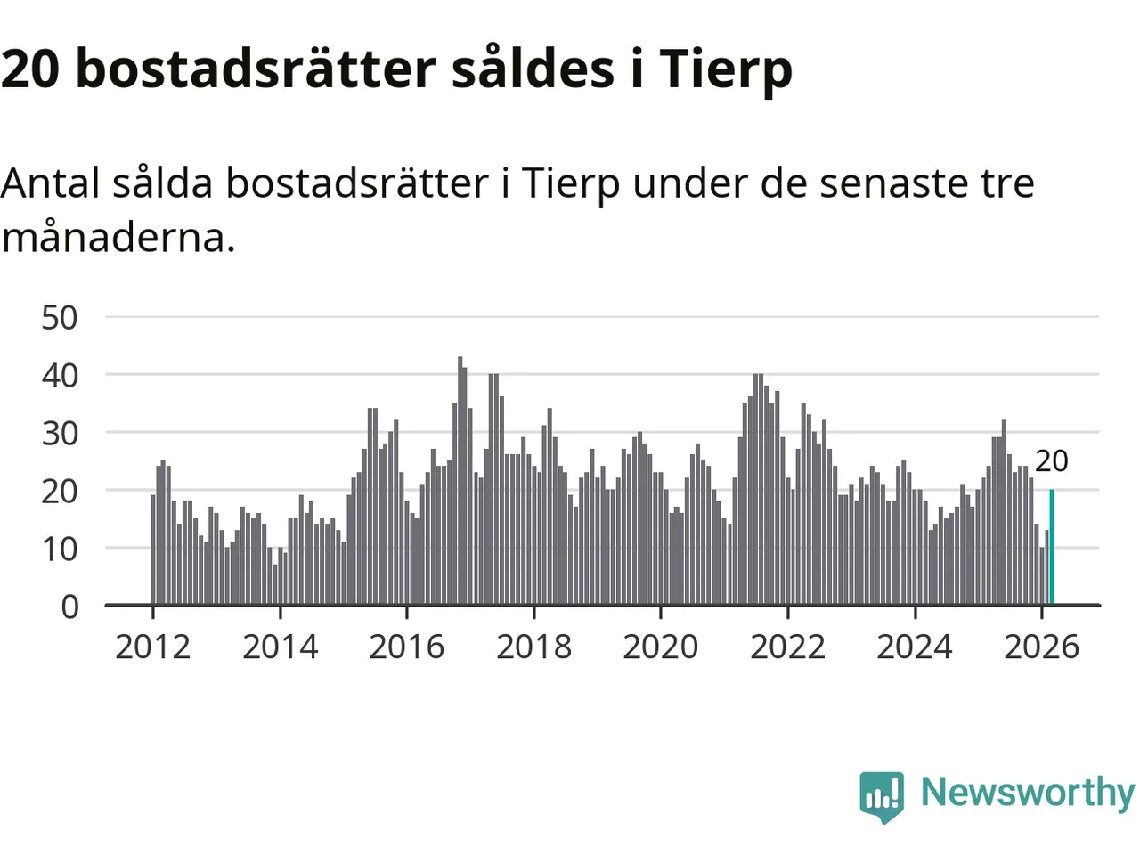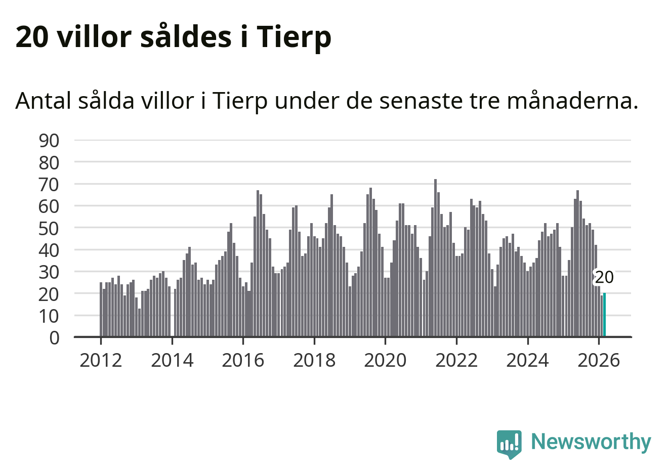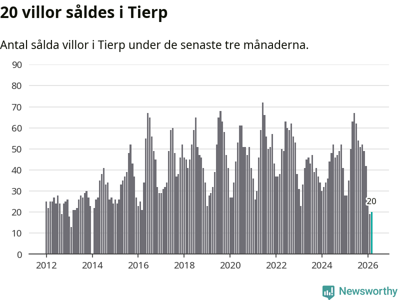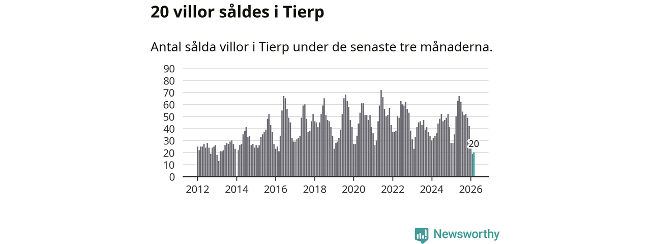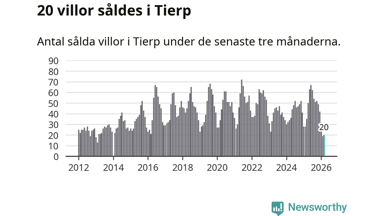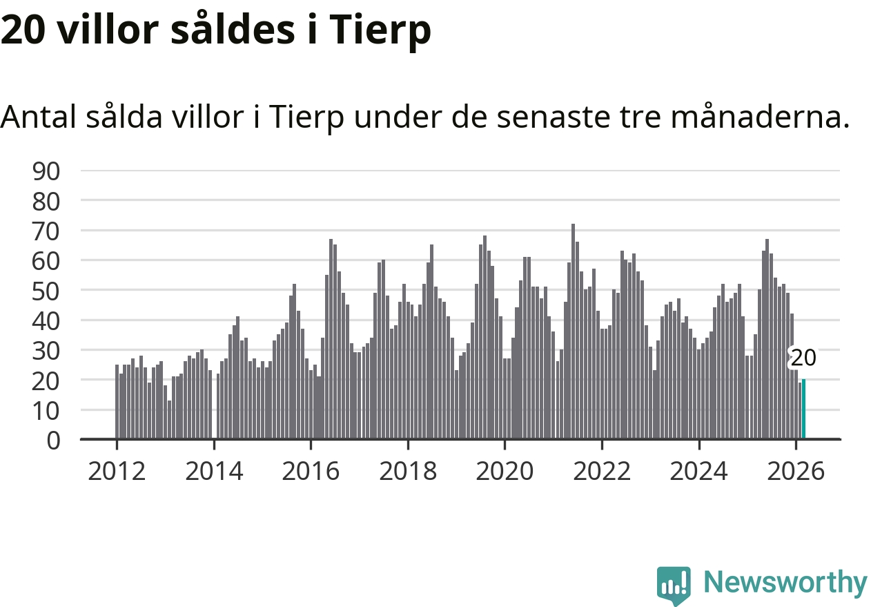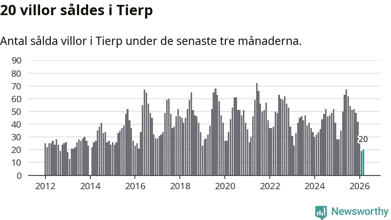 Mellan januari och mars såldes 20 villor i Tierps kommun. Det är relativt få sett till aktiviteten på bostadsmarknaden i kommunen under de senaste tolv månaderna, samt det historiska snittet för den här tiden på året.