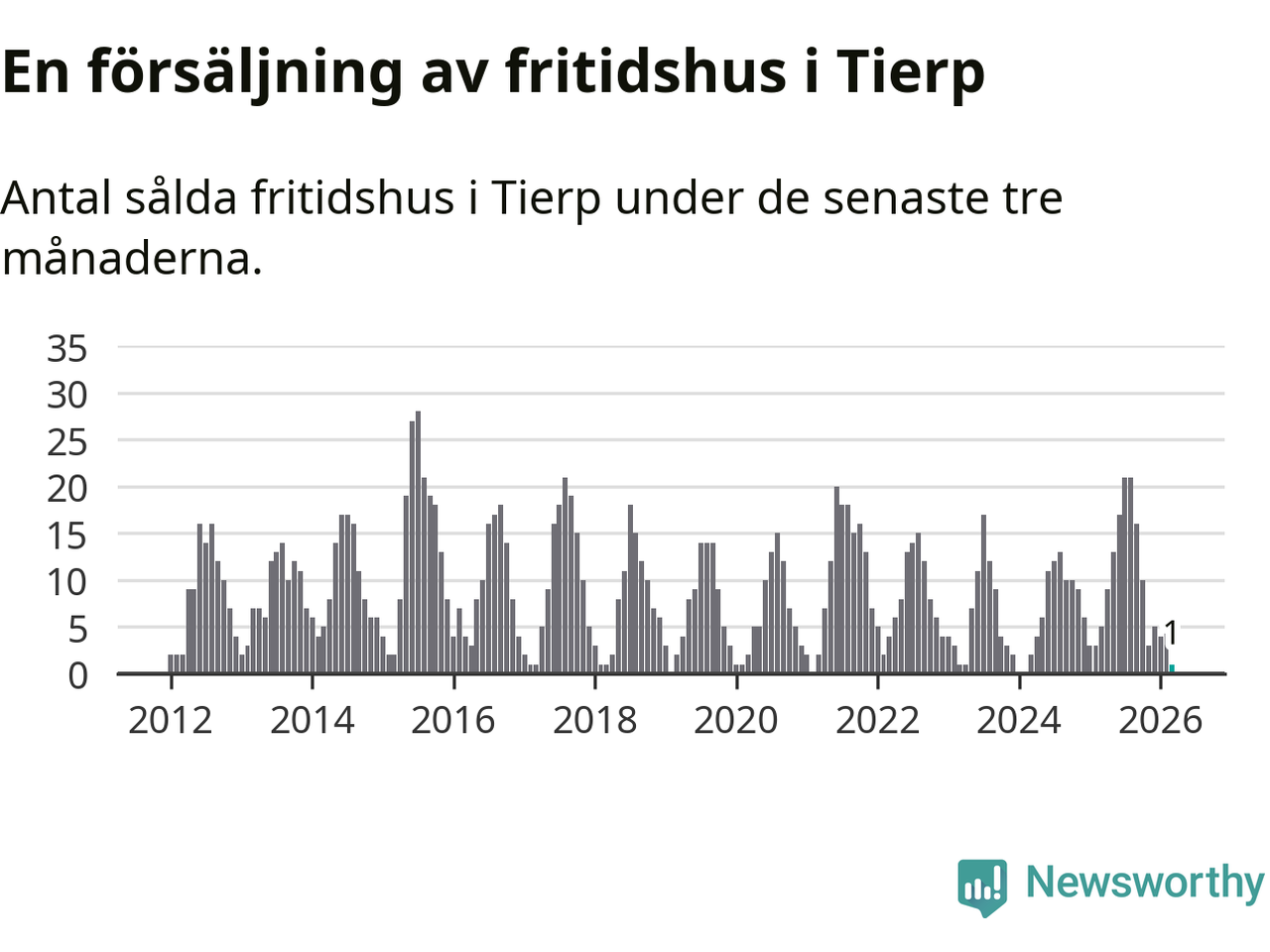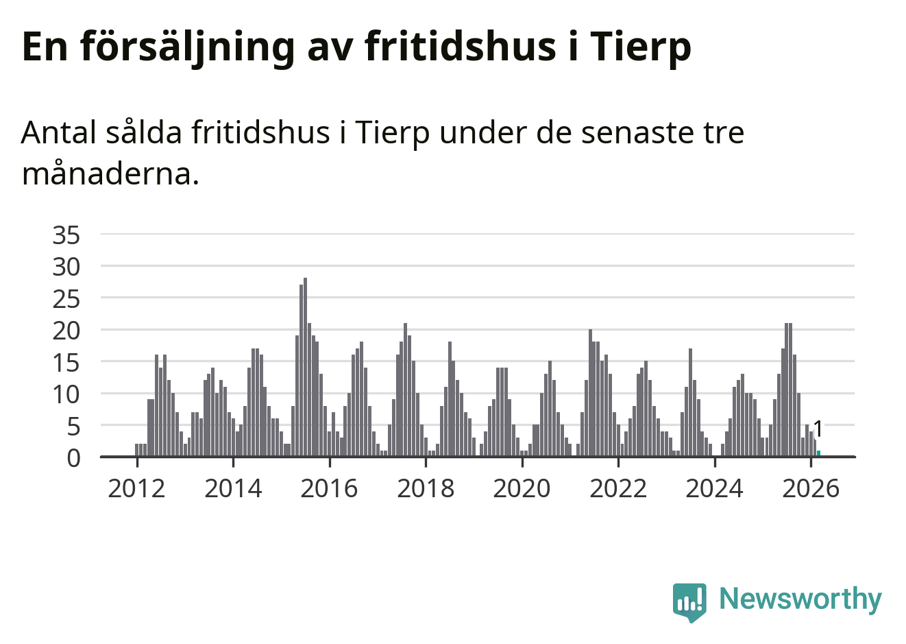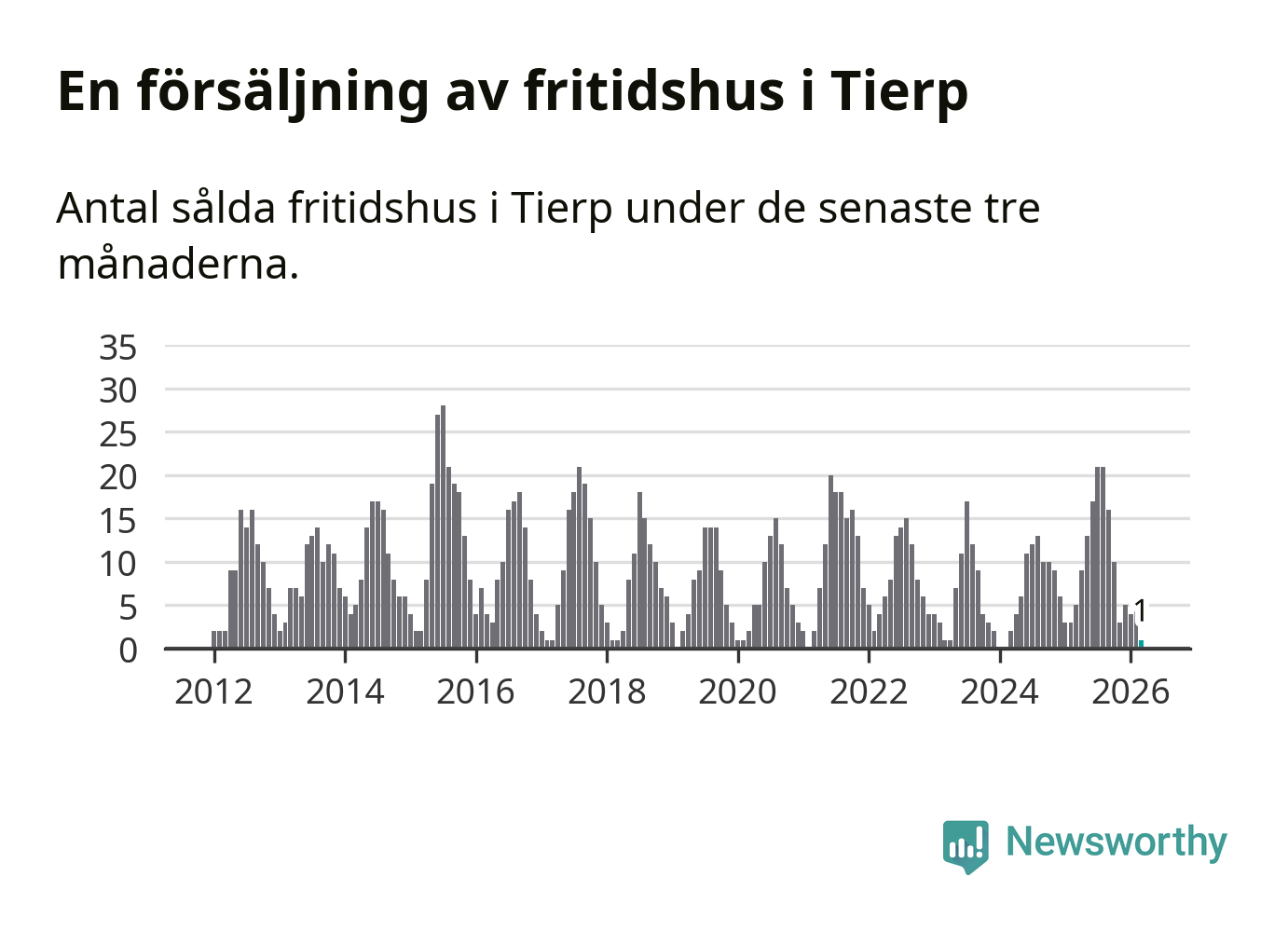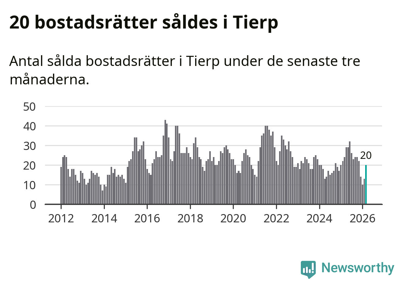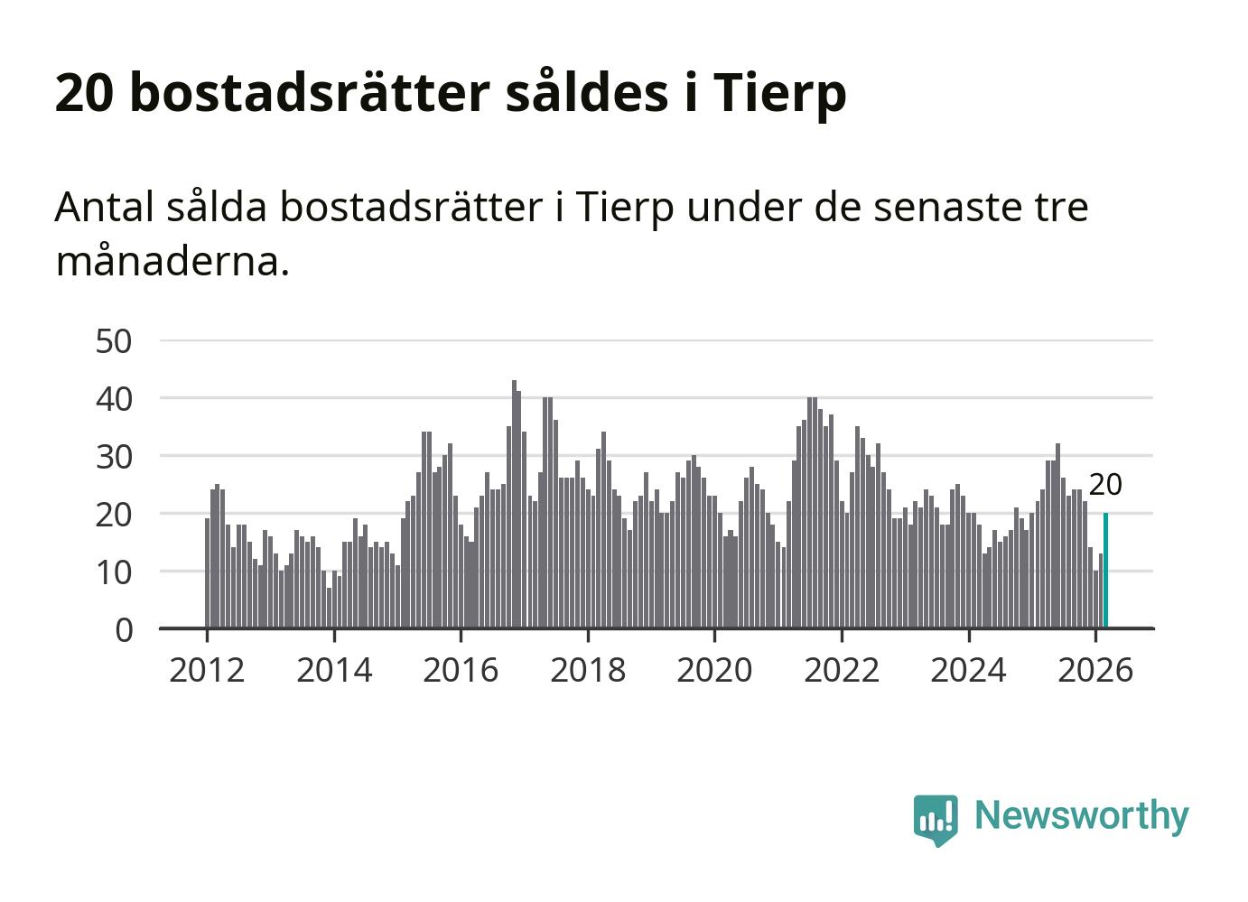 Mellan januari och mars såldes 20 villor i Tierps kommun. Det är relativt få sett till aktiviteten på bostadsmarknaden i kommunen under de senaste tolv månaderna, samt det historiska snittet för den här tiden på året.