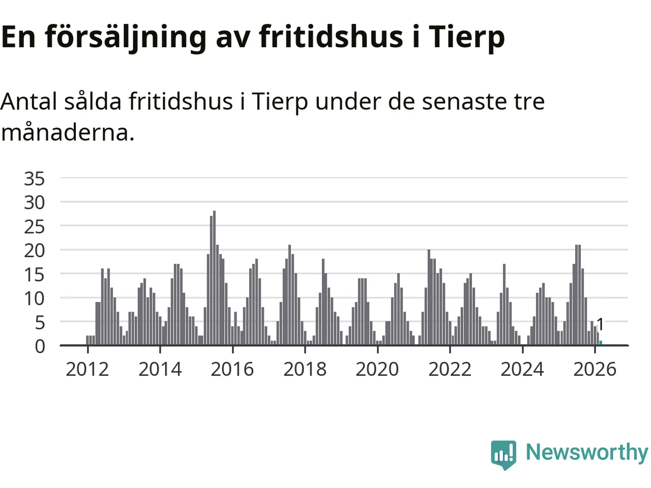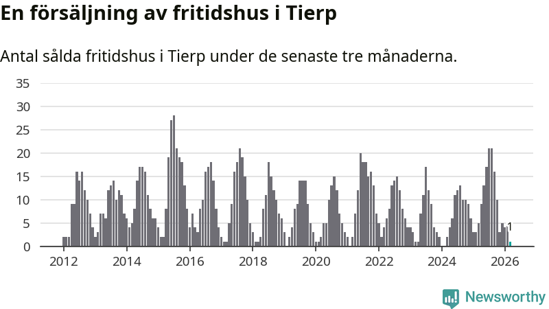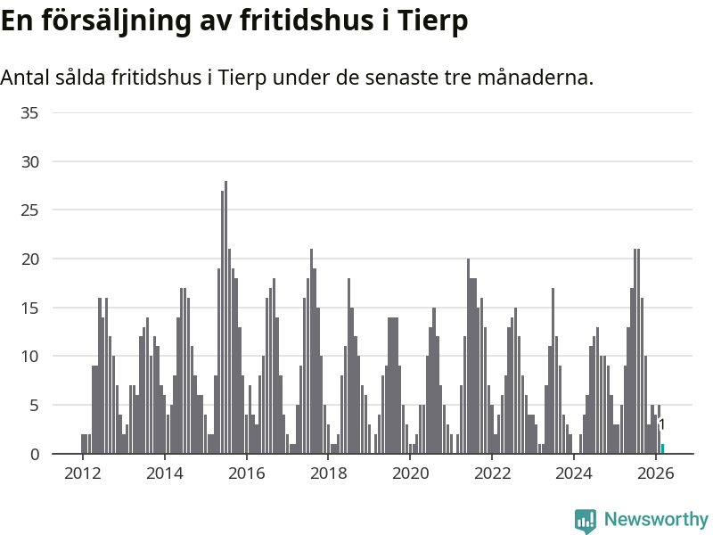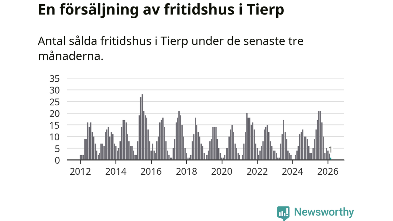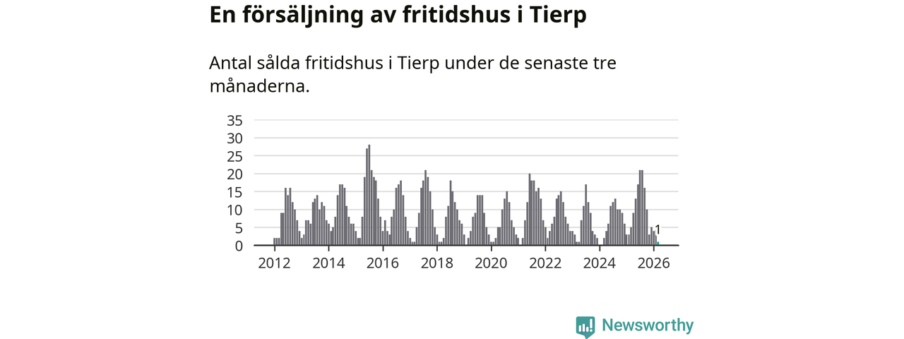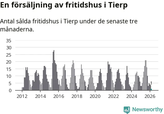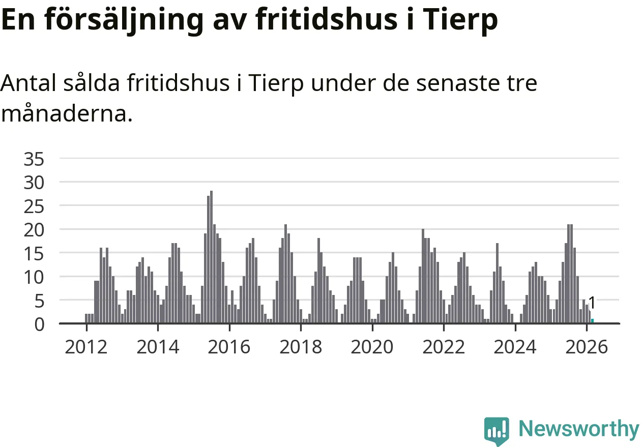 Sammanlagt såldes ett fritidshus i Tierps kommun mellan januari och mars till ett genomsnittligt pris på 1,2 miljoner kronor. I fjol gjordes fem affärer vid den här tiden på året.