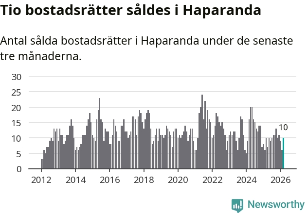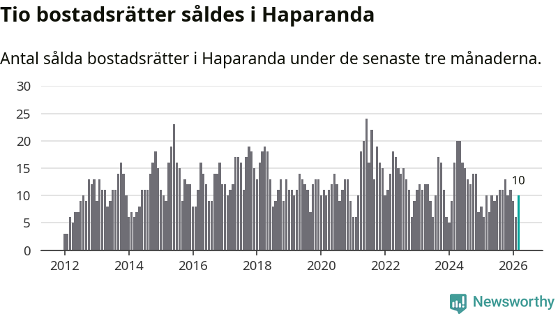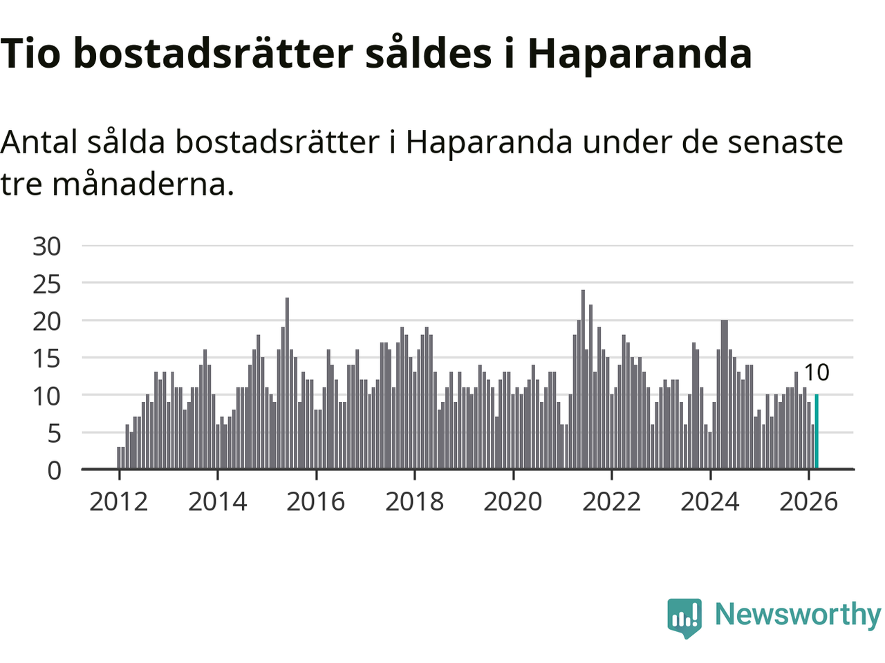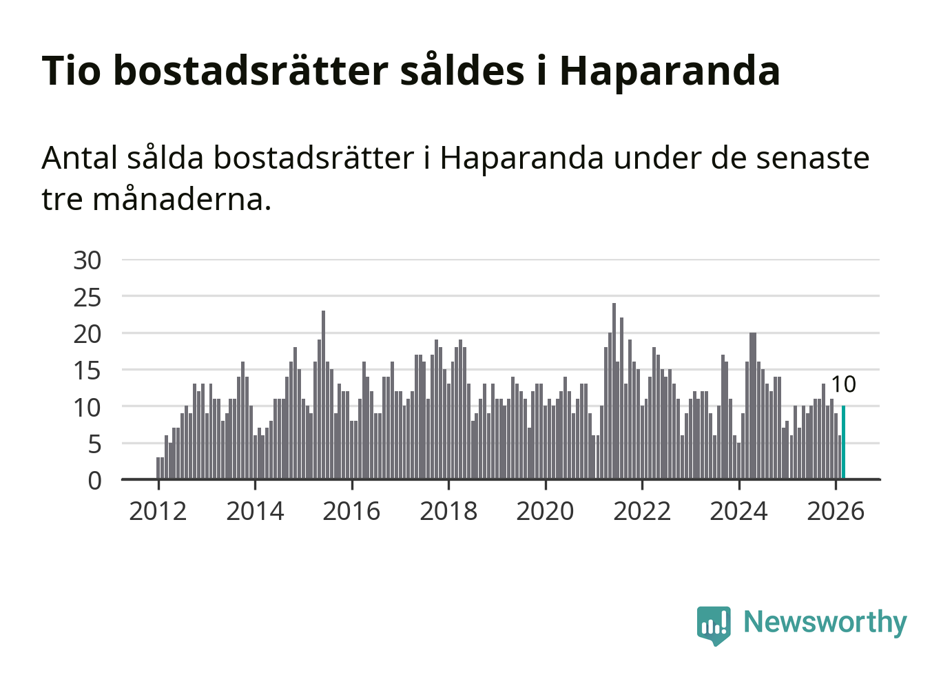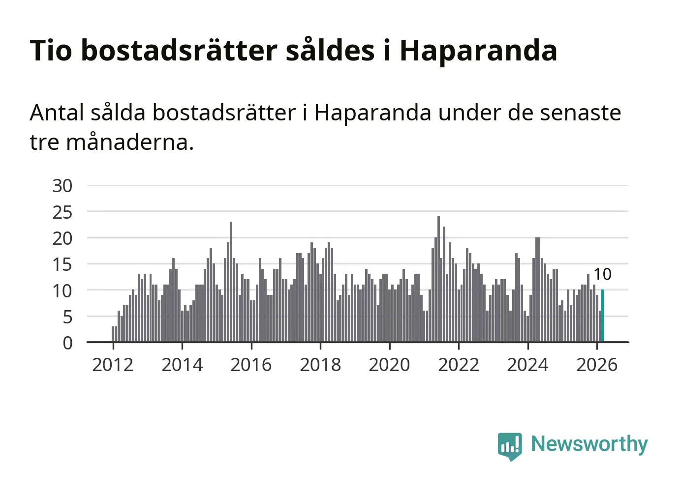 Mellan januari och mars gjordes sammanlagt tio affärer med bostadsrätter i Haparanda kommun. Det är lika många affärer som vid motsvarande tid i fjol.