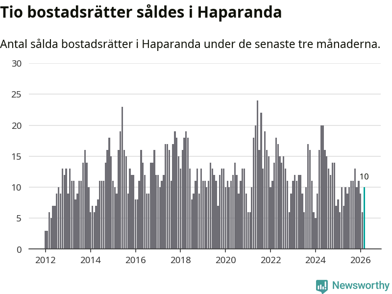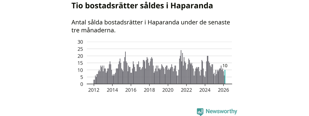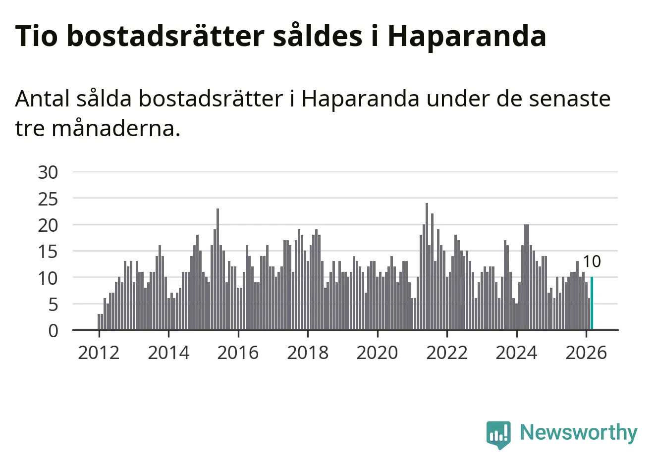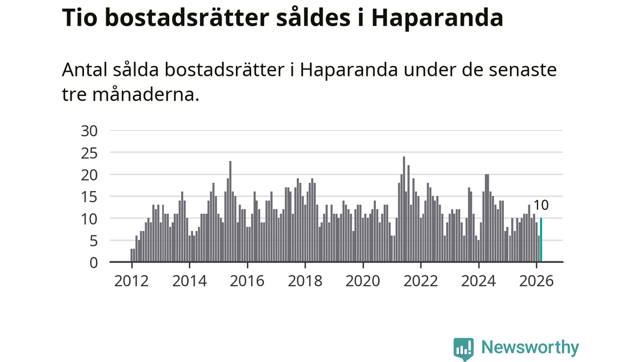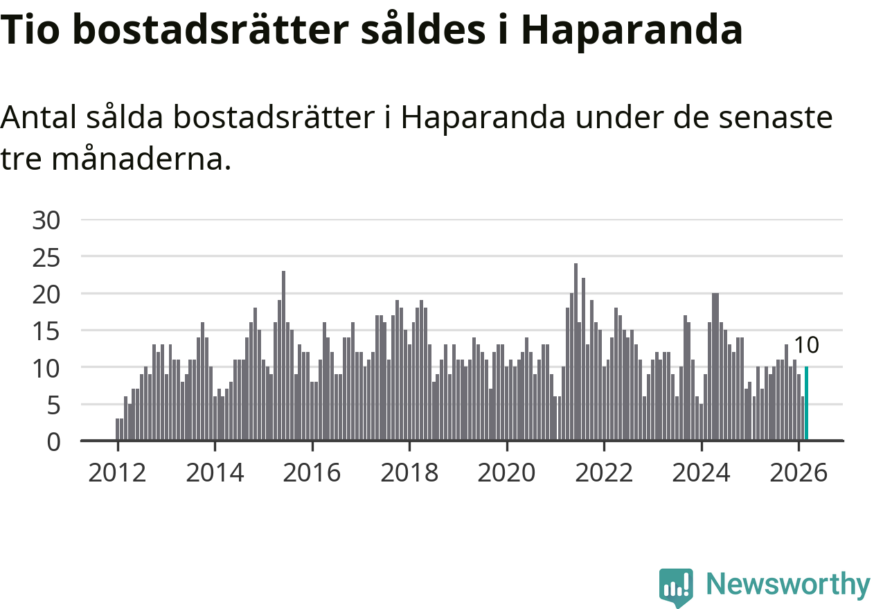 Mellan januari och mars gjordes sammanlagt tio affärer med bostadsrätter i Haparanda kommun. Det är lika många affärer som vid motsvarande tid i fjol.